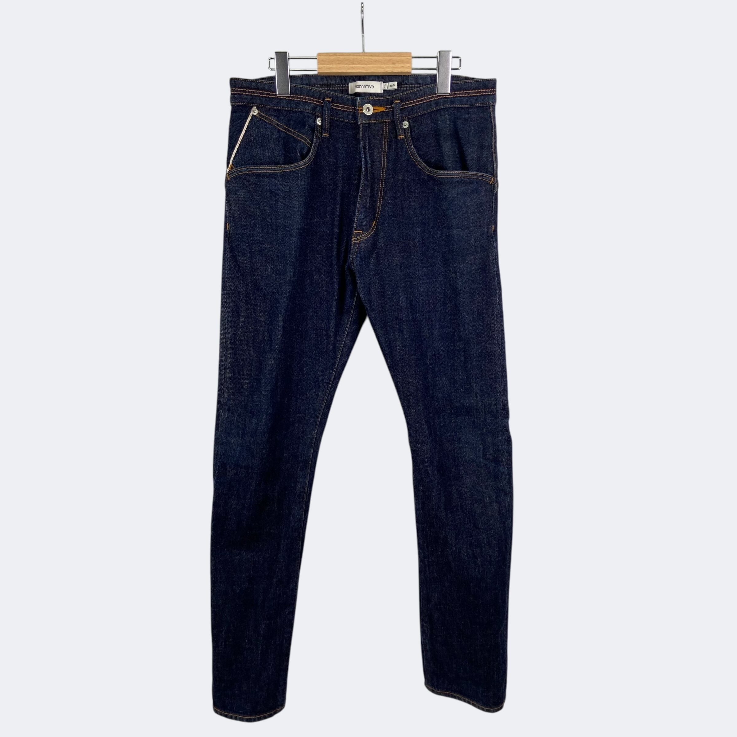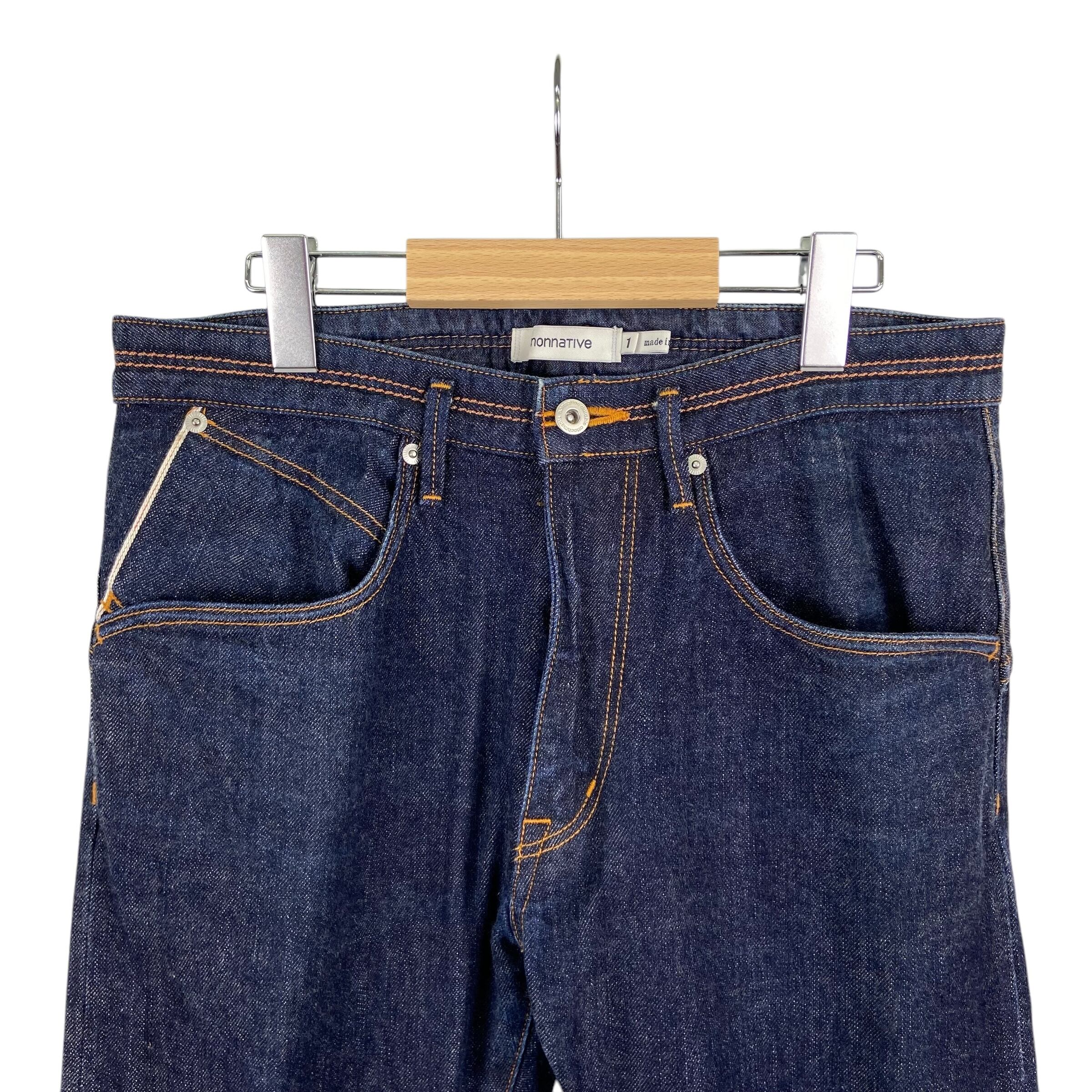 ノンネイティブのストレートシルエットデニム。膝裏にダーツが入るため、きれいなシルエットが保たれる仕様になります。12オンスのセルビッジデニムを使用した5ポケット仕様になり、コインポケットにも赤耳が出されています。パターンや縫製などノンネイティブらしいこだわりが詰め込まれた1着です。