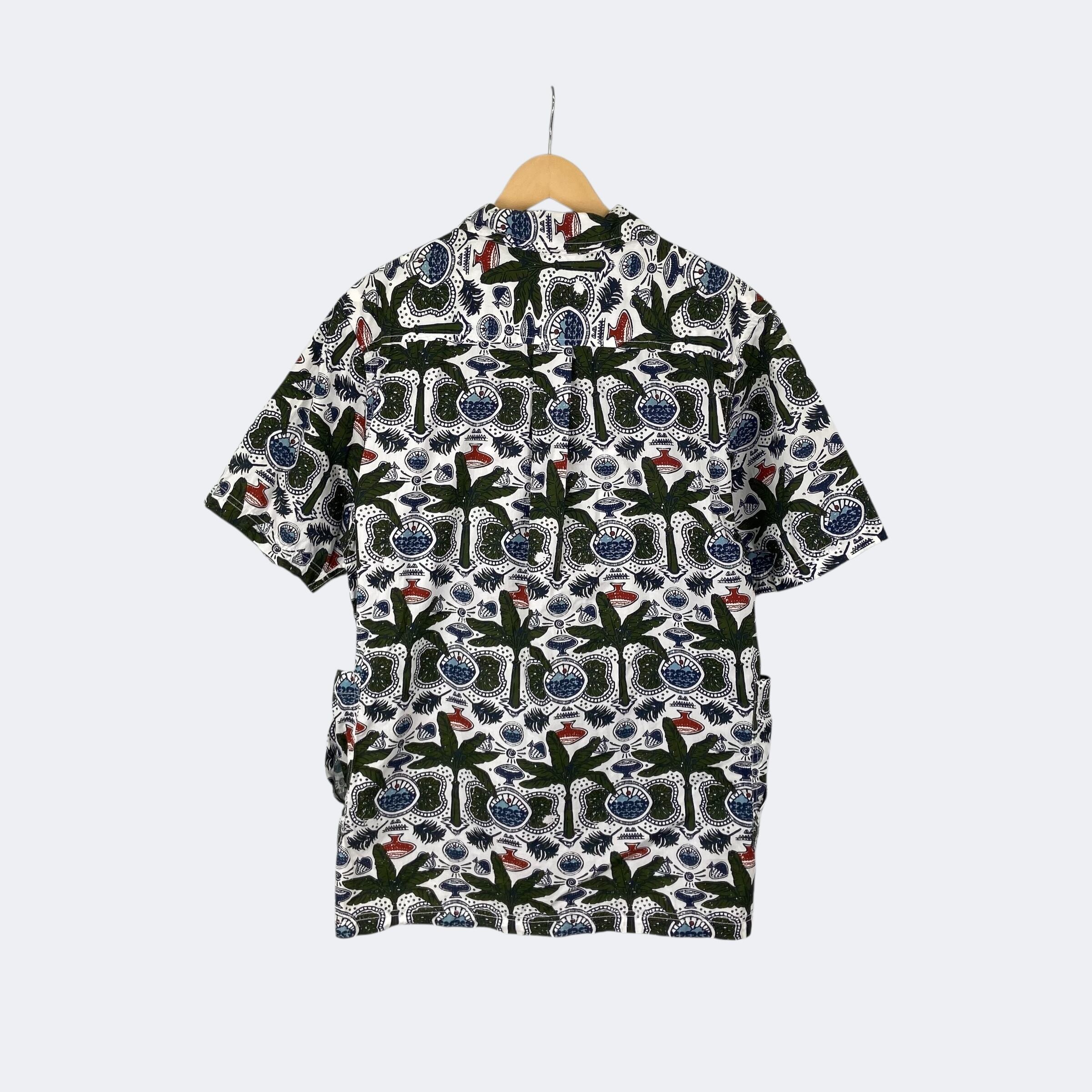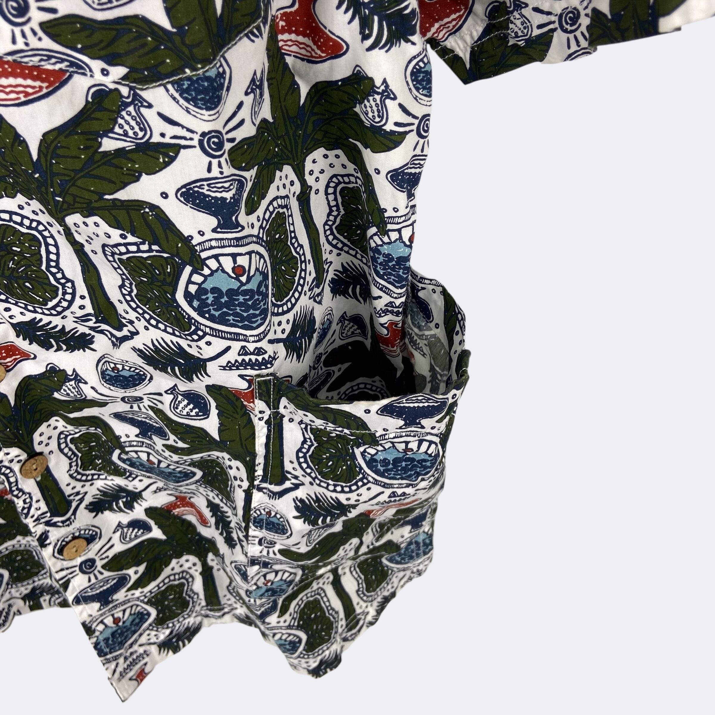 ヤシボタンと総柄が映えるカブーのオープンカラーシャツになります。左胸にはポケット、両サイド側にもハンドポケットが付いています。背面パネルには動きやすいボックスプリーツを備えています。裾部分はサイドベンツが付いたストレート形状になります。
