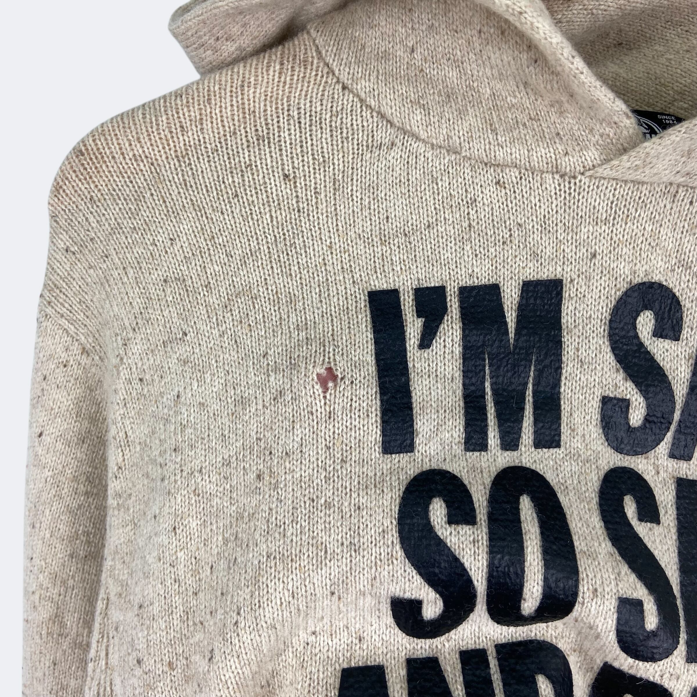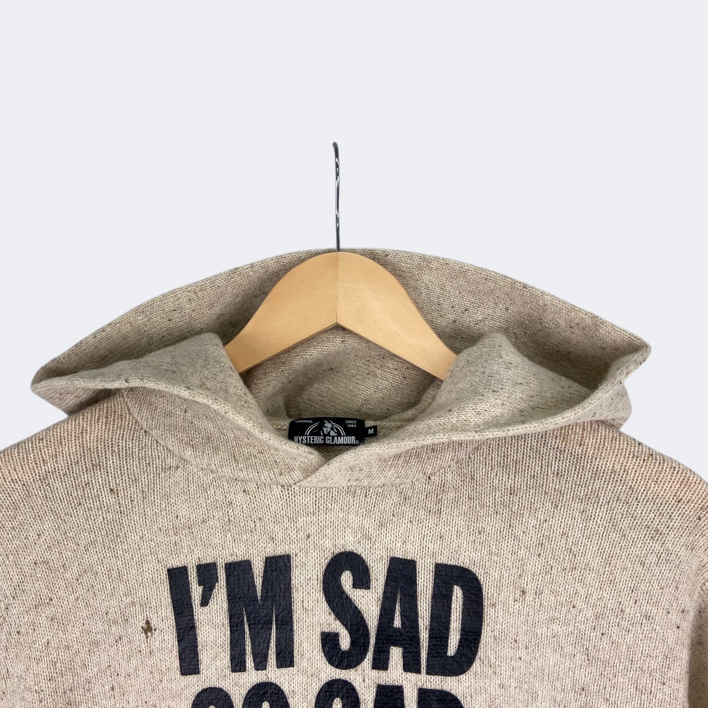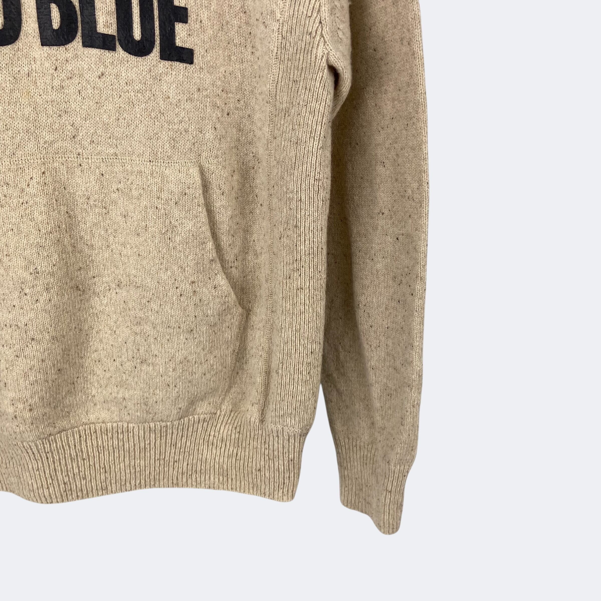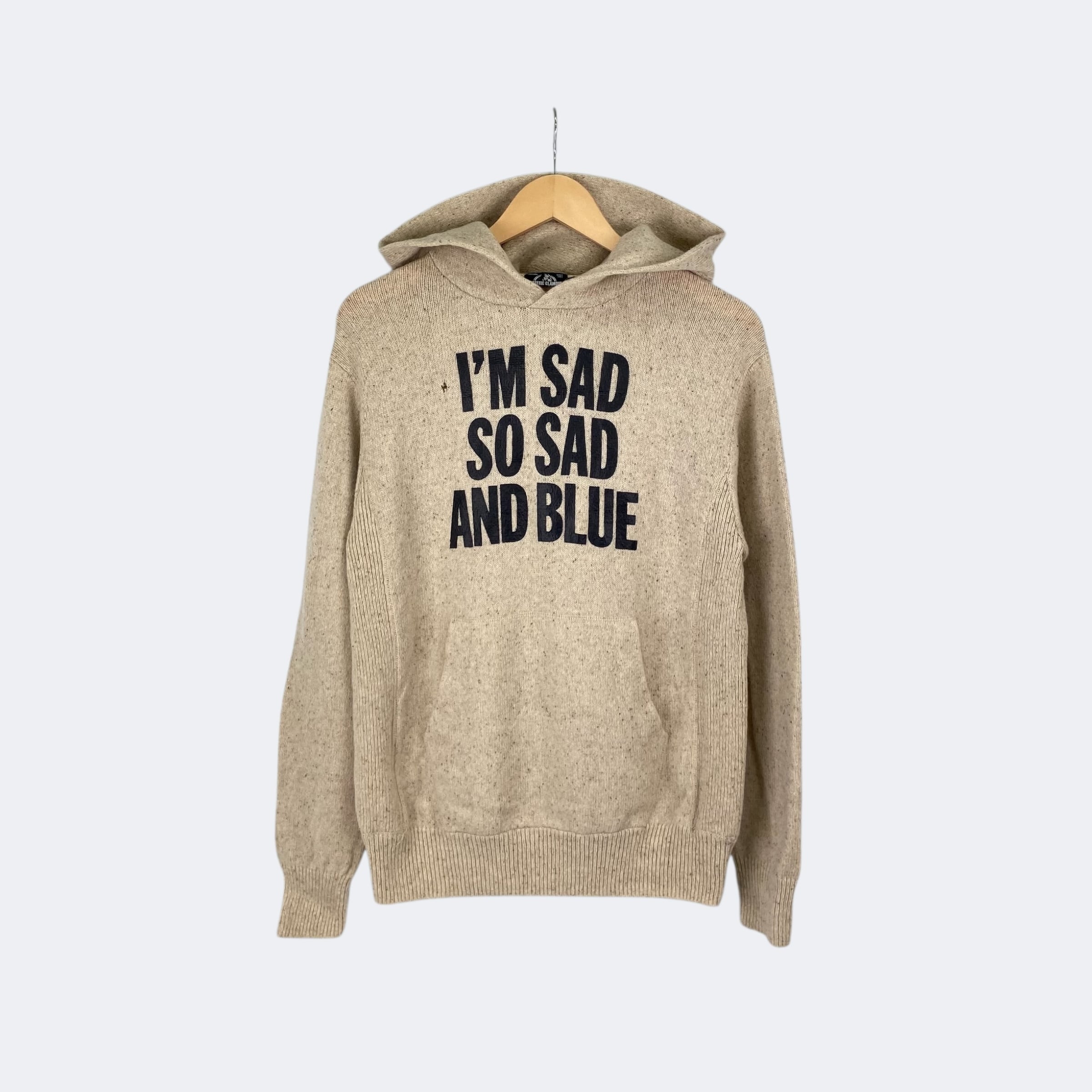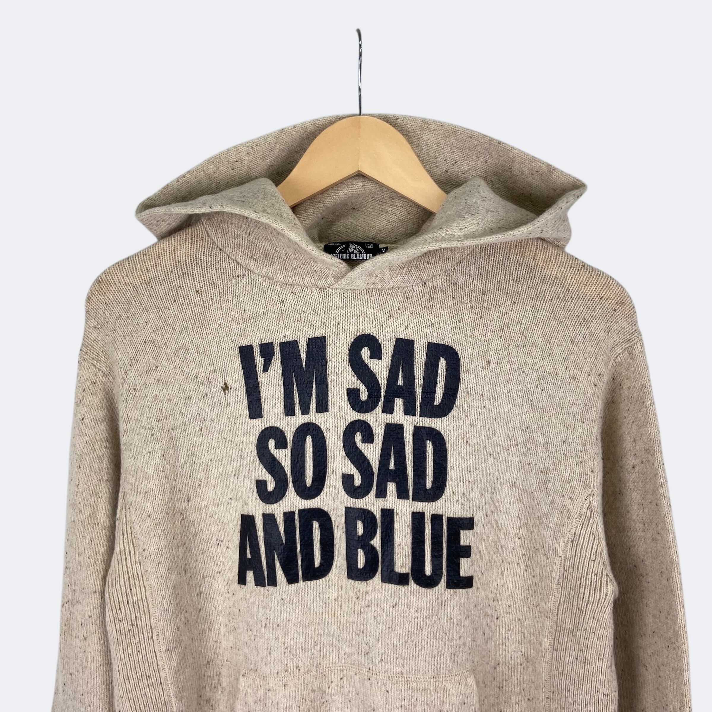 ウール&ナイロンのニット素材を使用したヒステリックグラマーのプルオーバーパーカーになります。フロントに「I'M SAD SO SAD AND BLUE」の文字がプリントされています。デニムやチノ、ミリタリーパンツやスウェットパンツといったカジュアルな一本から、上品なスラックスまで、合わせるボトムスを選ばずコーディネートできるアイテムです。