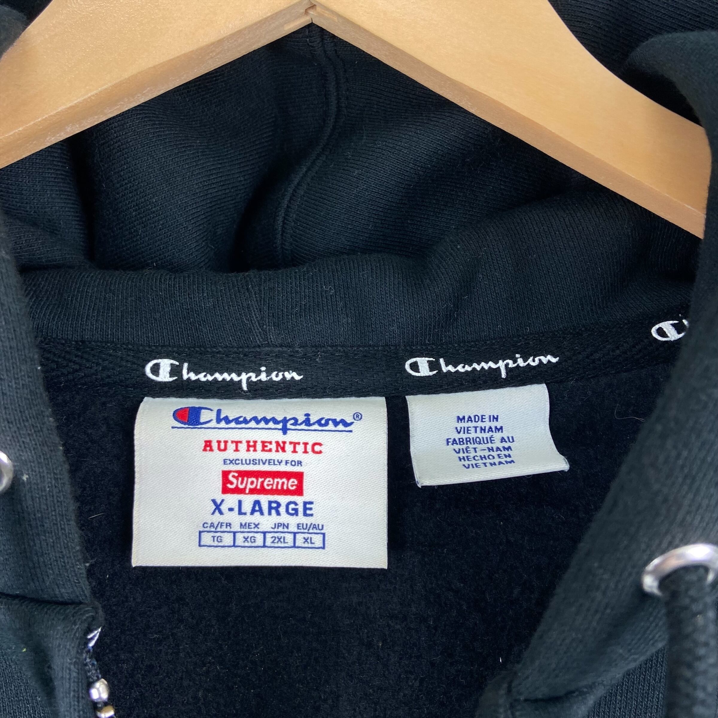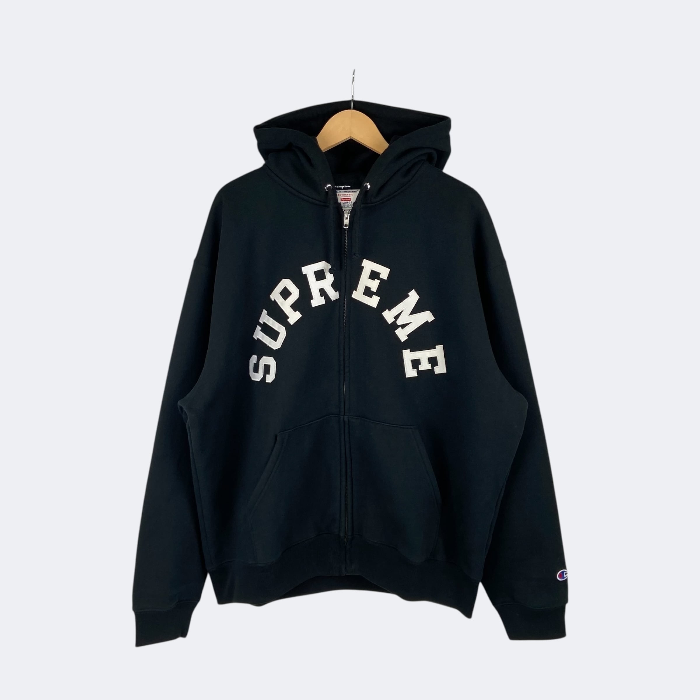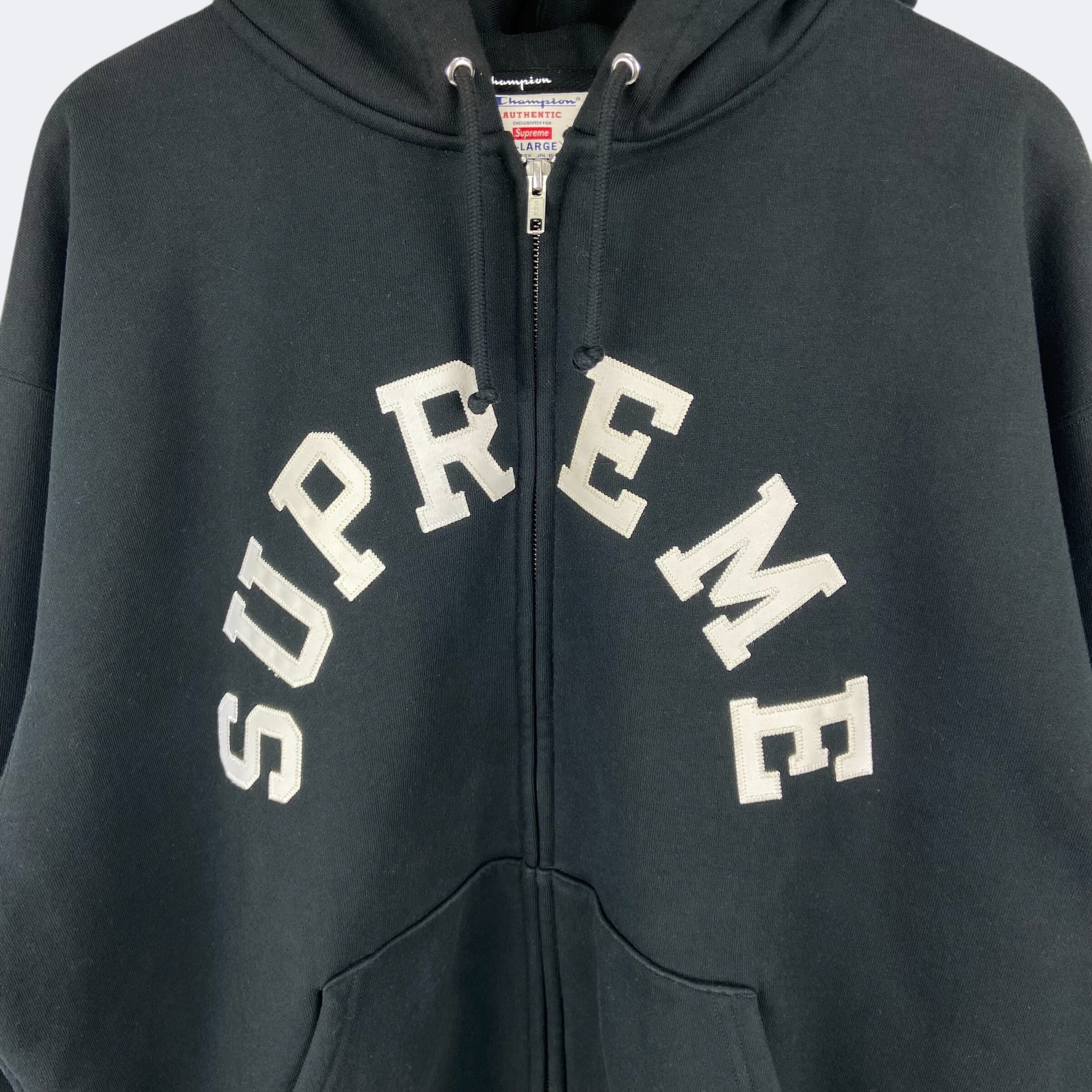 24SSリリースのチャンピオンとのコラボレーションアイテム。チャンピオン製のフルジップパーカーにタックルツイルアップリケでSupremeアーチロゴが縫い付けられたオーセンティックなデザインになります。左袖口のチャンピオンのCロゴパッチが付き、ボディーはヘビーオンスコットンポリ混紡の裏起毛となっており肌触りが良く柔らかさが特徴です。