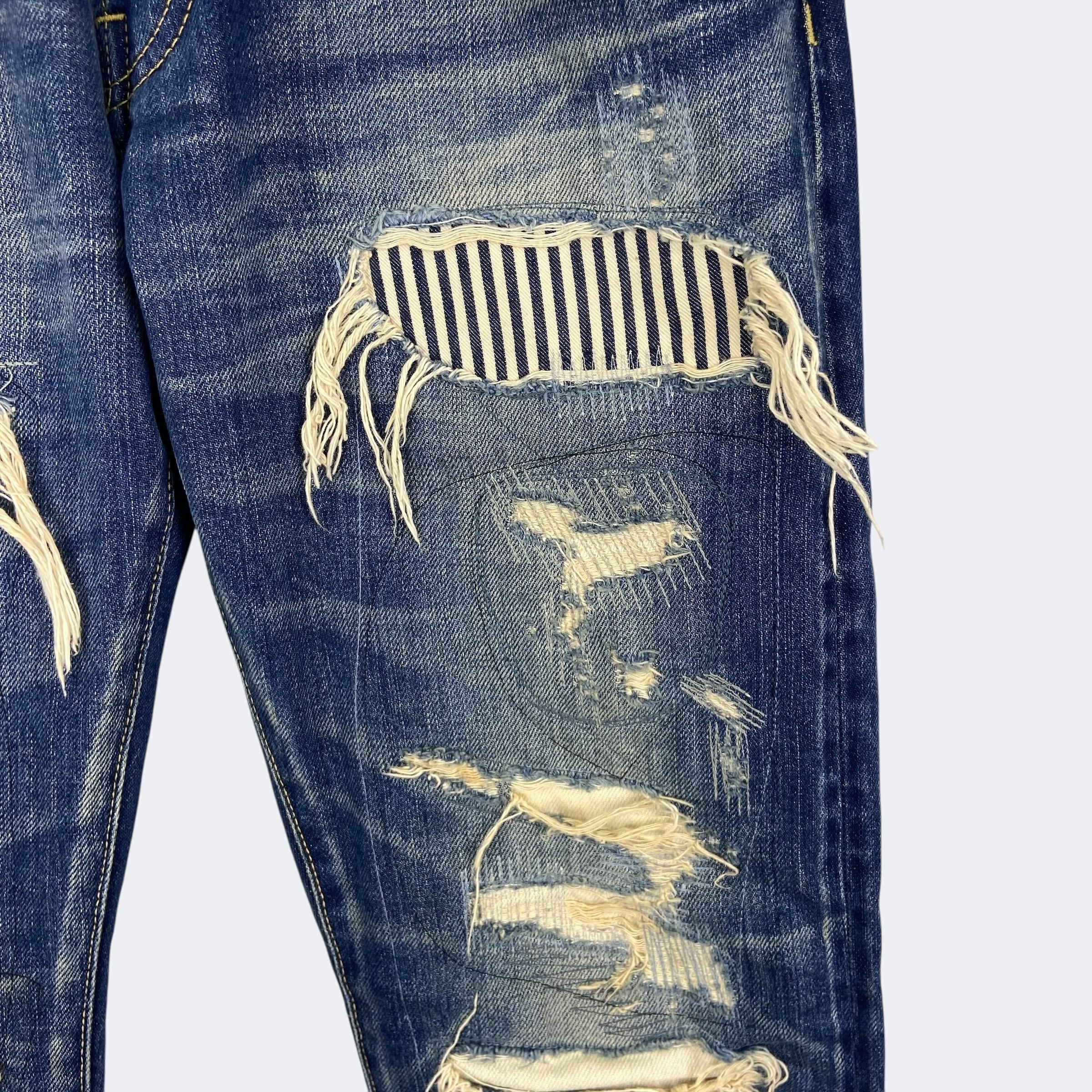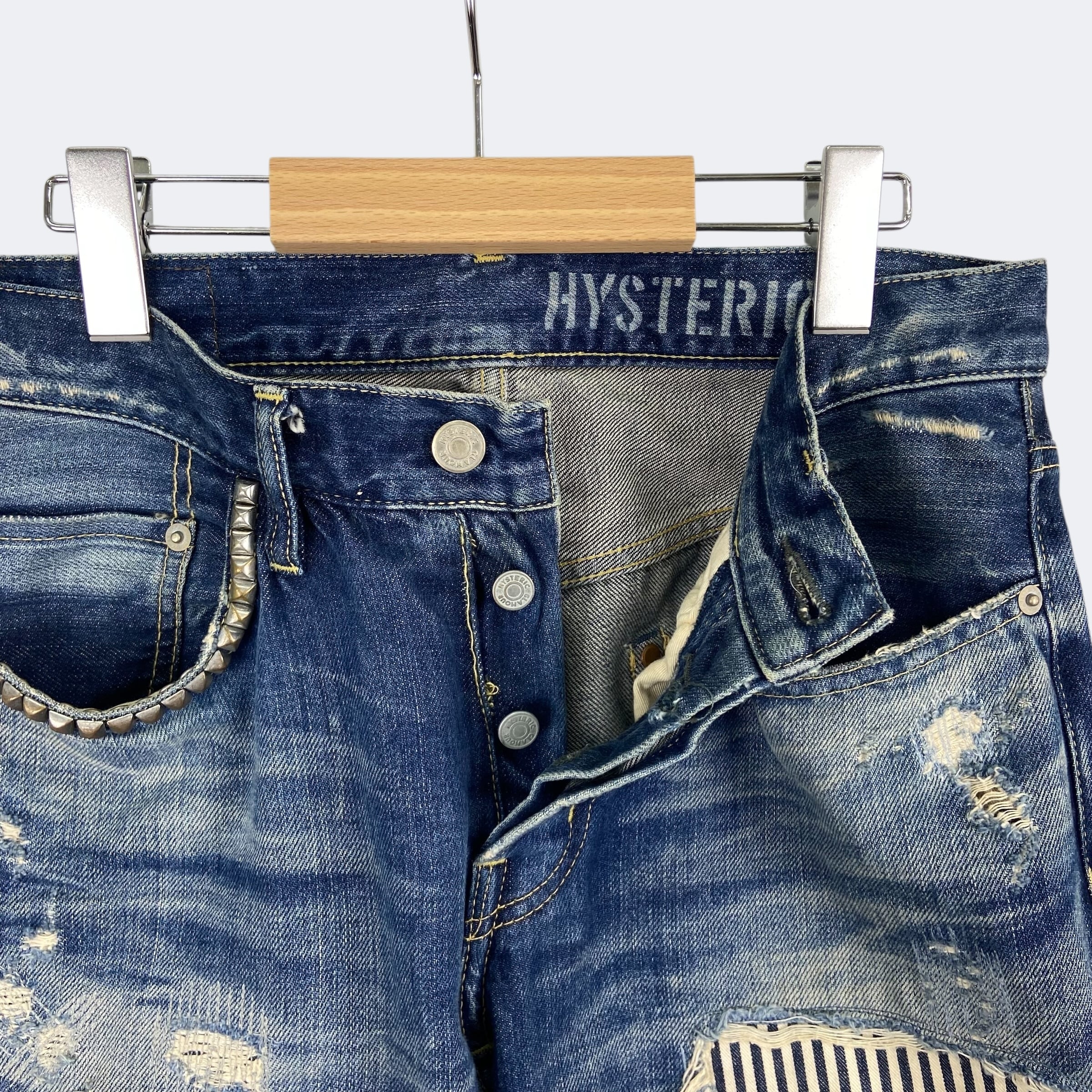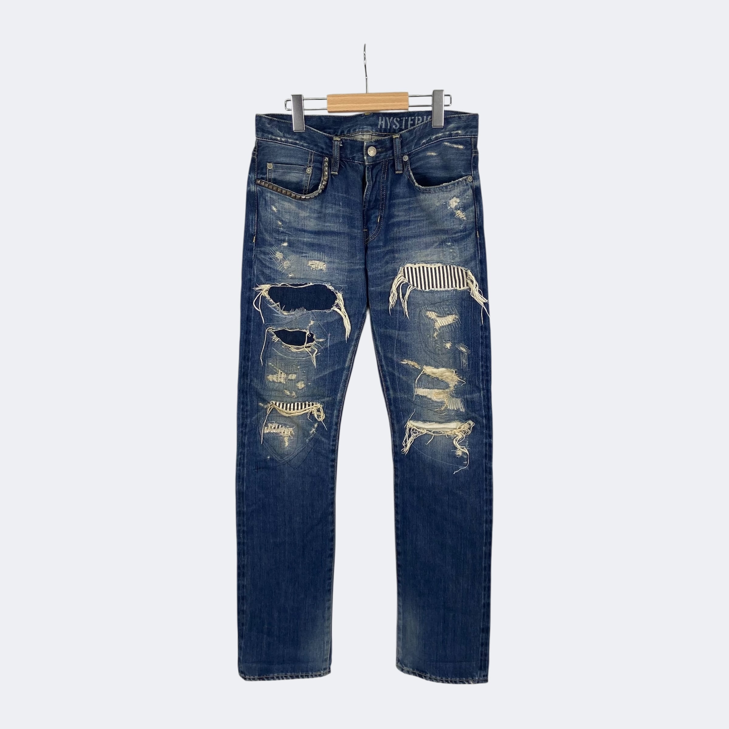 ヒステリックグラマー独自の手法であるランダムステッチリメイク加工が施されたデニムパンツになります。運針や糸色を変えリメイクした加工になり、あて布に共生地・スレキ・別布を使用し、ランダムなステッチでリメイクすることで、ダメージ箇所ごとに変化を持たせた味のある1本に仕上げられています。