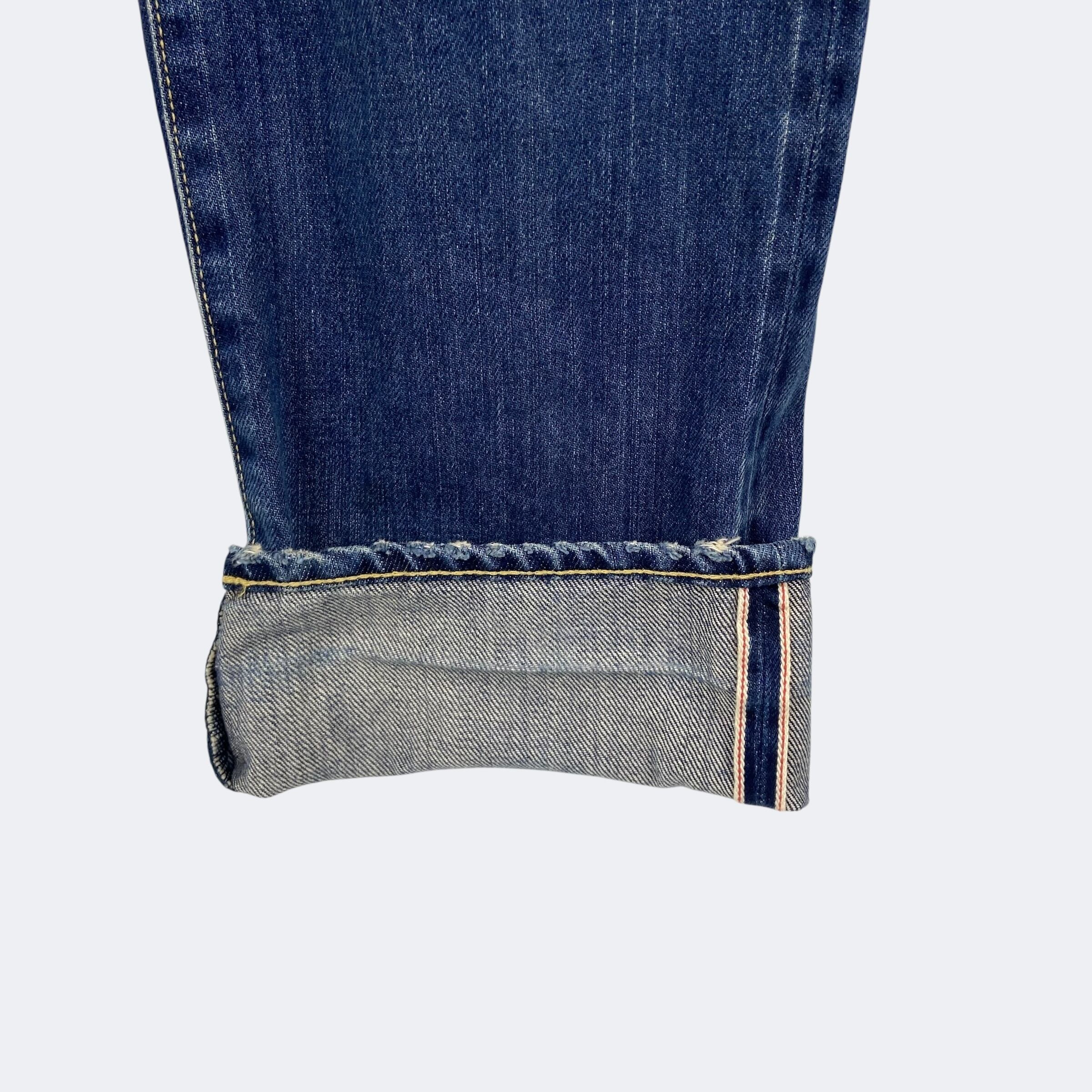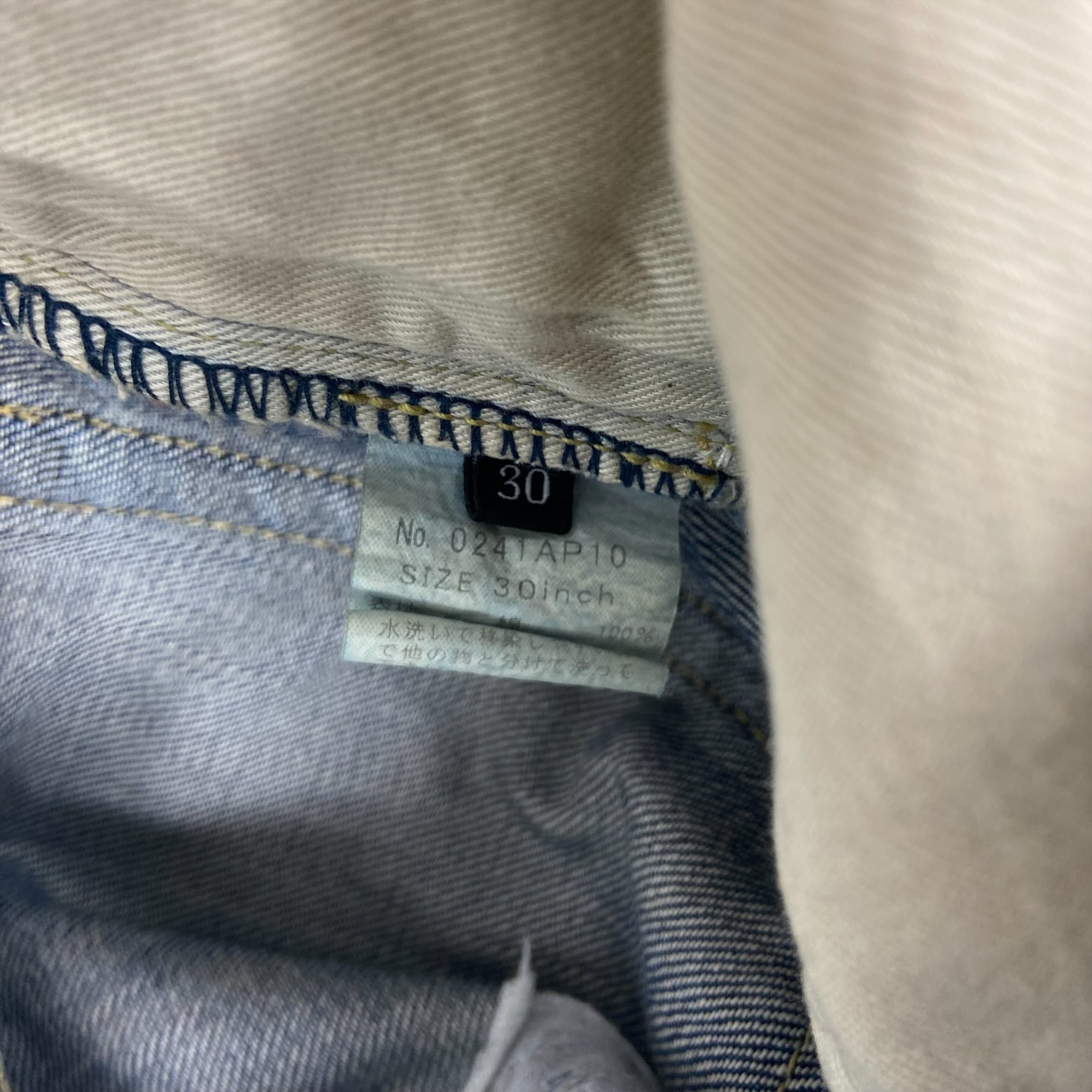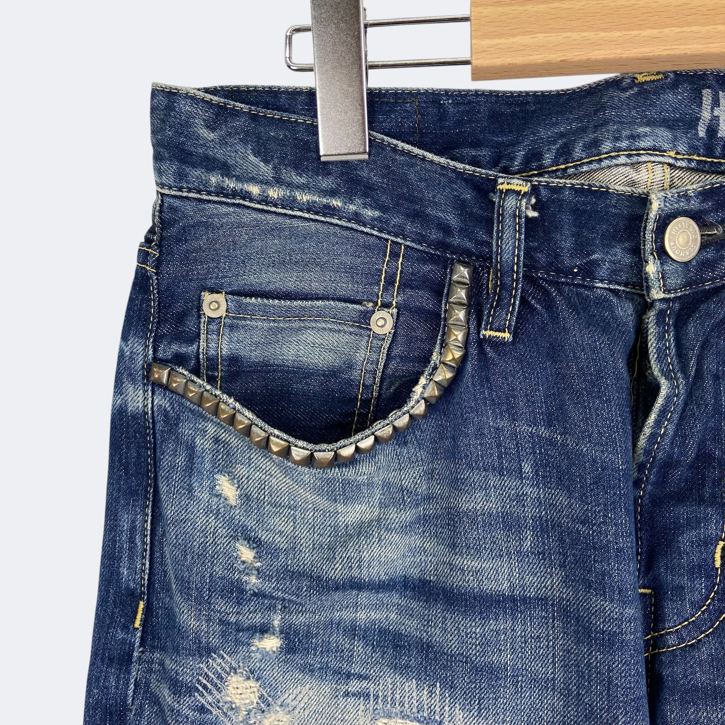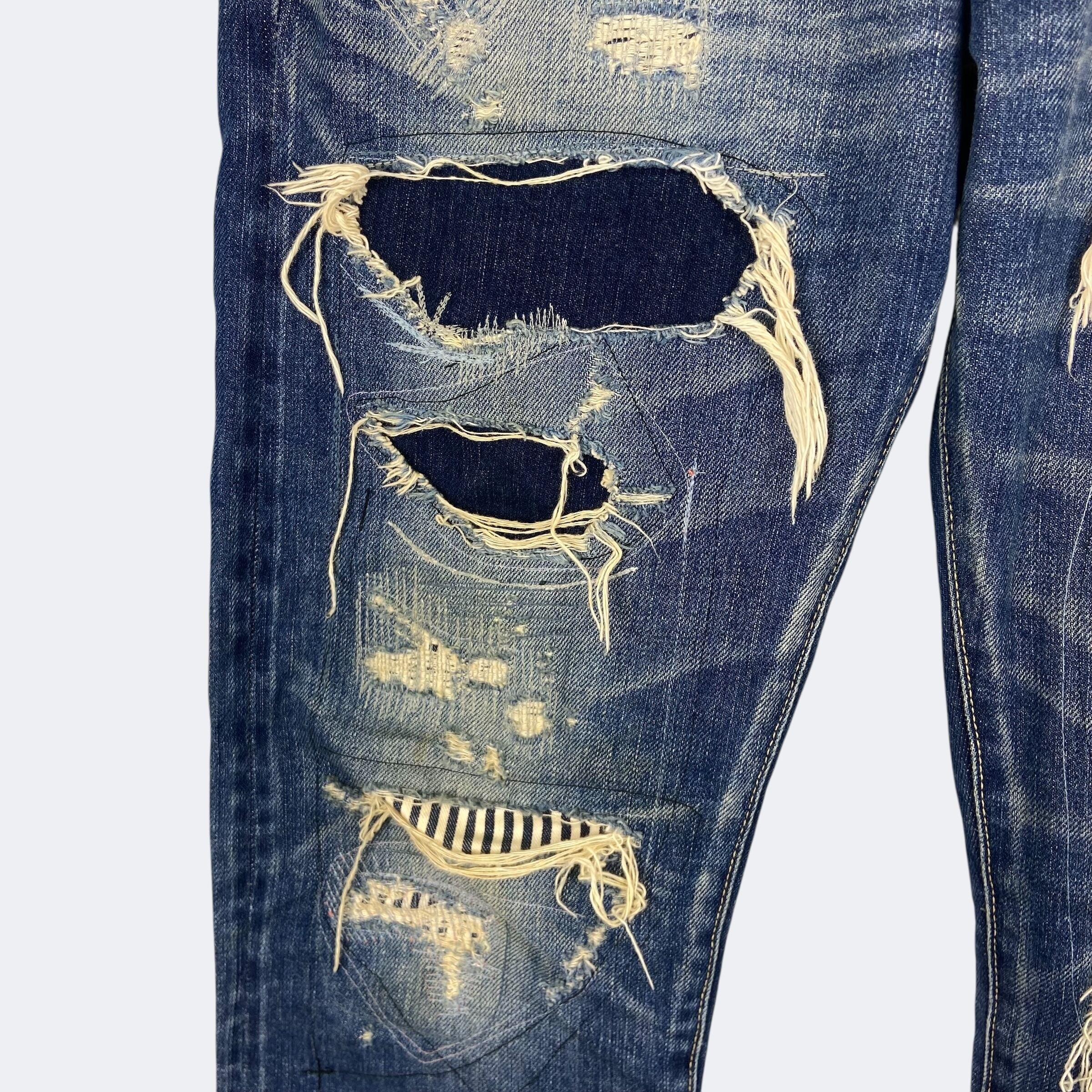 ヒステリックグラマー独自の手法であるランダムステッチリメイク加工が施されたデニムパンツになります。運針や糸色を変えリメイクした加工になり、あて布に共生地・スレキ・別布を使用し、ランダムなステッチでリメイクすることで、ダメージ箇所ごとに変化を持たせた味のある1本に仕上げられています。