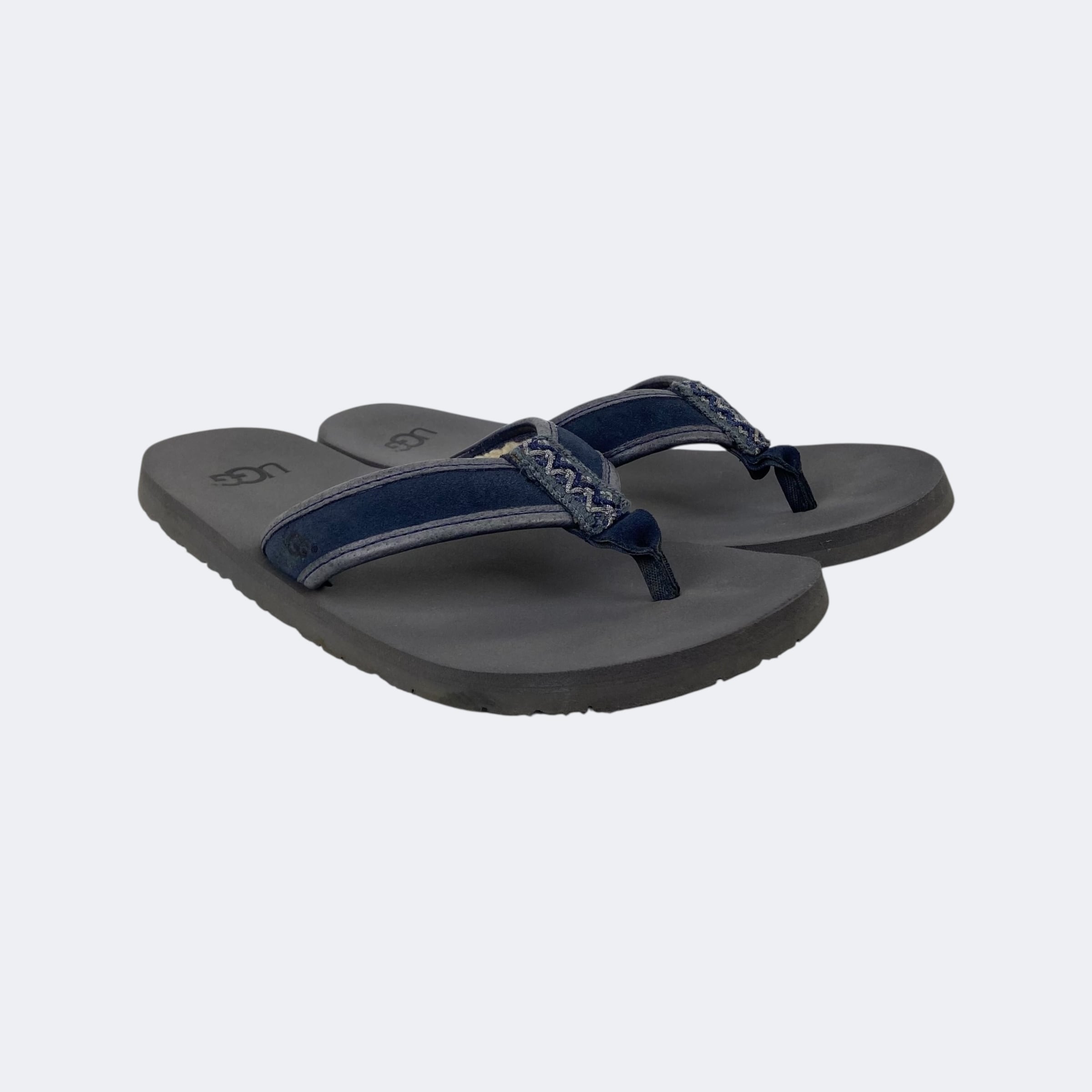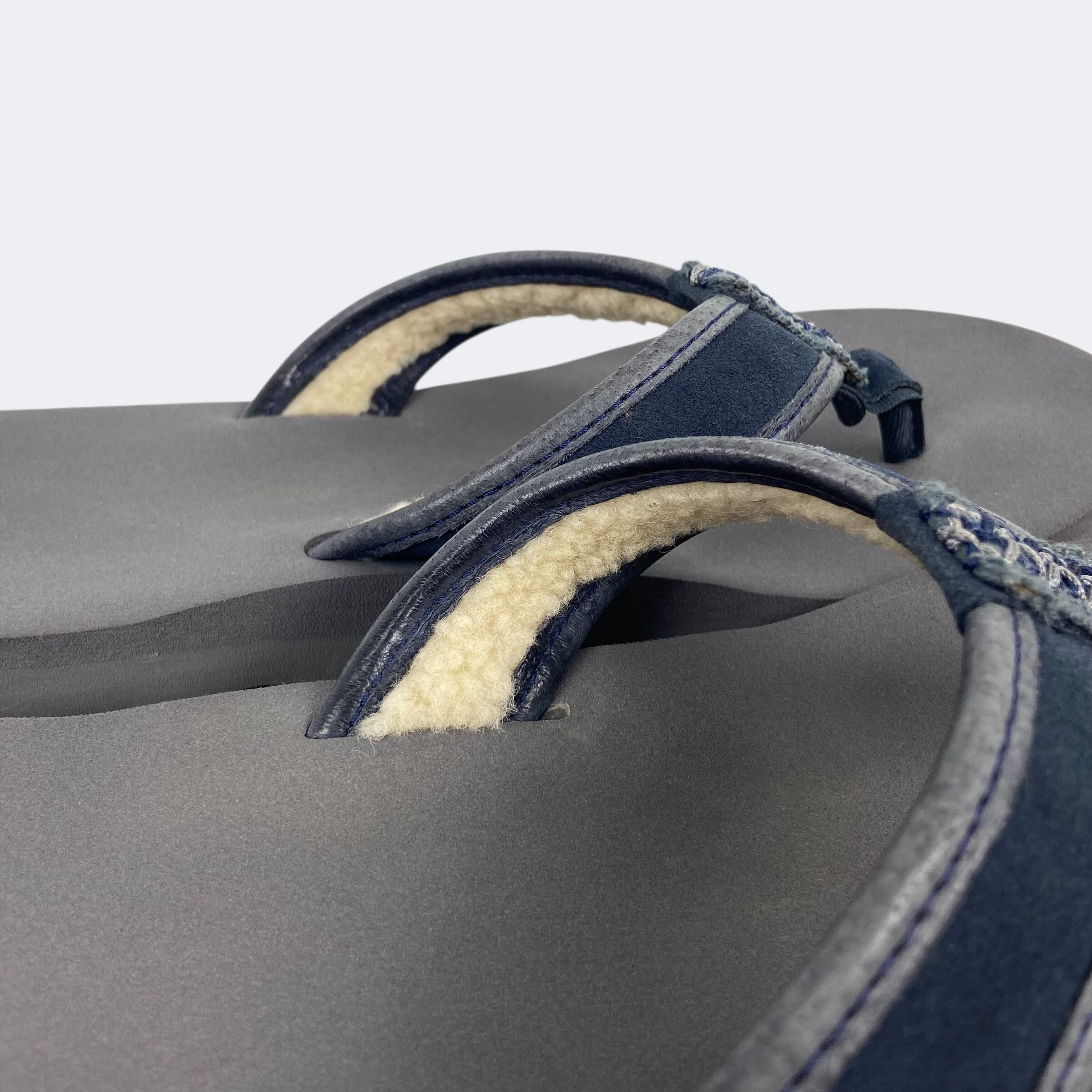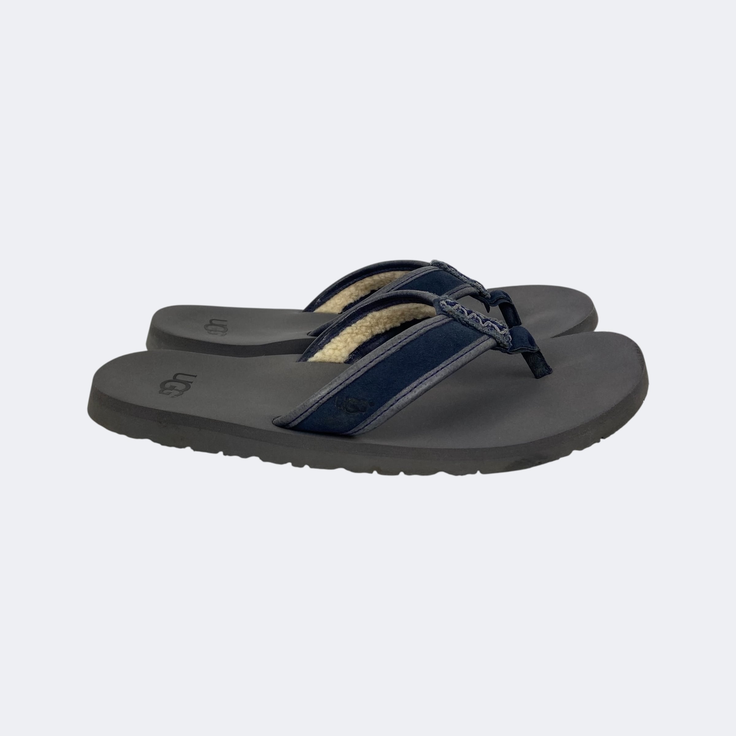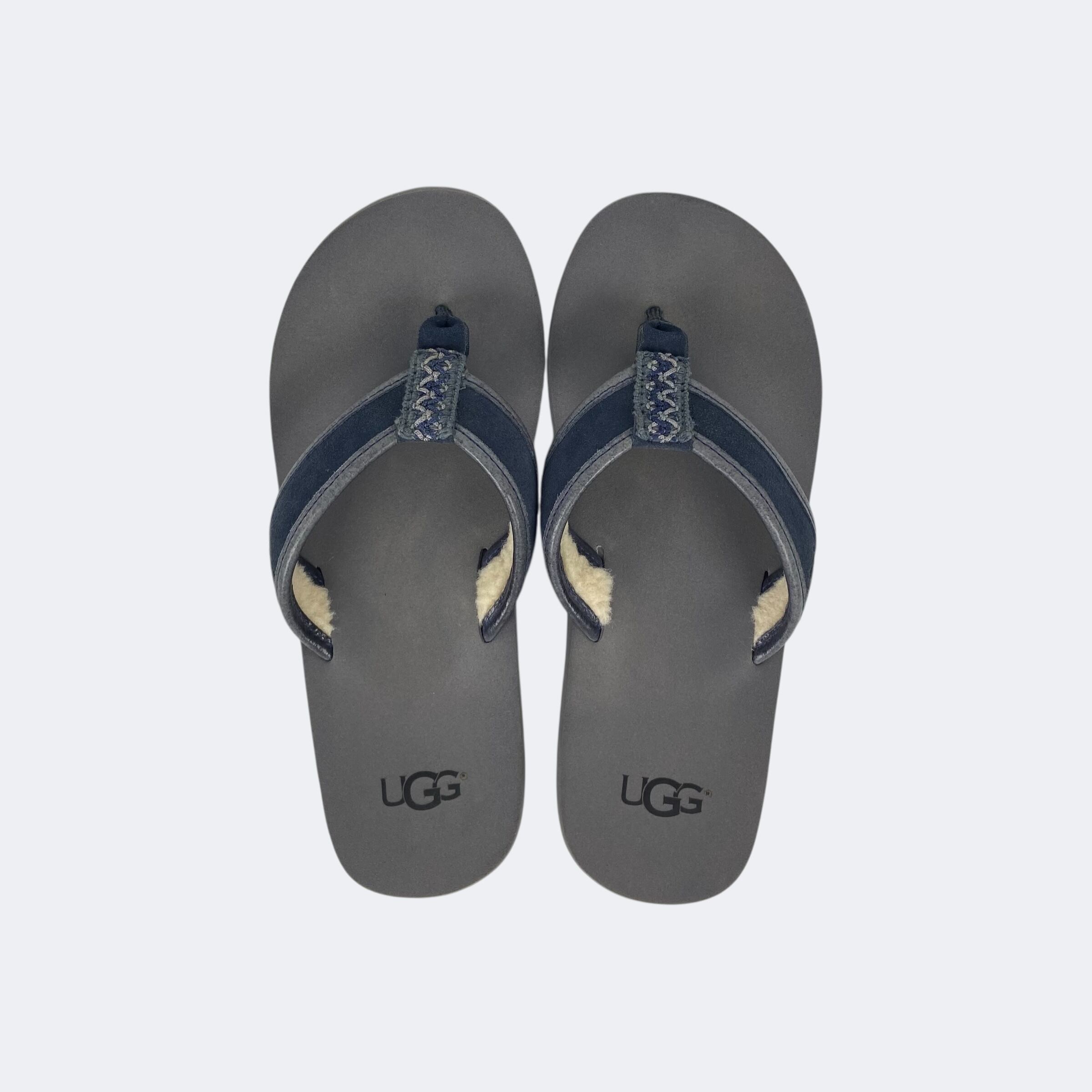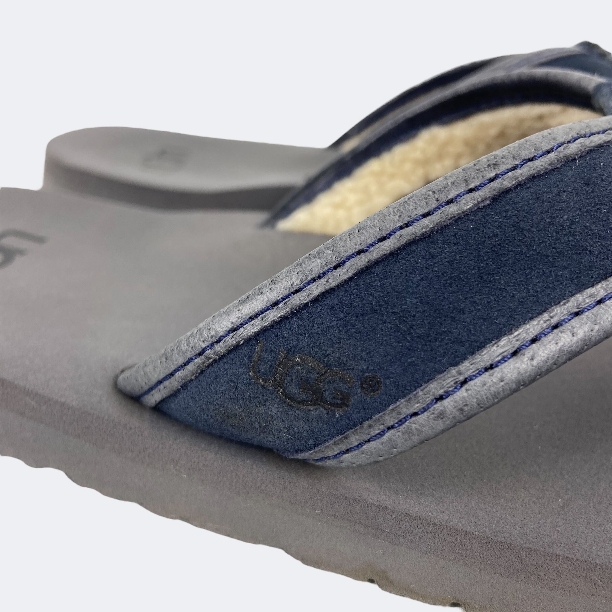 鼻緒にレザーとスウェードを使用し、裏側にはボアを施したアグのビーチサンダルになります。サイドには型押し、ソール部分にはプリントでそれぞれロゴが入ります。
