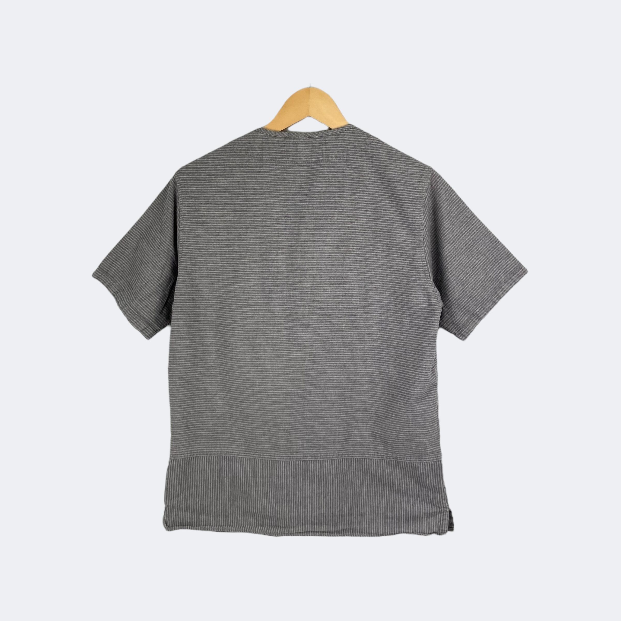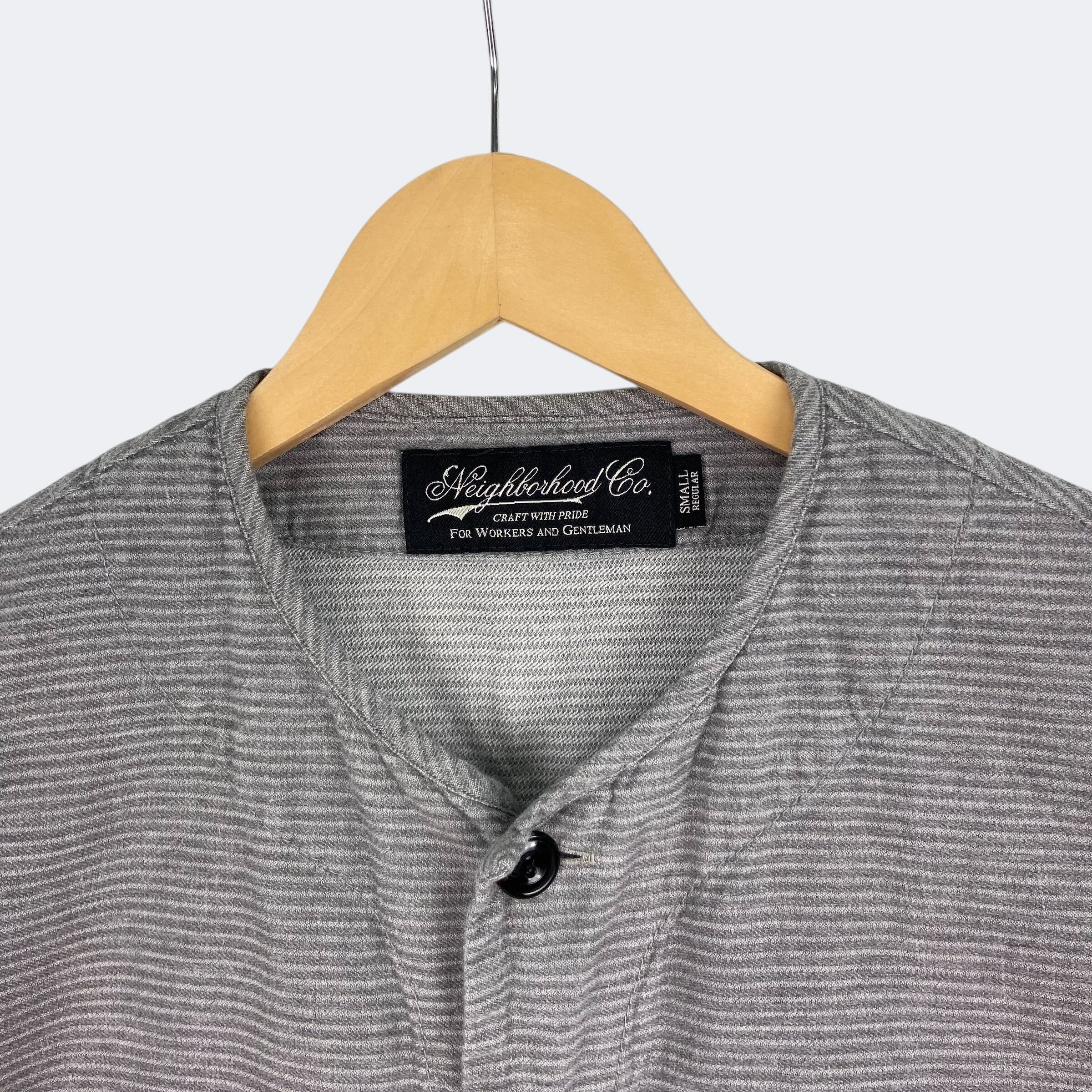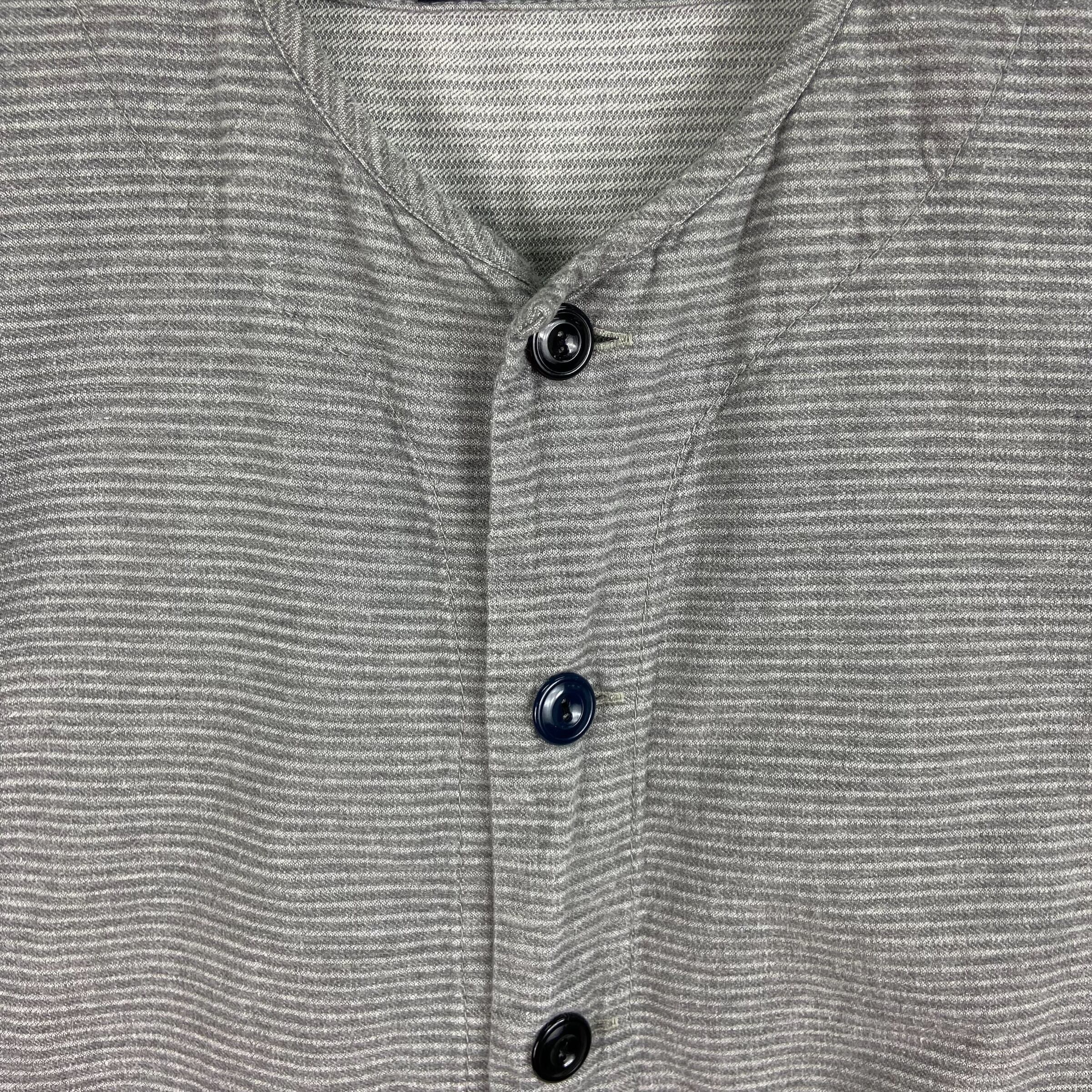 同色糸でボーダーが織りで表現されたネイバーフッドのドビーシャツになります。ノーカラーの前開き仕様になり、第二ボタンのみNAVYカラーになります。また、裾部分でパターンが切り替えされていますのでデザインのアクセントになっています。171AQNH-SHM04