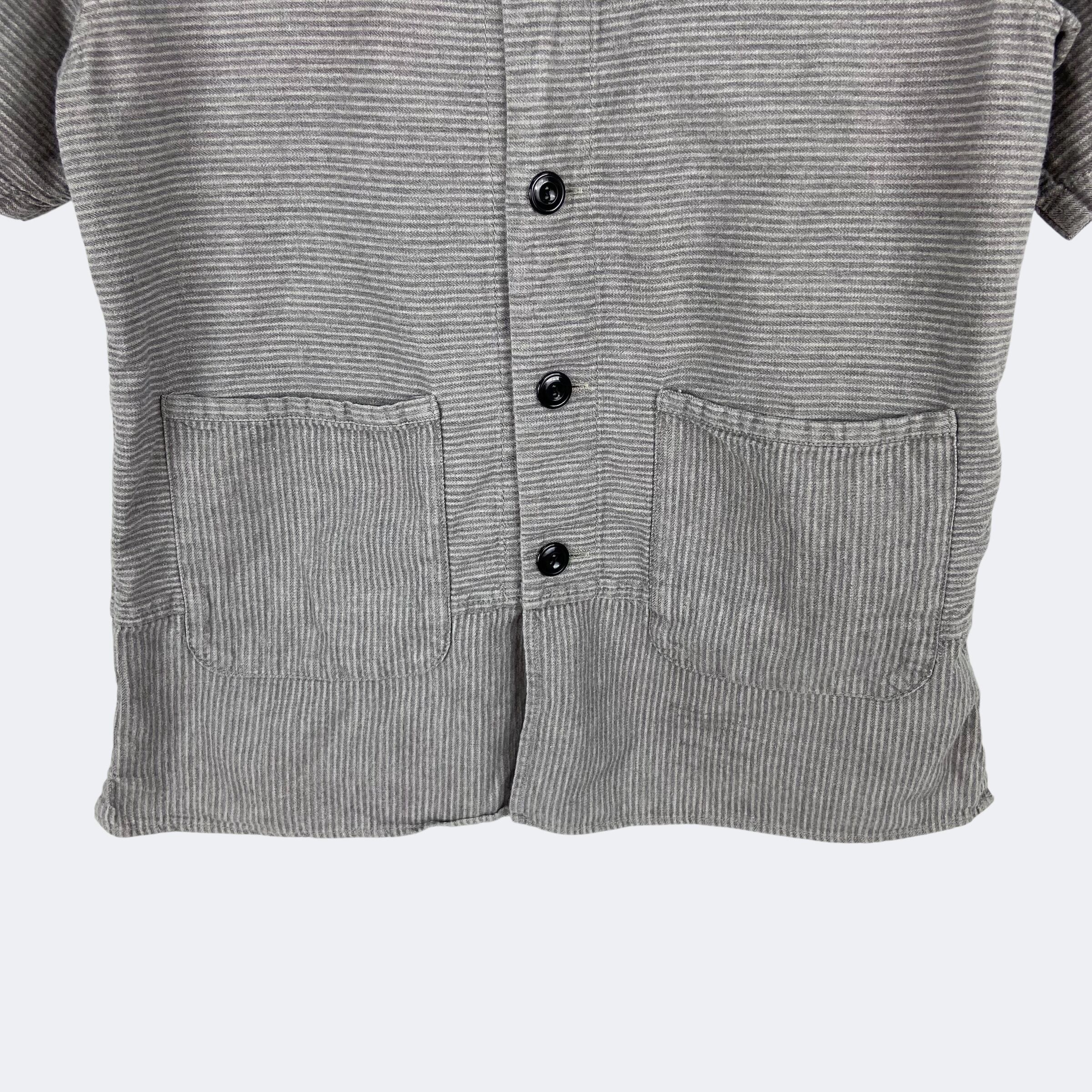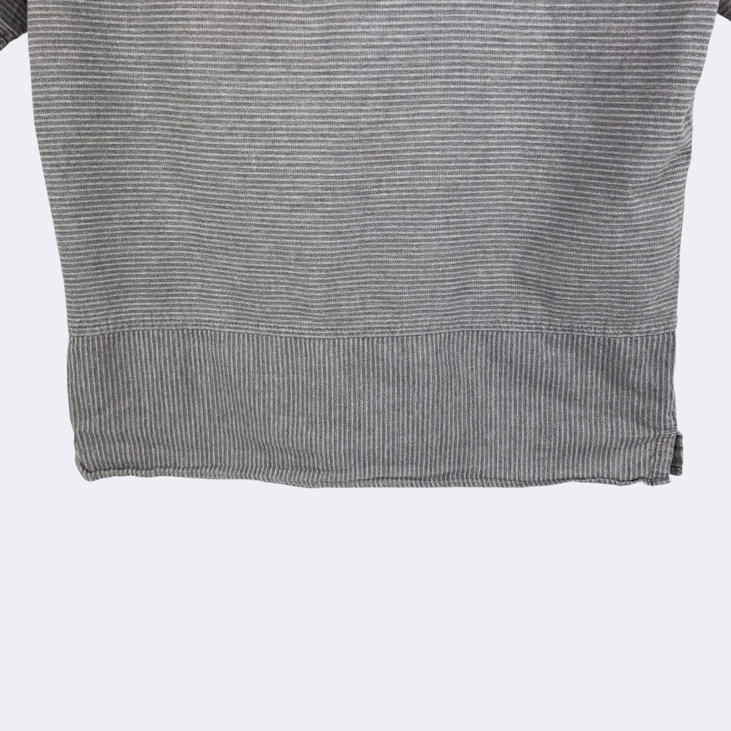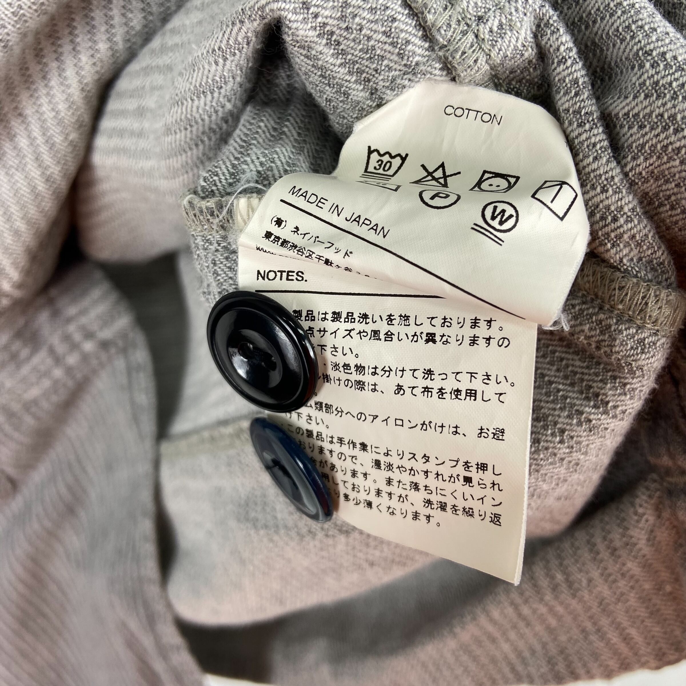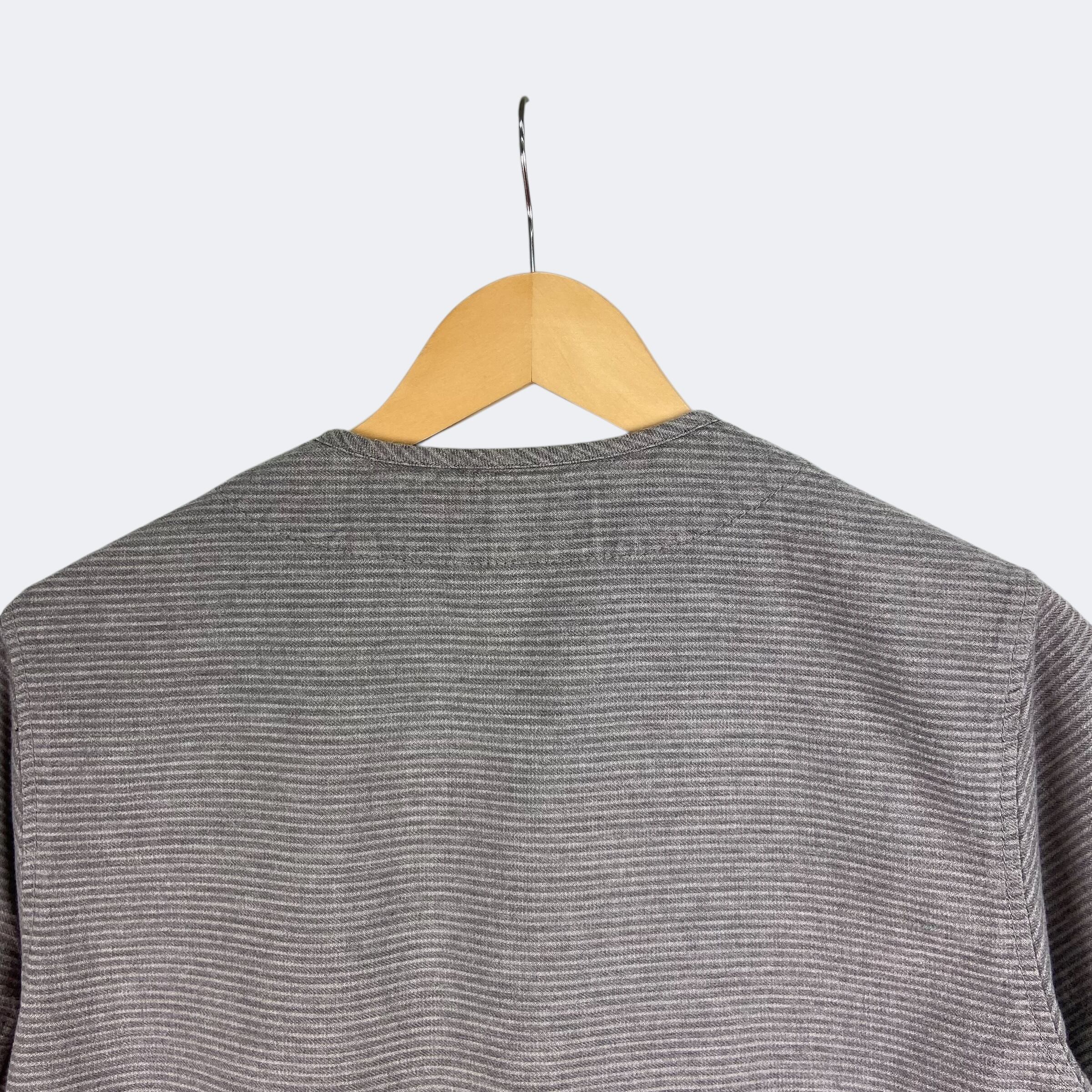 同色糸でボーダーが織りで表現されたネイバーフッドのドビーシャツになります。ノーカラーの前開き仕様になり、第二ボタンのみNAVYカラーになります。また、裾部分でパターンが切り替えされていますのでデザインのアクセントになっています。171AQNH-SHM04