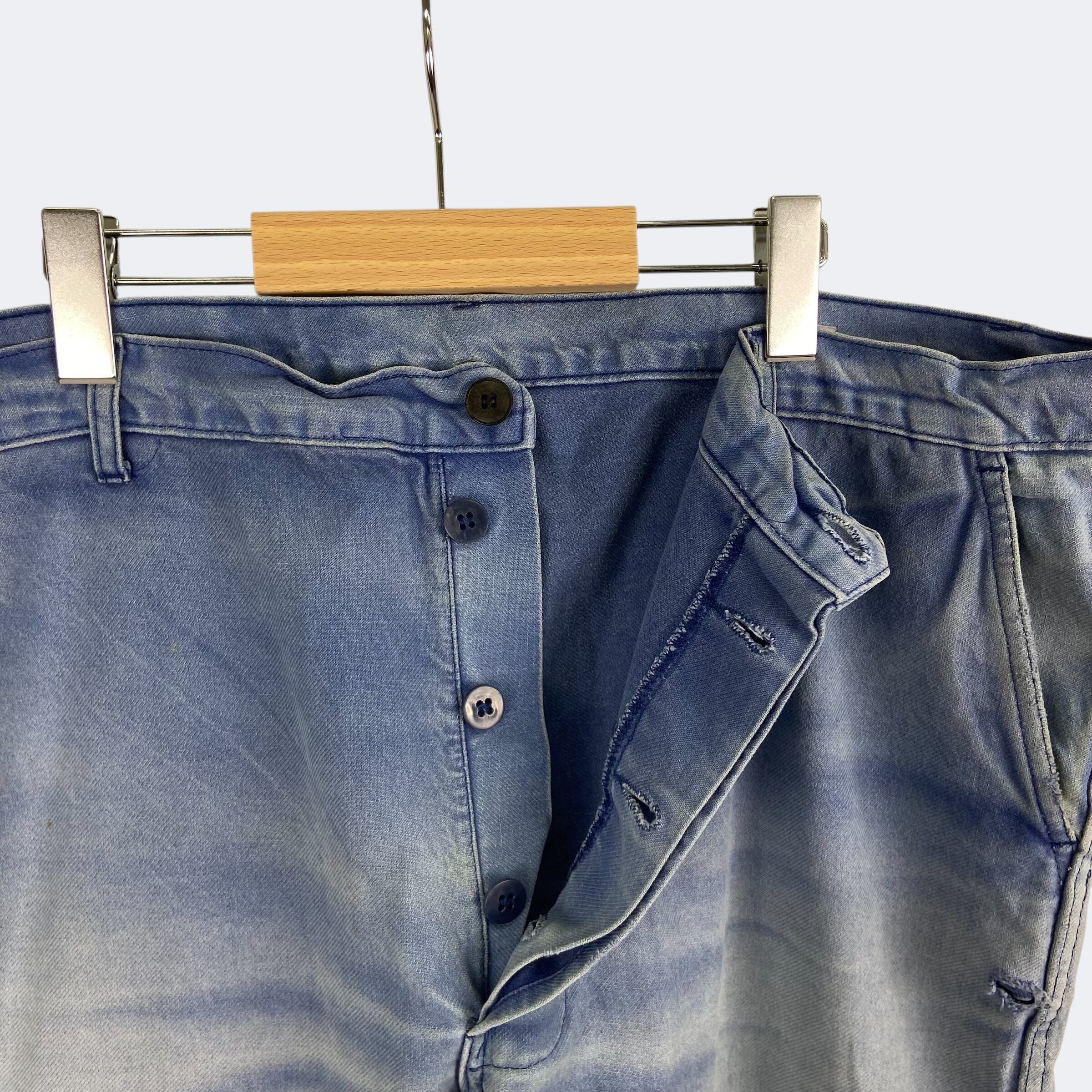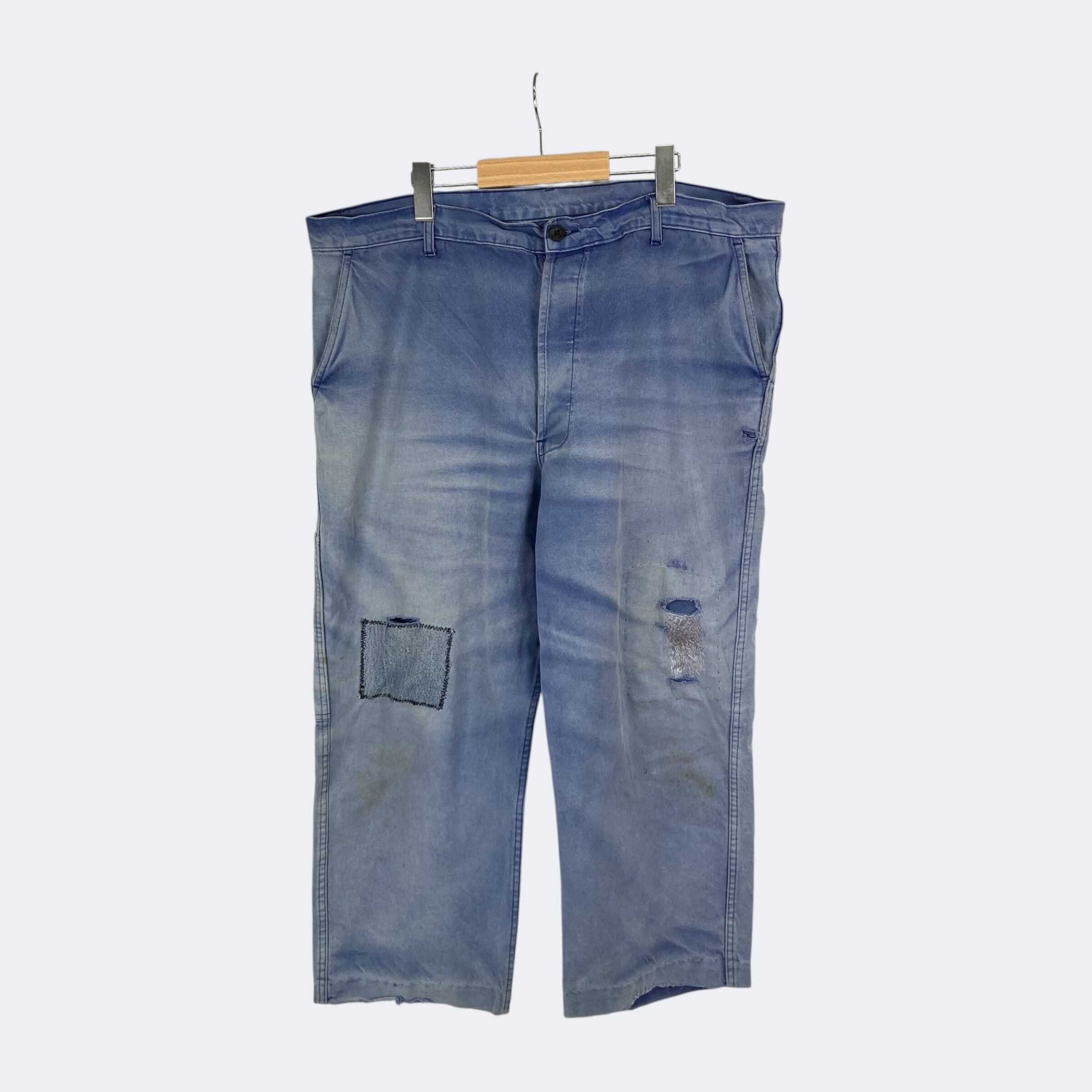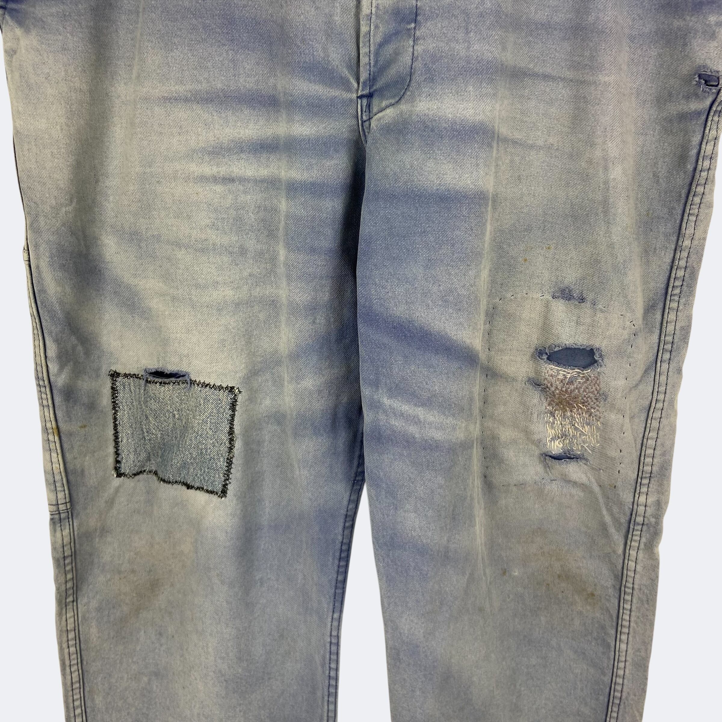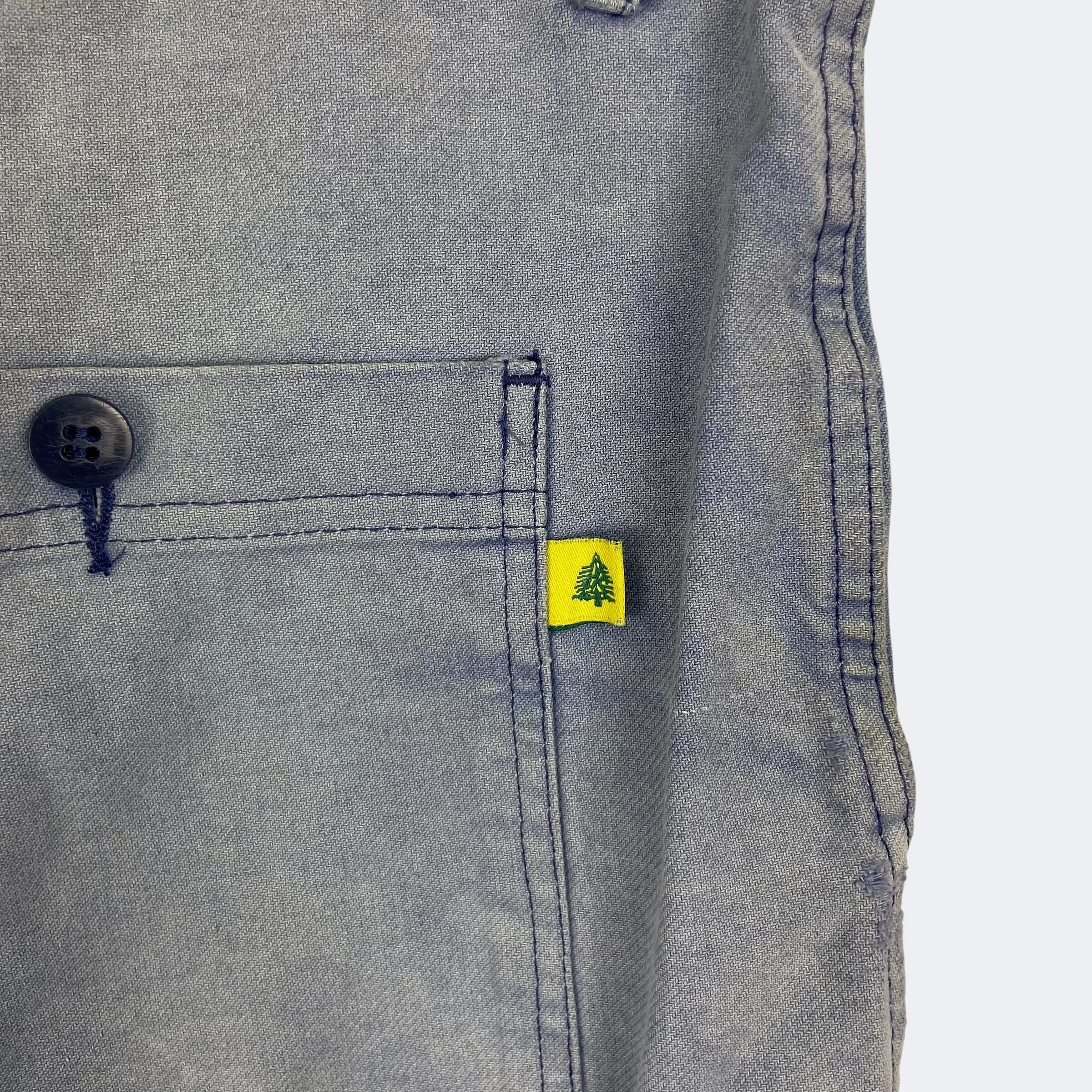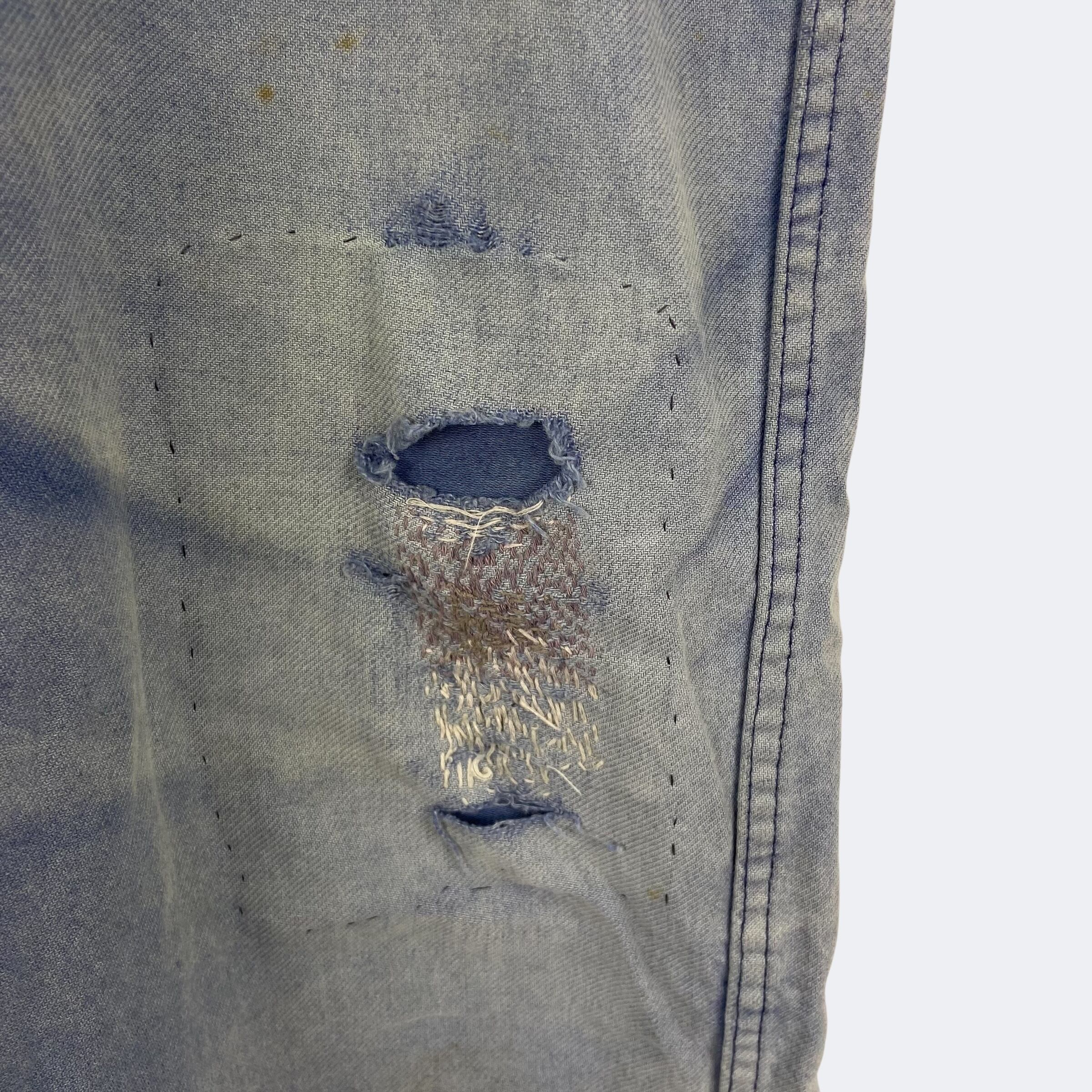 80年代ユーロ古着のワークパンツになります。オンス数が低い薄手のデニム生地を使用しており、右サイドにはパッチポケットが付きます。両膝部分にはリペアが施されており、右ヒップ部分にのみバックポケットが付きます。ブランド名などの詳細はタグのプリントが消えてしまっているので不明ですが、バックポケット脇にはツリーのイラストが刺繍されたイエロータグが付きます。