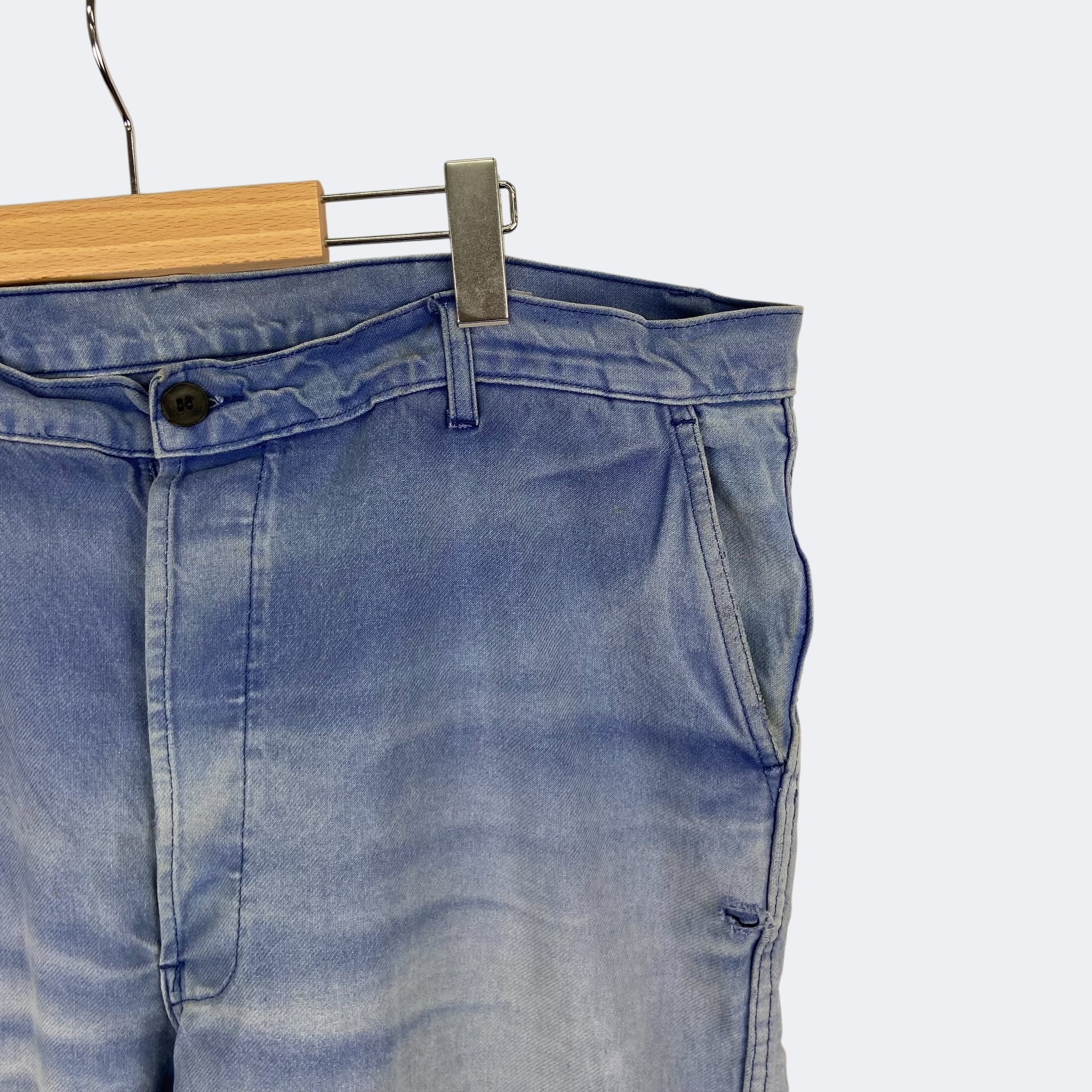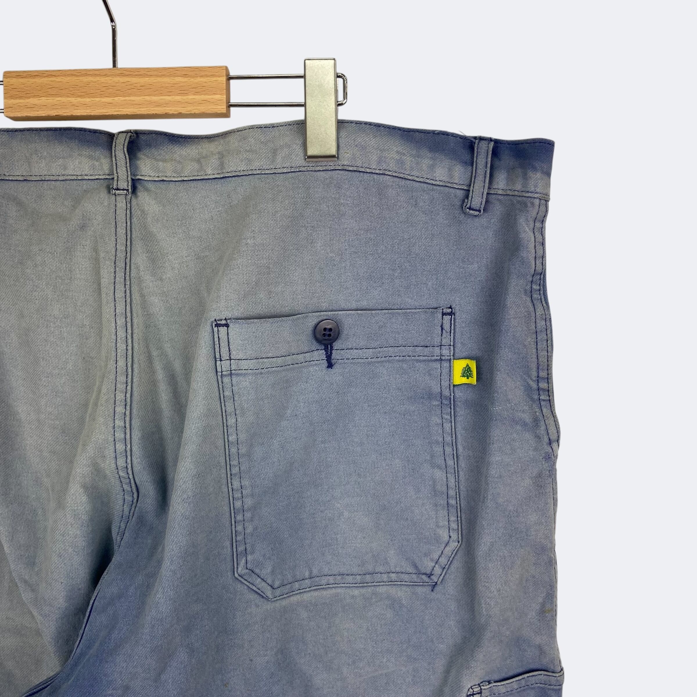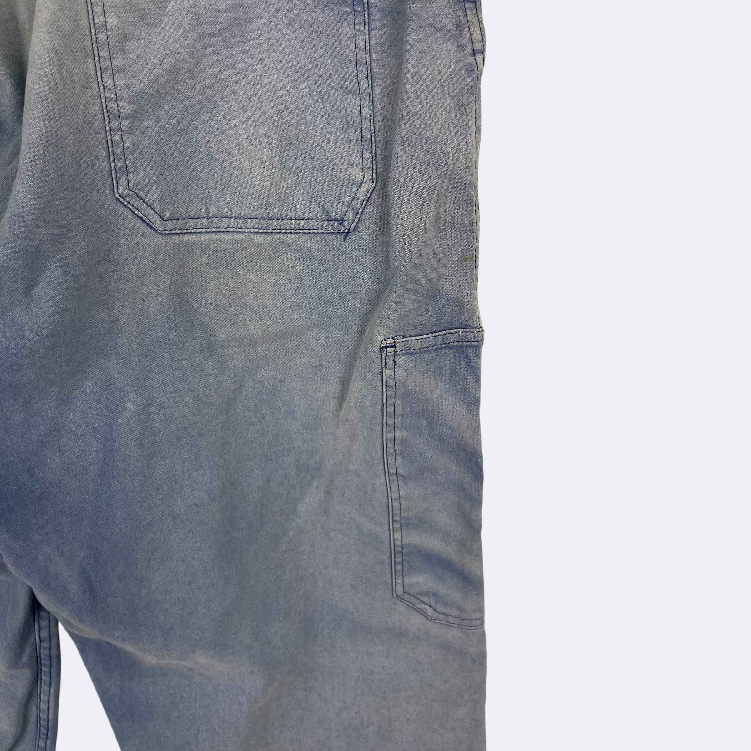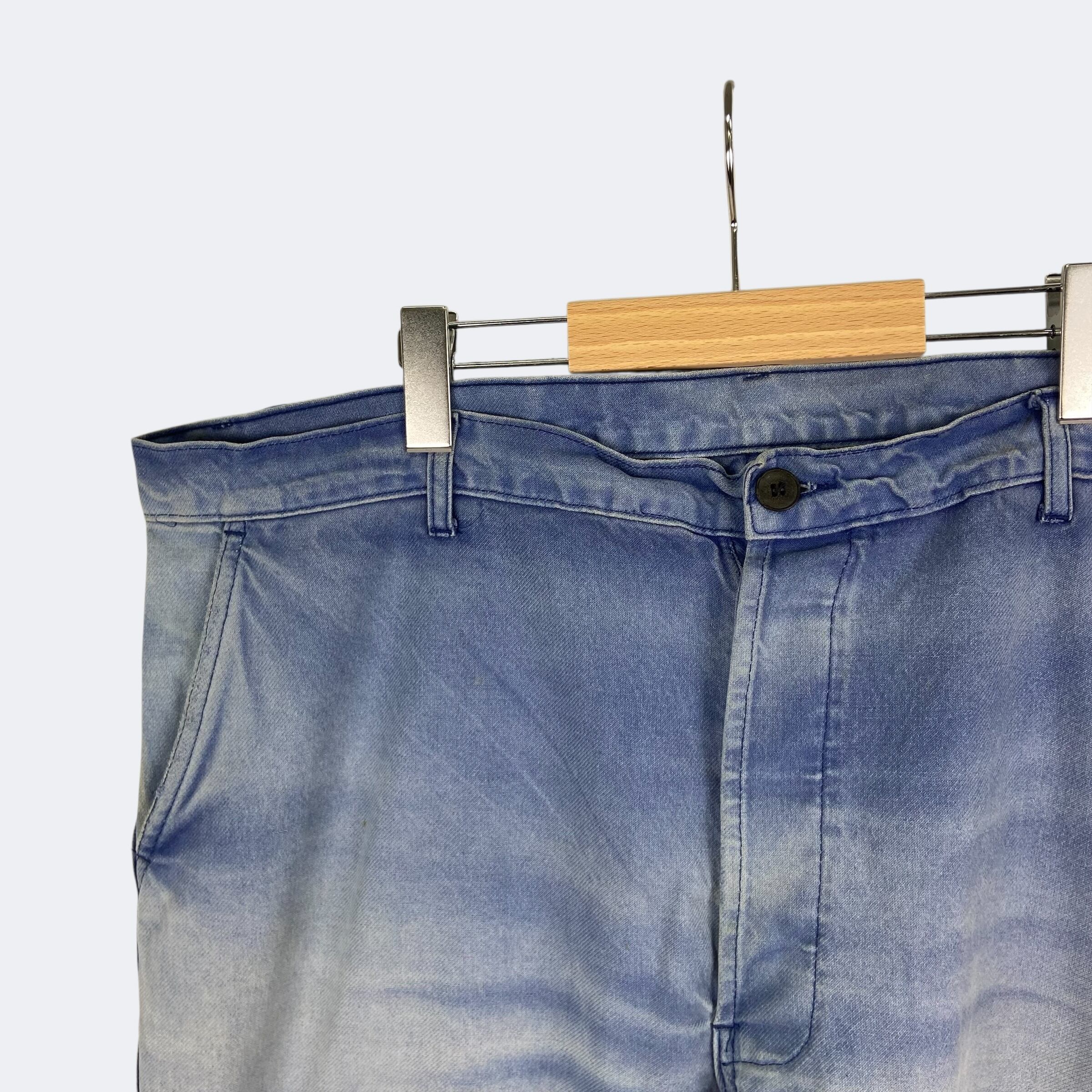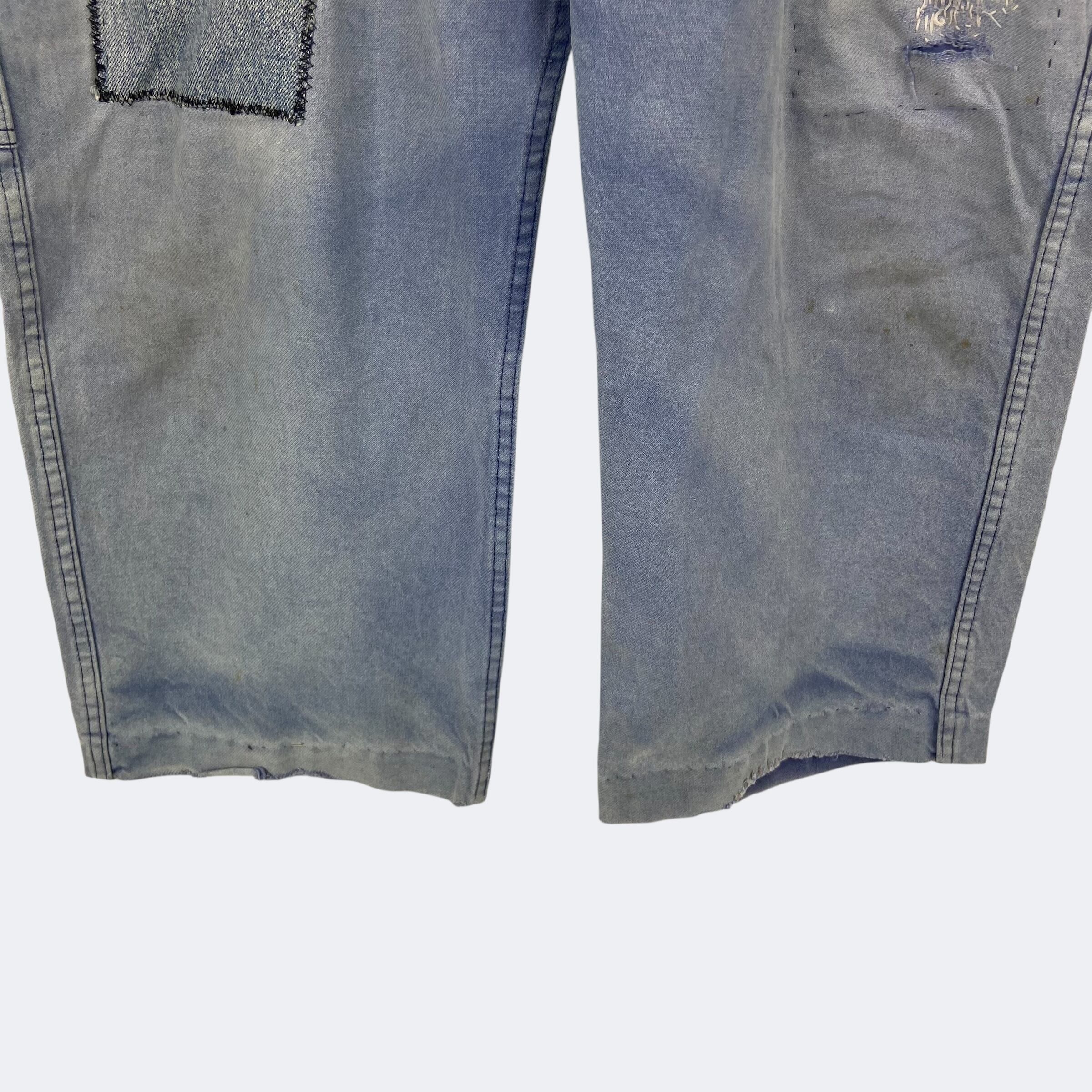 80年代ユーロ古着のワークパンツになります。オンス数が低い薄手のデニム生地を使用しており、右サイドにはパッチポケットが付きます。両膝部分にはリペアが施されており、右ヒップ部分にのみバックポケットが付きます。ブランド名などの詳細はタグのプリントが消えてしまっているので不明ですが、バックポケット脇にはツリーのイラストが刺繍されたイエロータグが付きます。