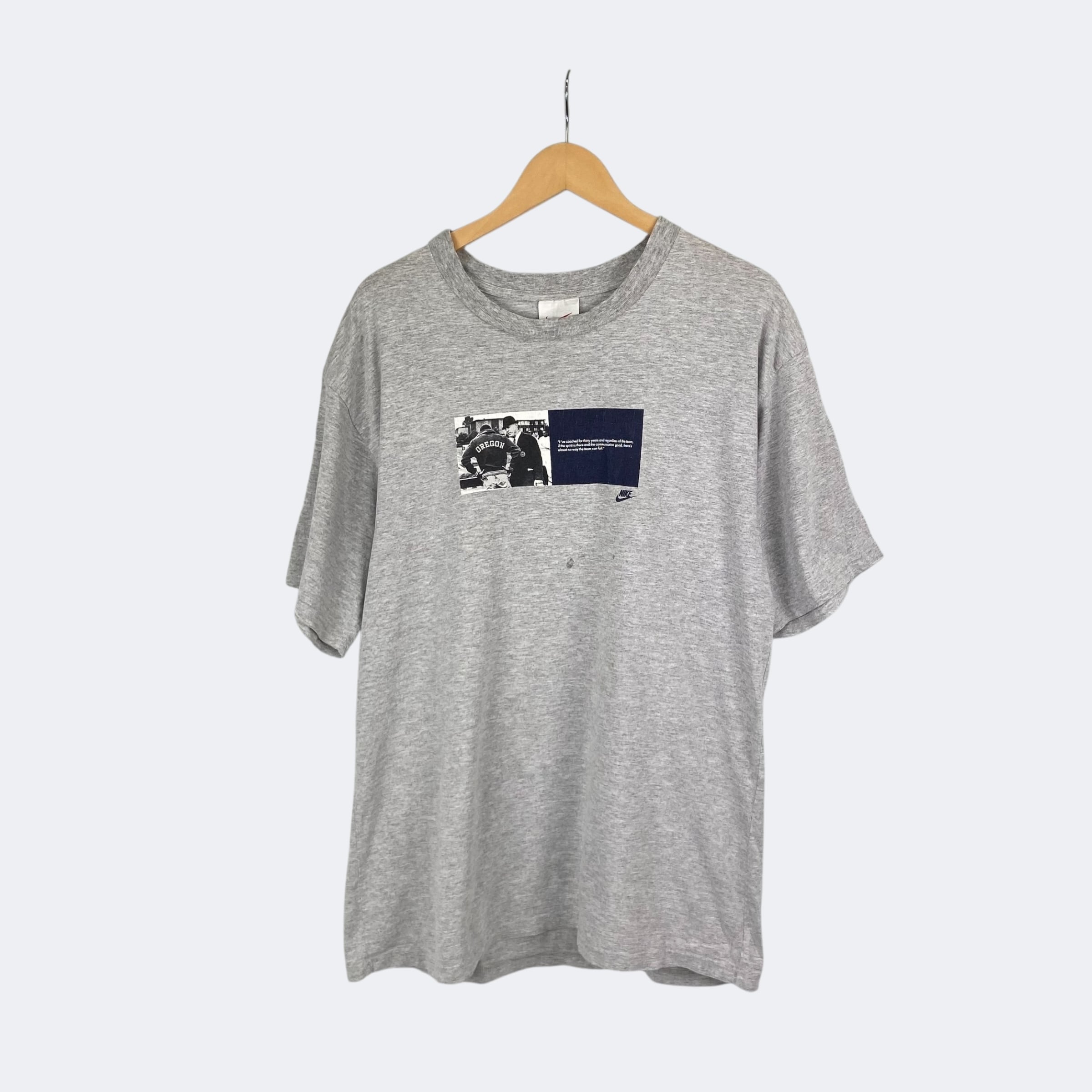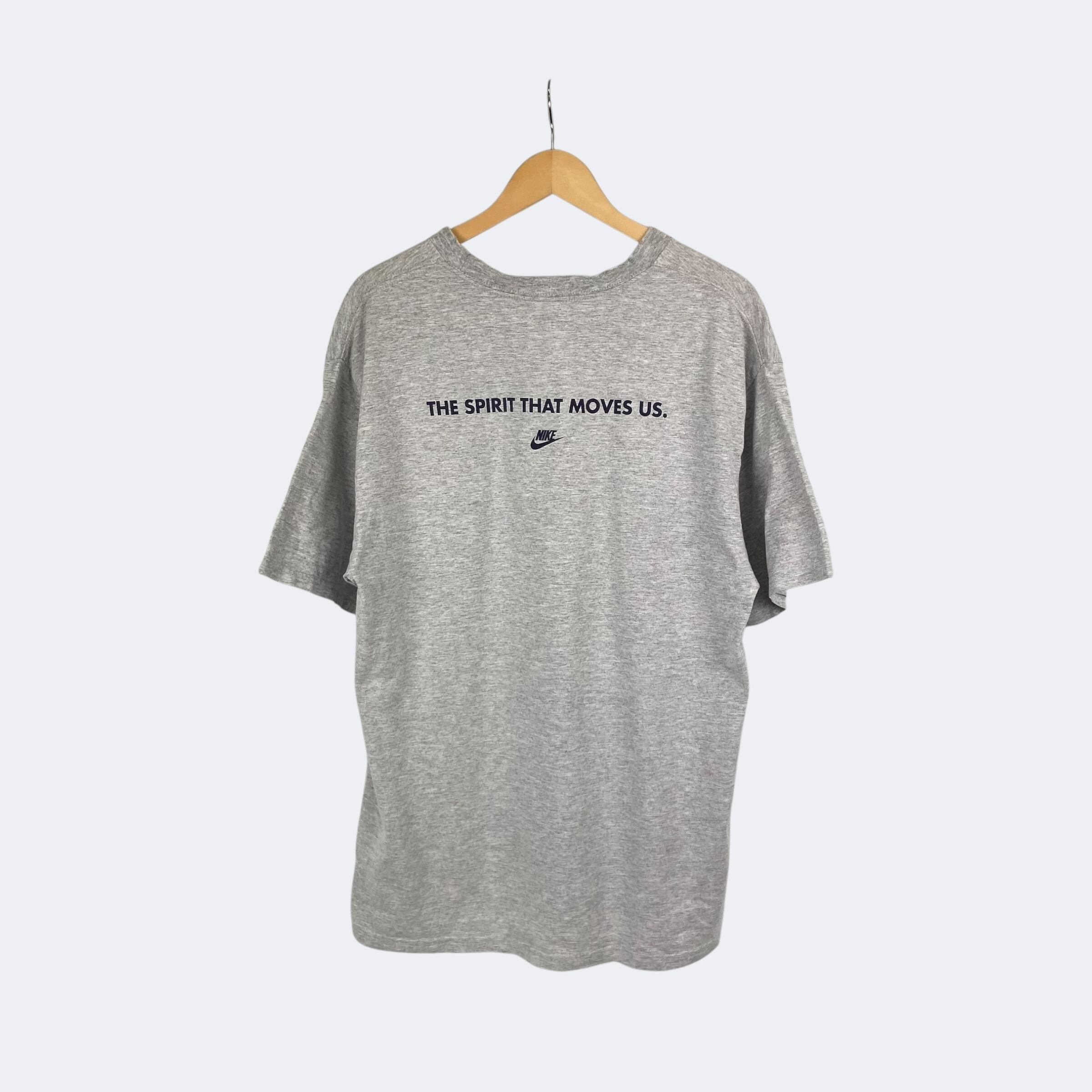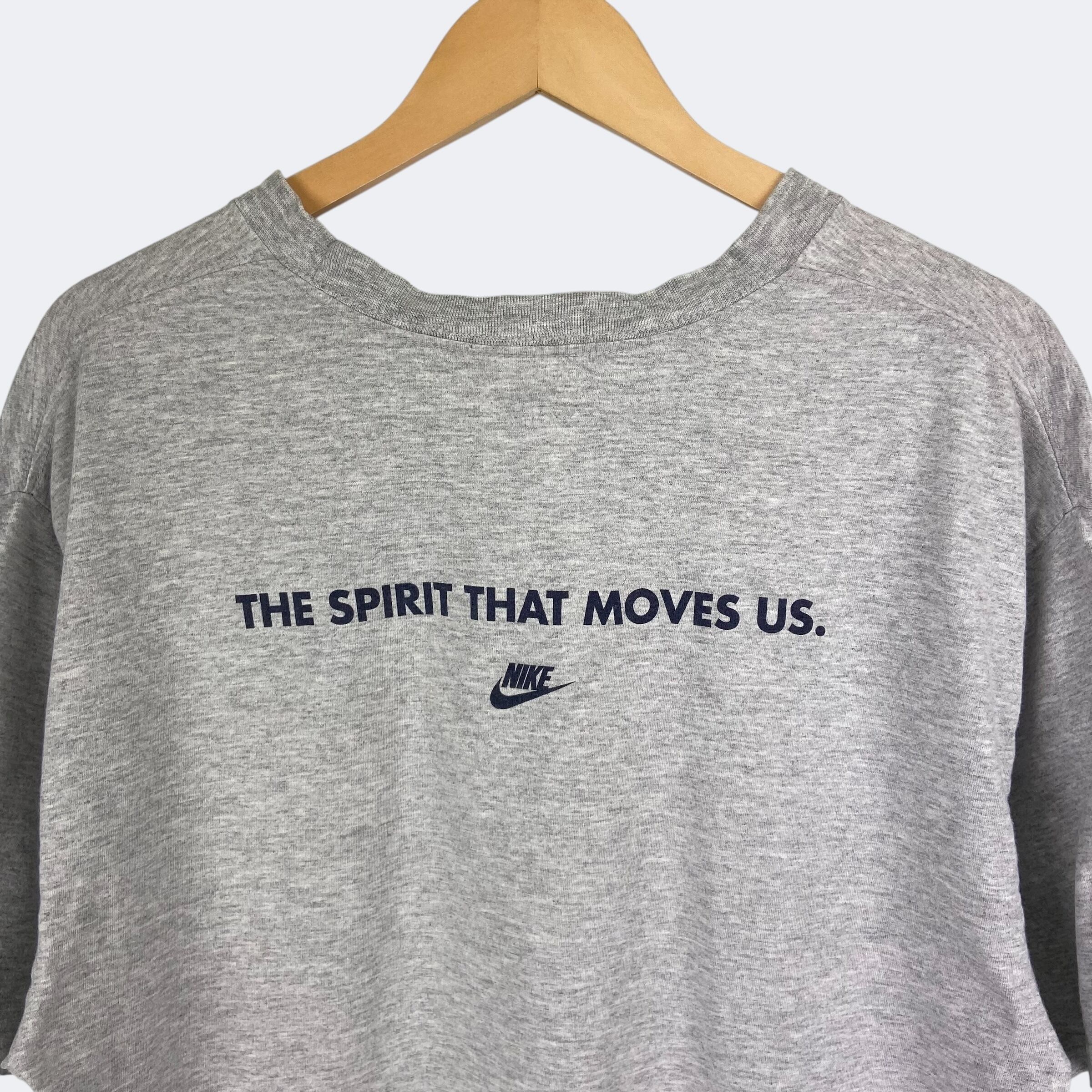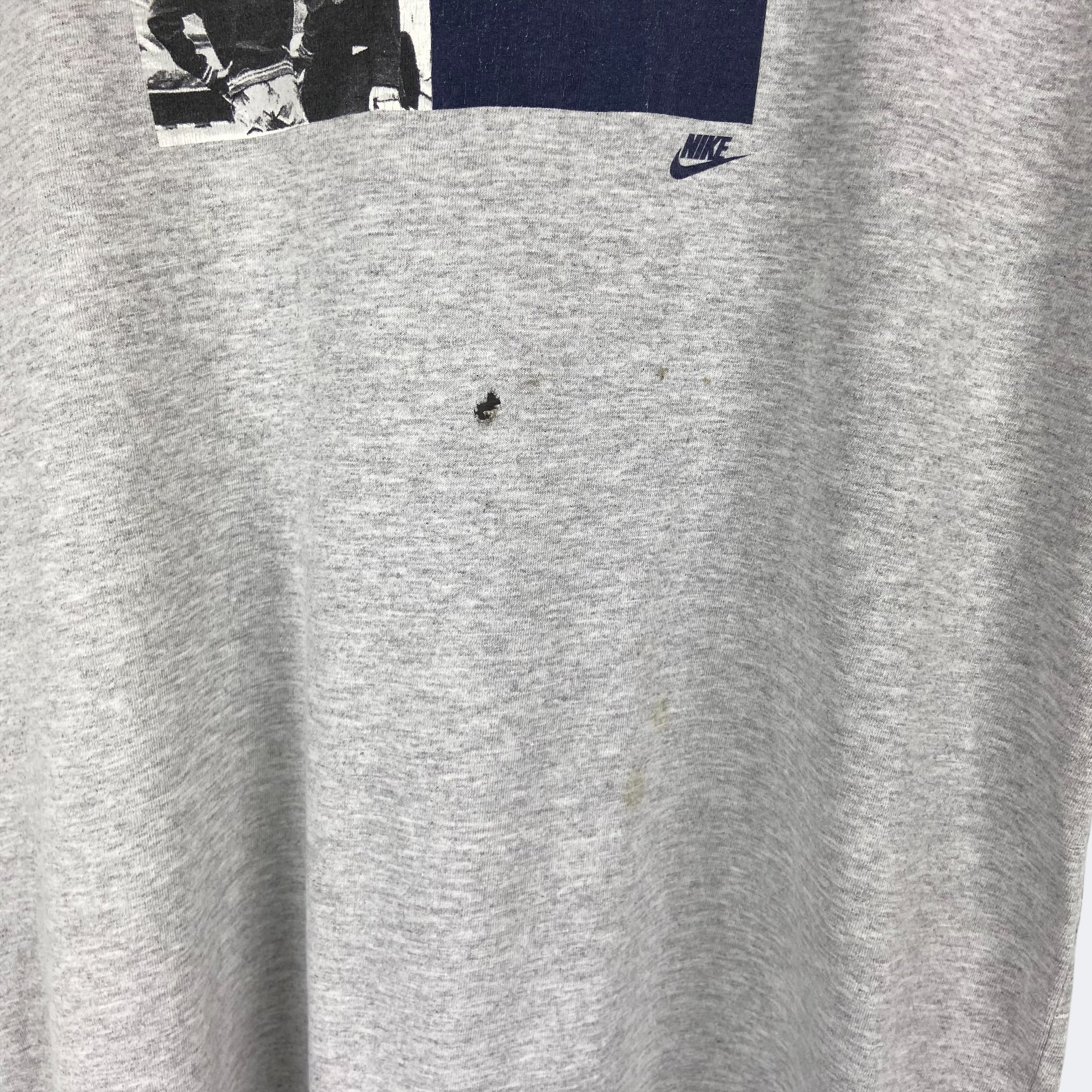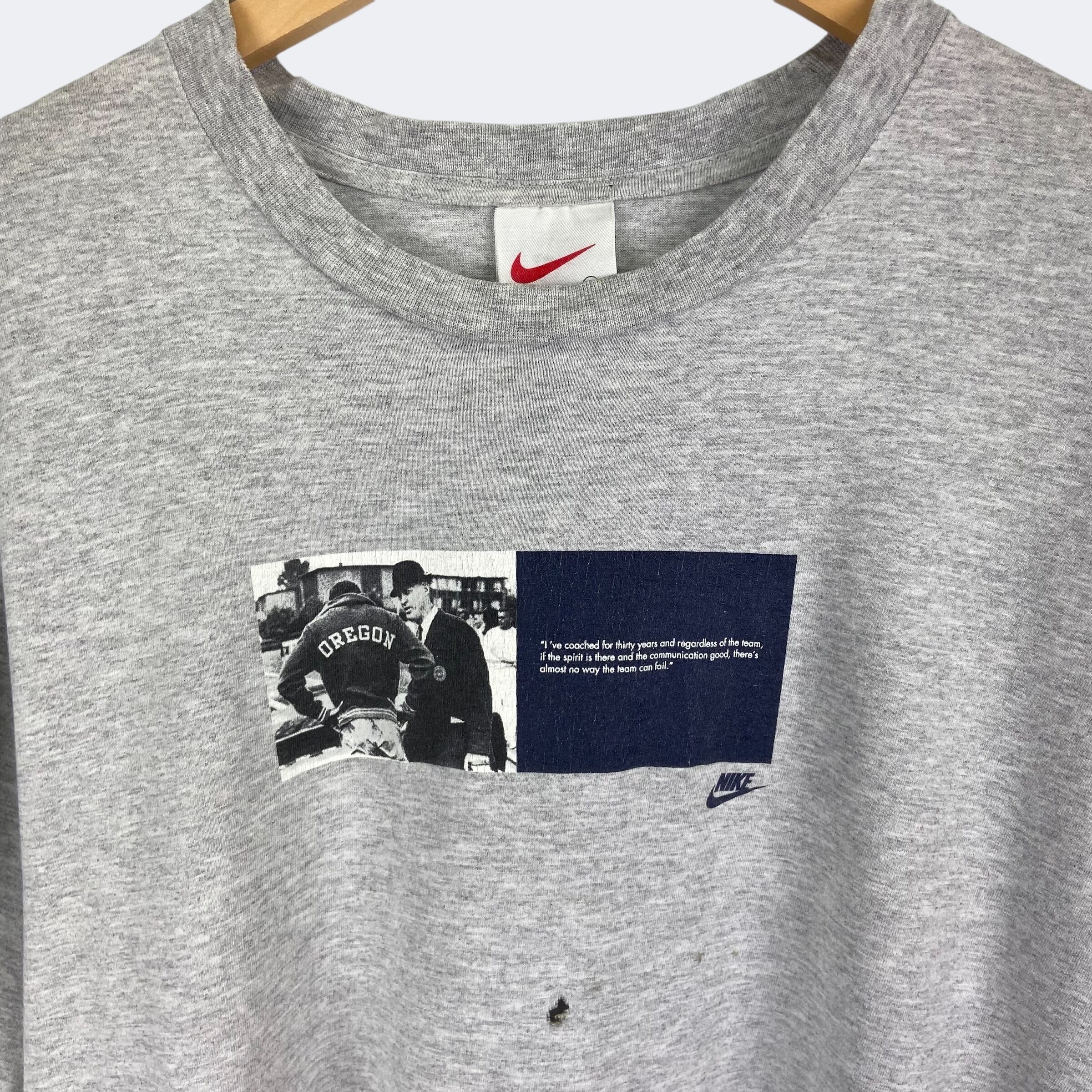 90年代ナイキのTシャツになります。共同創設者であるビル・バウワーマンがオレゴン大学陸上チームのコーチに就任していた頃の写真と、ビル・バウワーマンが実際に残した言葉がフロントにプリントされています。また、バックには1980年にポスターコマーシャルで使用されたスローガン「THE SPIRIT THAT MOVES US.」がプリントされています。ナイキの歴史の一部が落とし込まれた一枚です。
