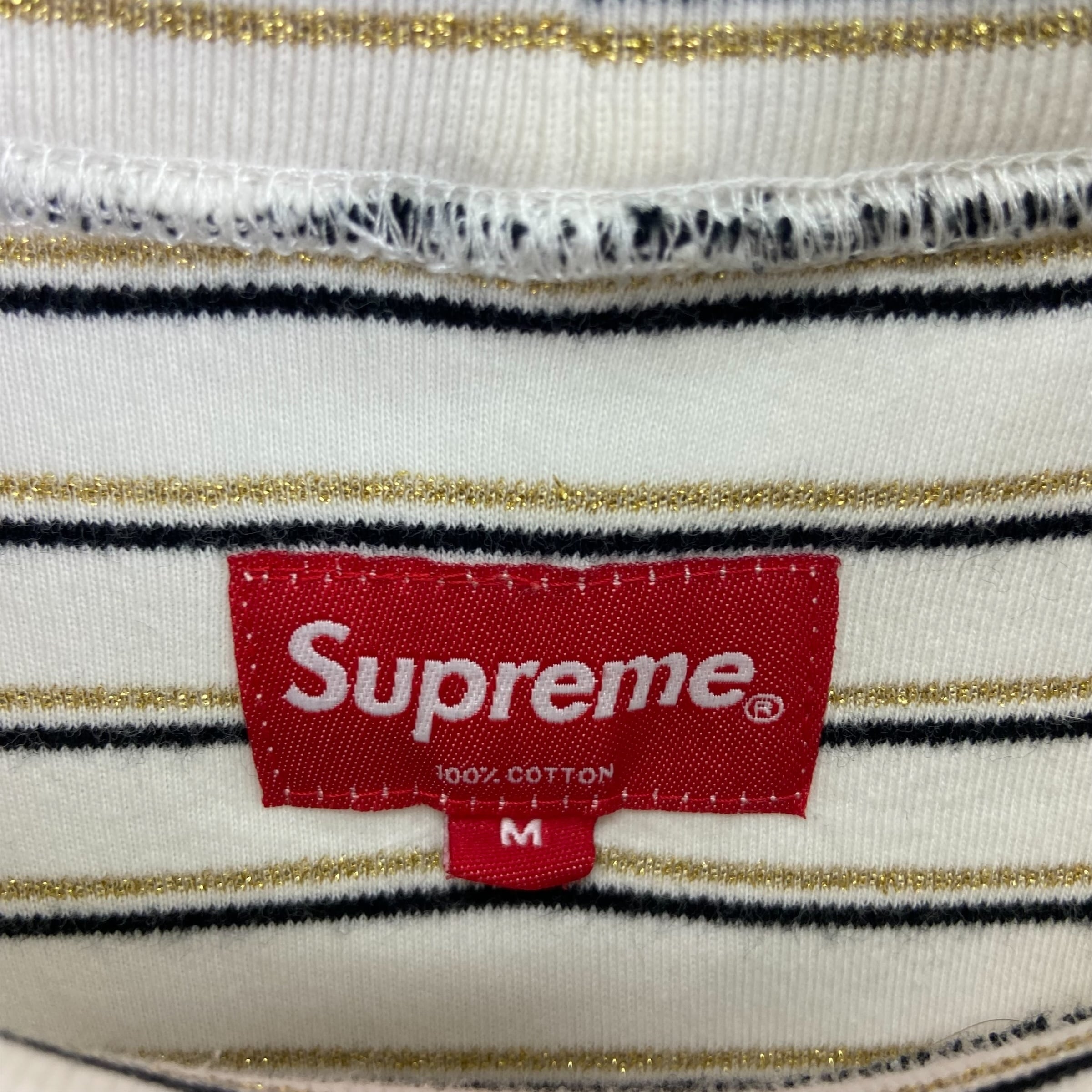 ゴールドとブラックのストライプ(ボーダー)が織りで施されたシュプリームのタートルネックカットソーになります。胸にはSの刺繍が入ります。