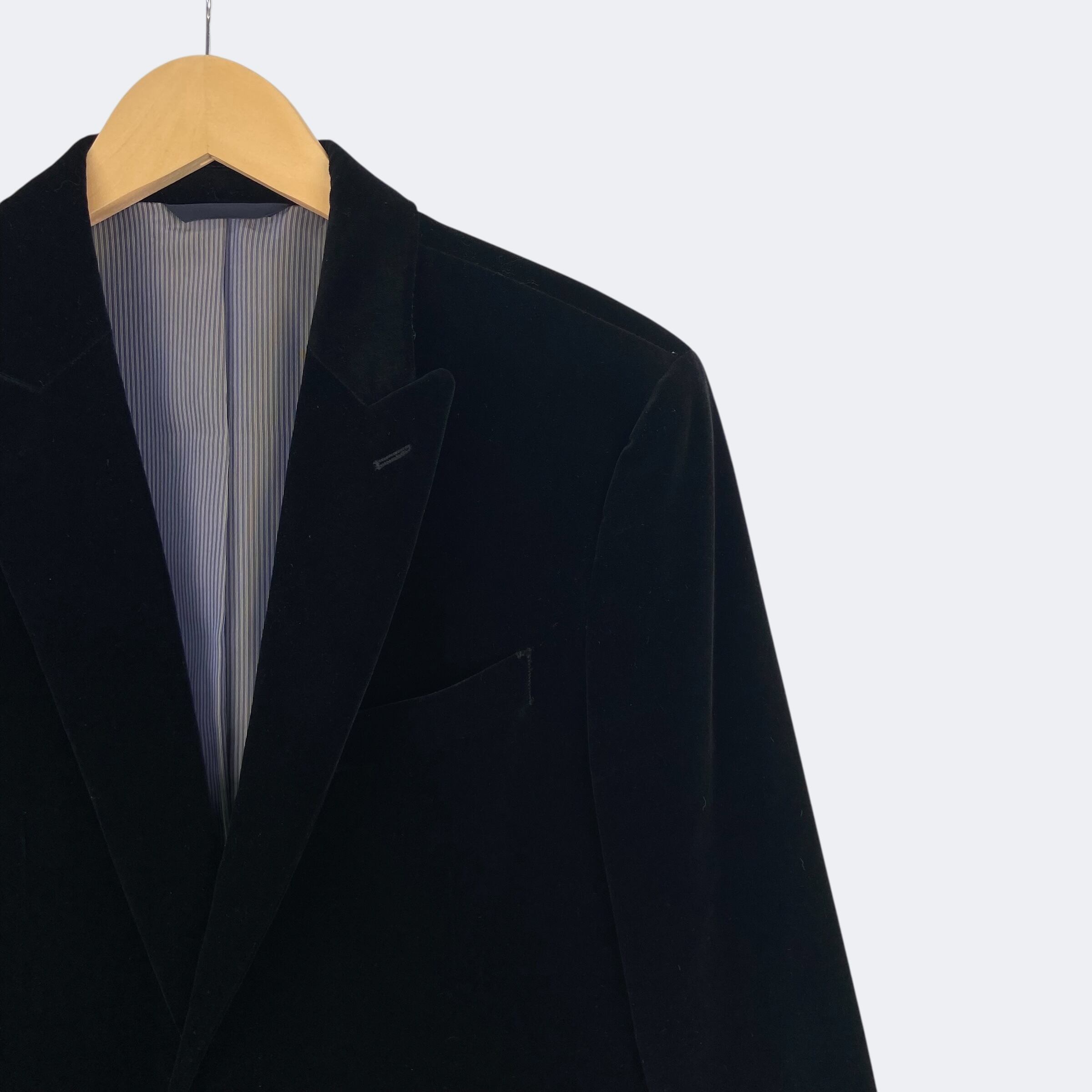 ベルベット素材を使用したバナナリパブリックのテーラードジャケットになります。1ボタン仕様になり、ボディ裏地、ポケット裏地には共通のストライプ生地が施されています。