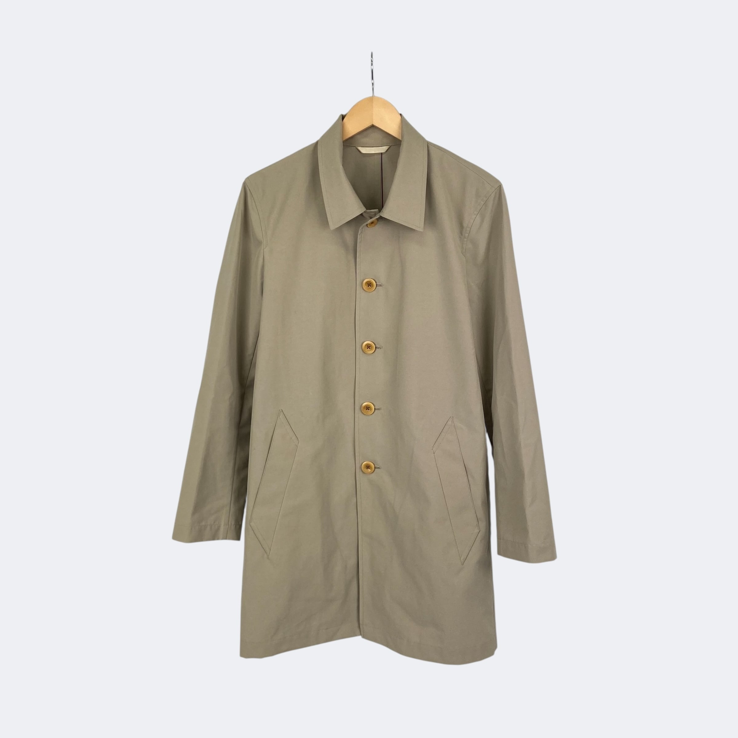最高品質の素材と職人技を用い、英国の伝統スタイルにアーティスティックな感性を融合させたポール・スミスブランドの上位ライン、ポール・スミスコレクションのコートになります。ポリエステルとコットンの混紡生地を使用し、裏地にはキュプラが施されています。内ポケット玉淵部分には花柄の生地が使用されているため、アクセントになっています。