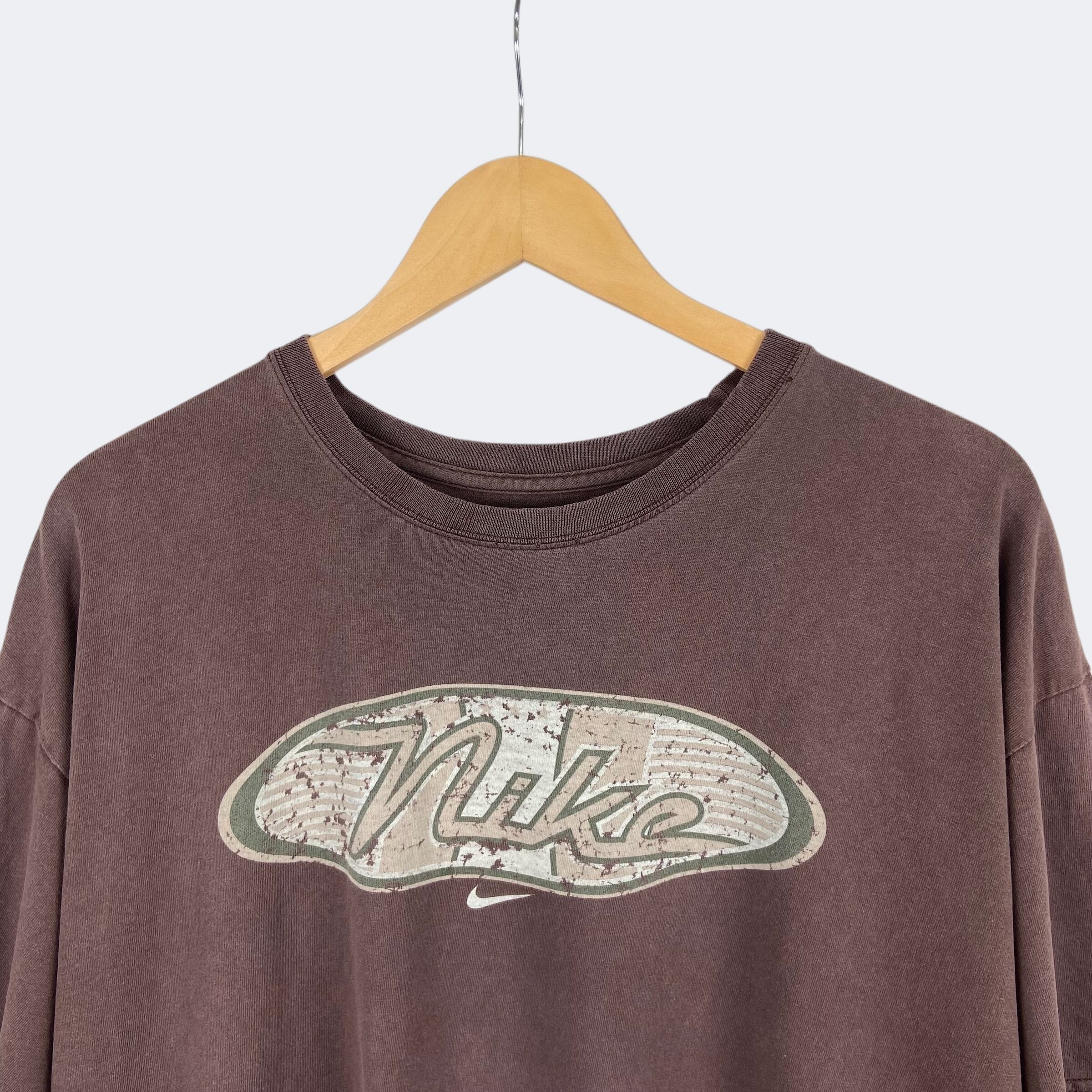 擦れた風合いのグラフィックとスウォッシュが染み込みプリントされたNIKEのTシャツになります。