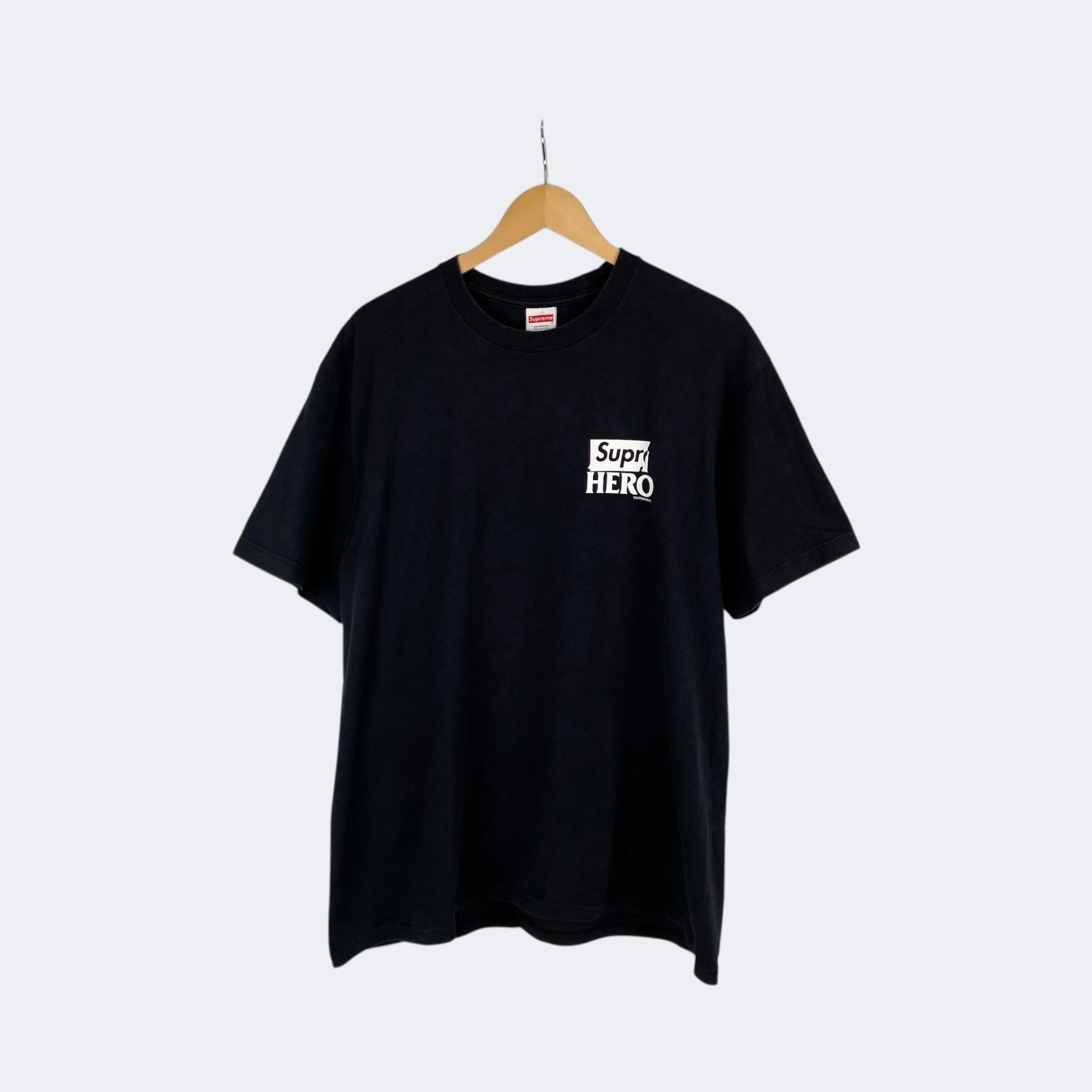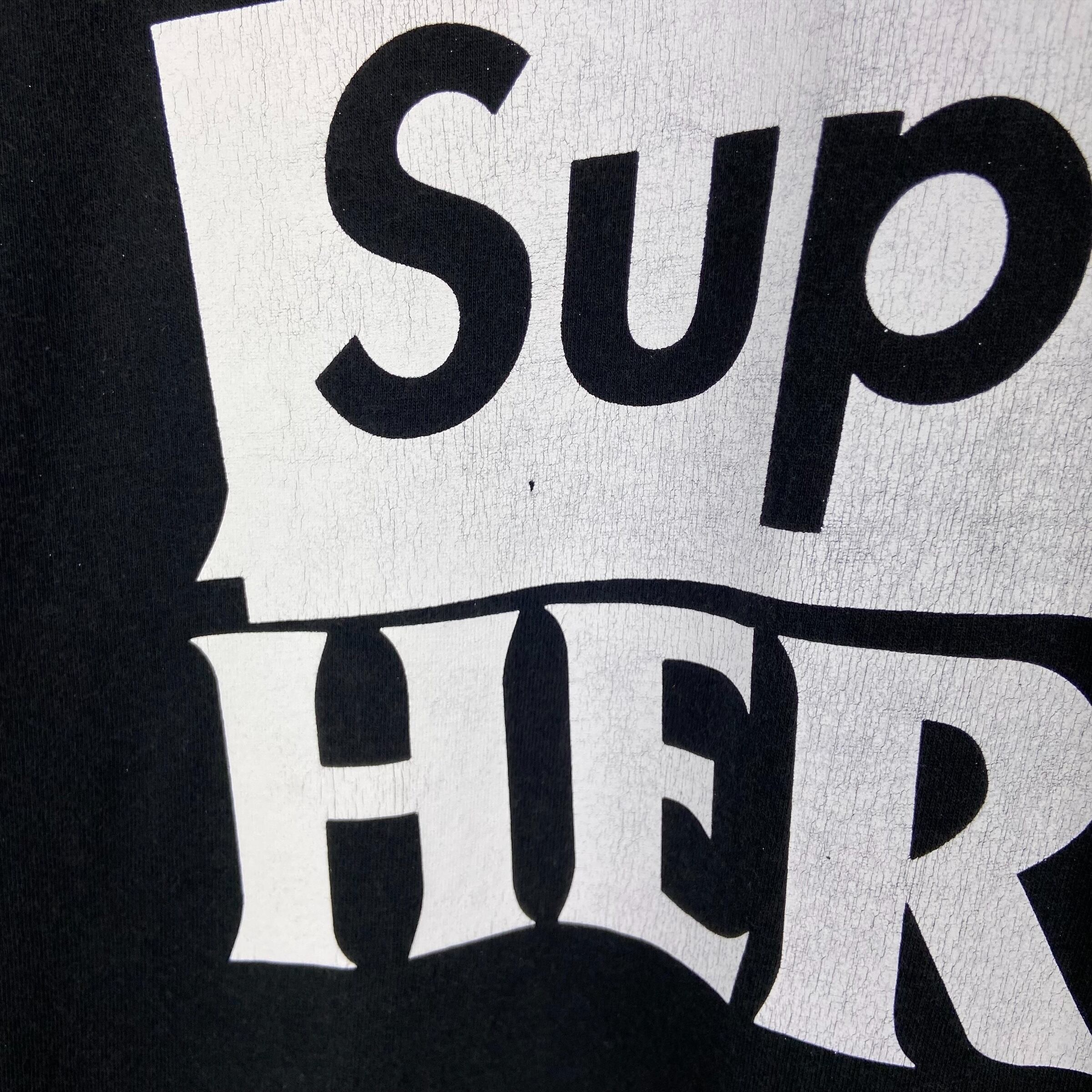 シュプリームとスケートブランドのコラボの中でも特に人気の高いアンタイヒーローとの4回目のコラボレーションアイテムです。バックにスーパーヒーローロゴとDog Humpを組み合わせたコラボロゴが大きくプリントされ、フロント左胸にはコラボロゴがワンポイントとして入ります。