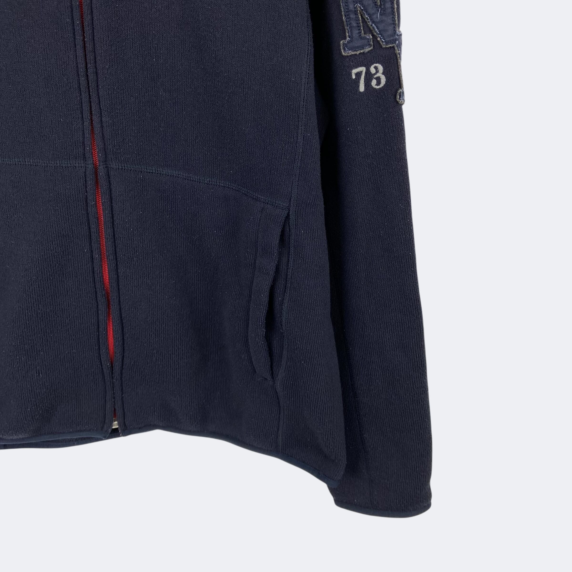 ニットの風合いを持つ素材を使用したティンバーランドのジップフーディーになります。裏地はフリースになるため保温性に優れ、胸、袖部分に刺繍とワッペンが施されています。トップスでもジャケットのインナーとしても活躍する1着です。