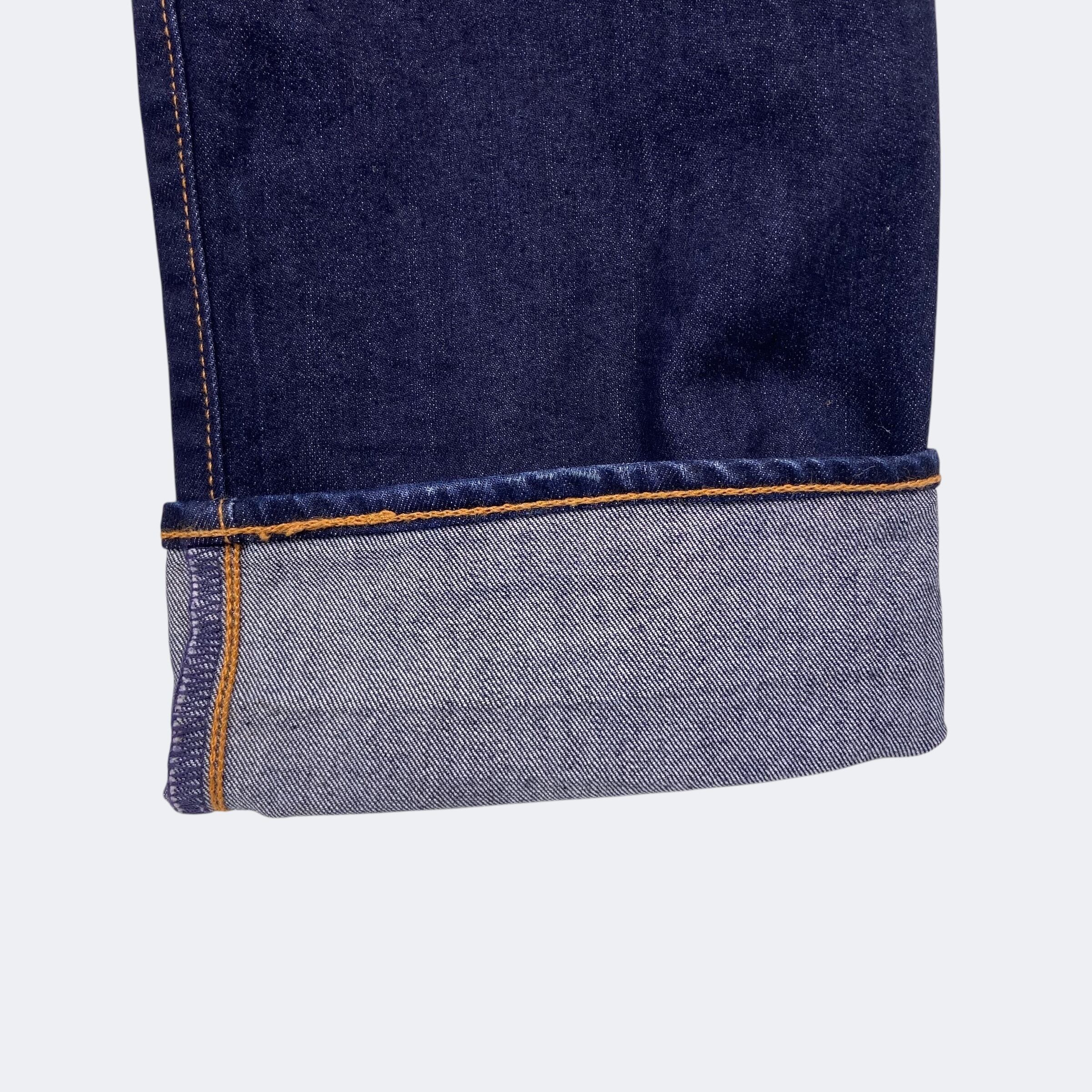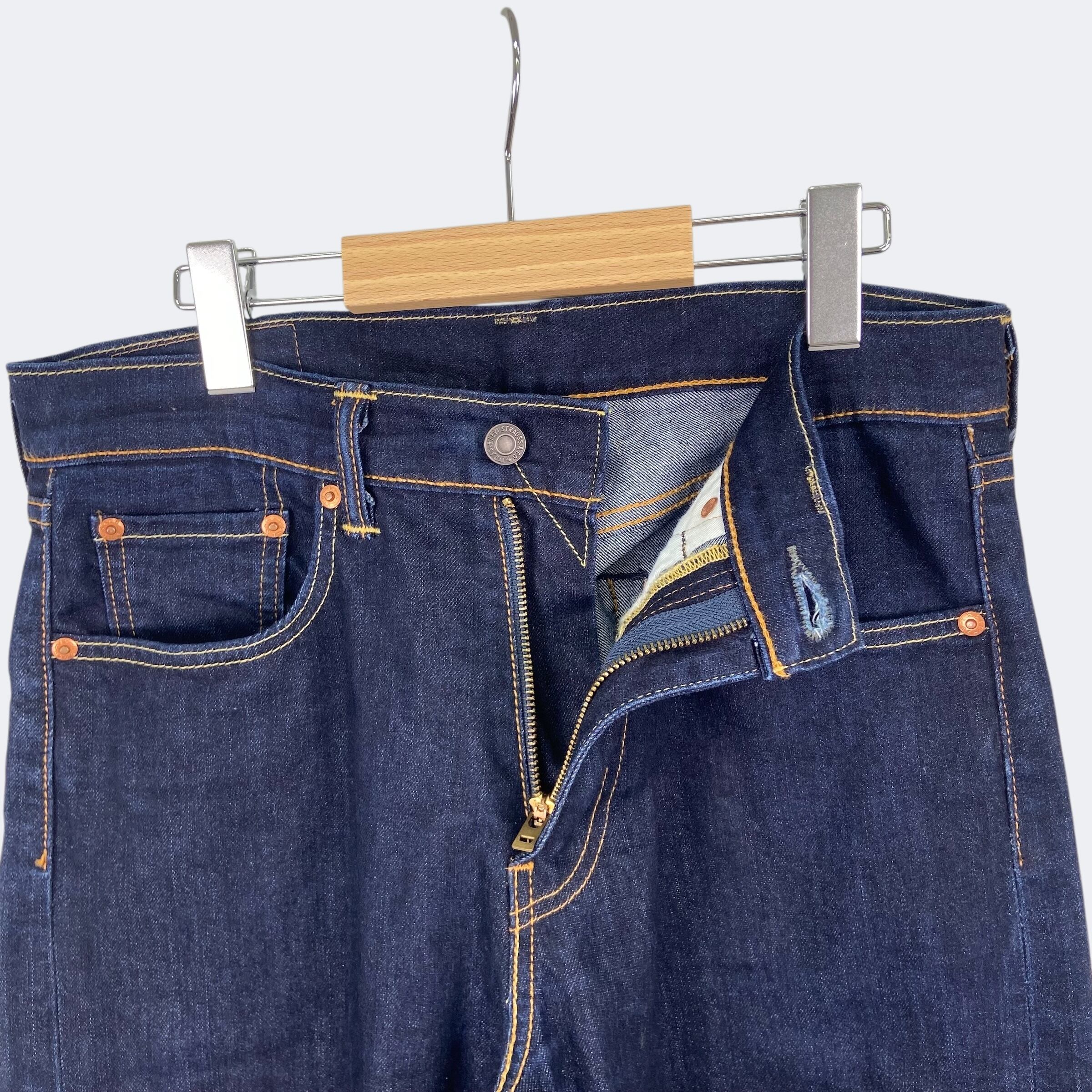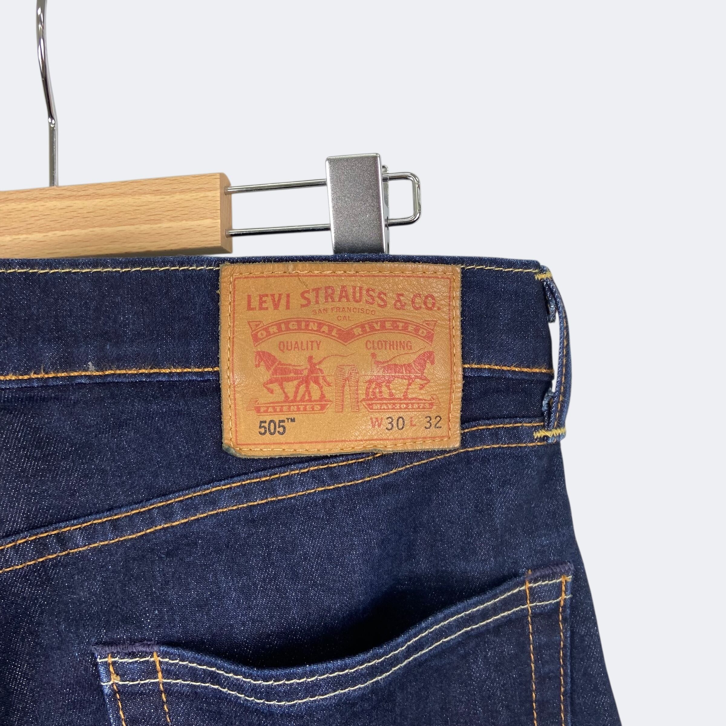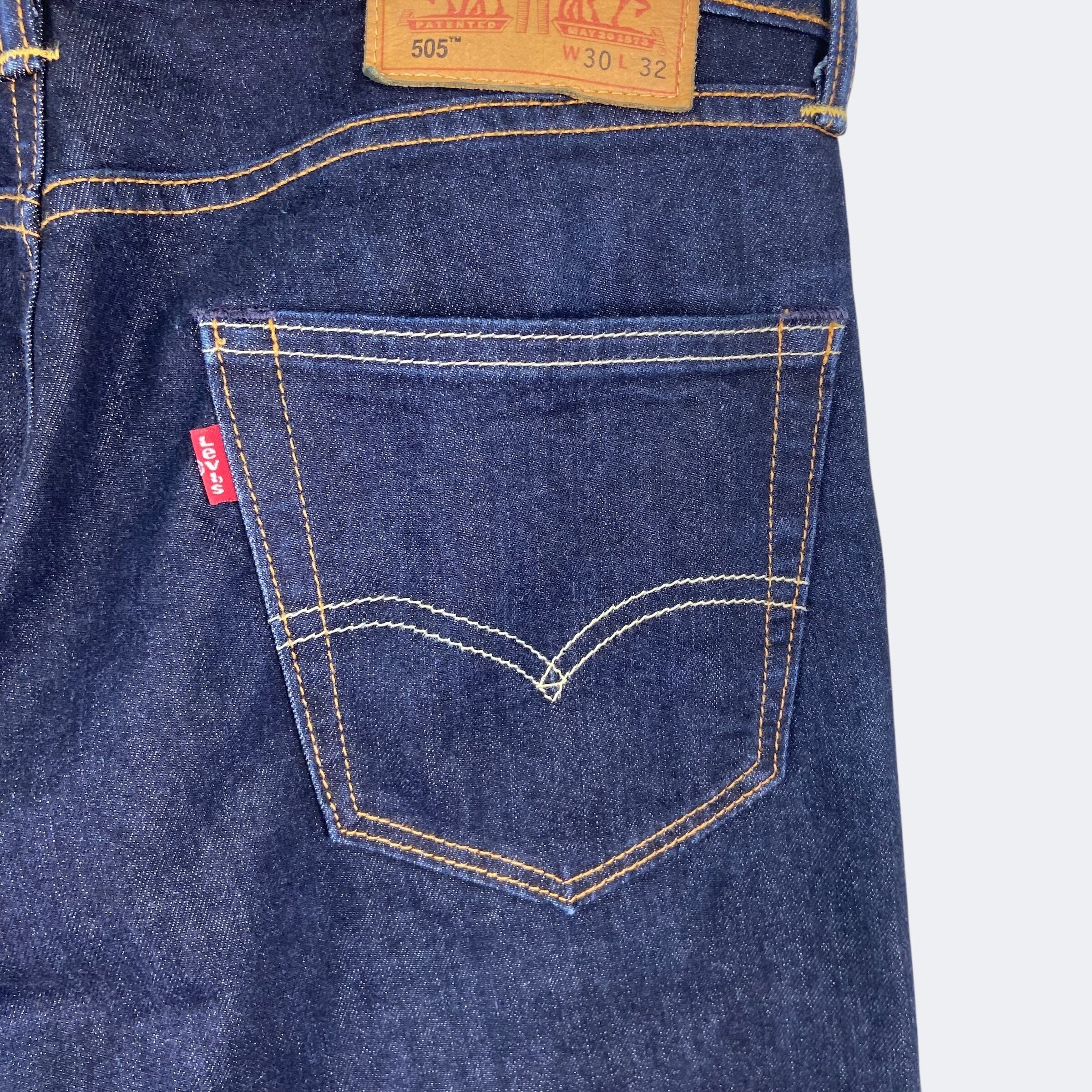 リーバイス505 ダークインディゴデニムパンツ。濃紺色になるため合わせやすく、流行り廃りなく着用いただけます。前開きはジップフライになり、バックにはレザーパッチが付きます。