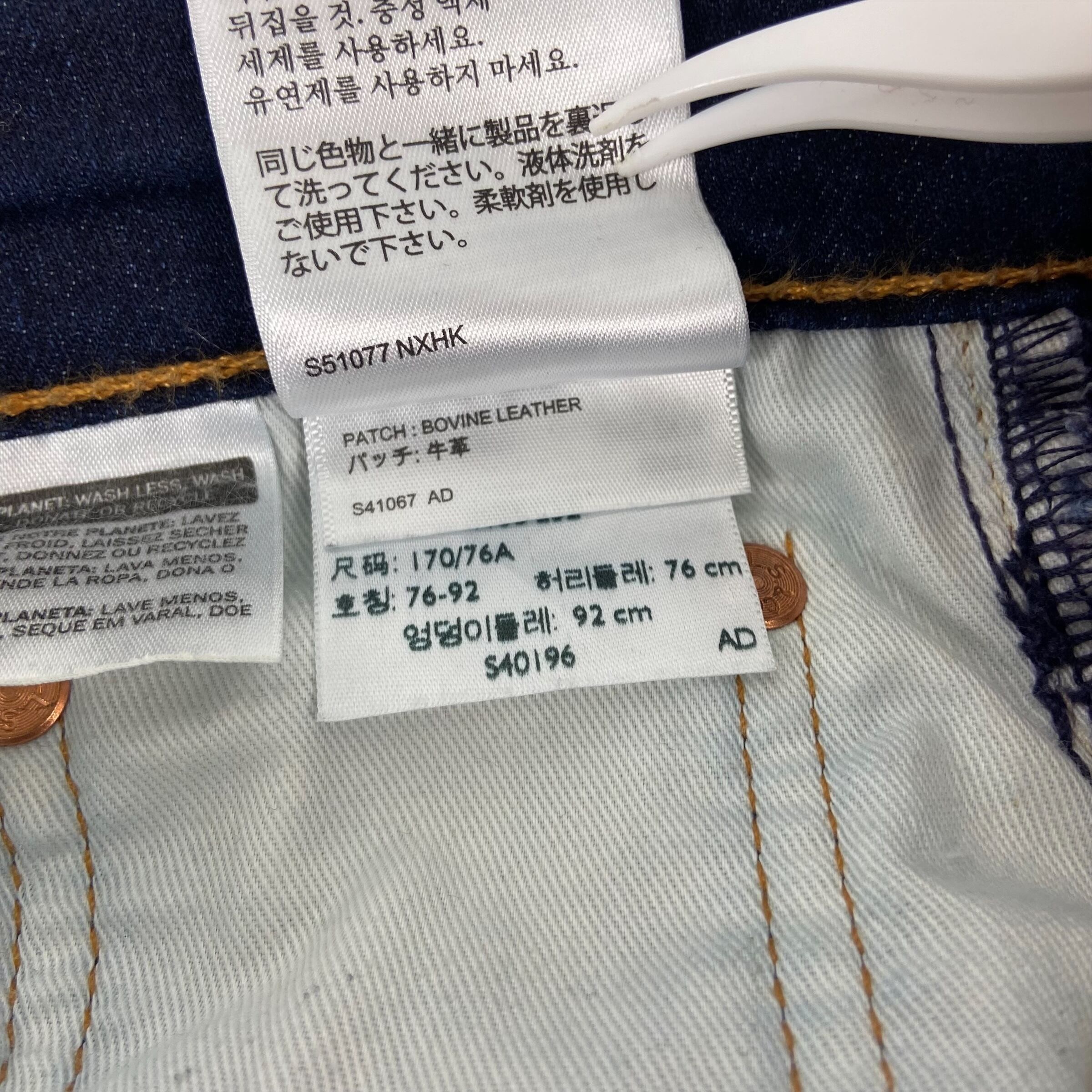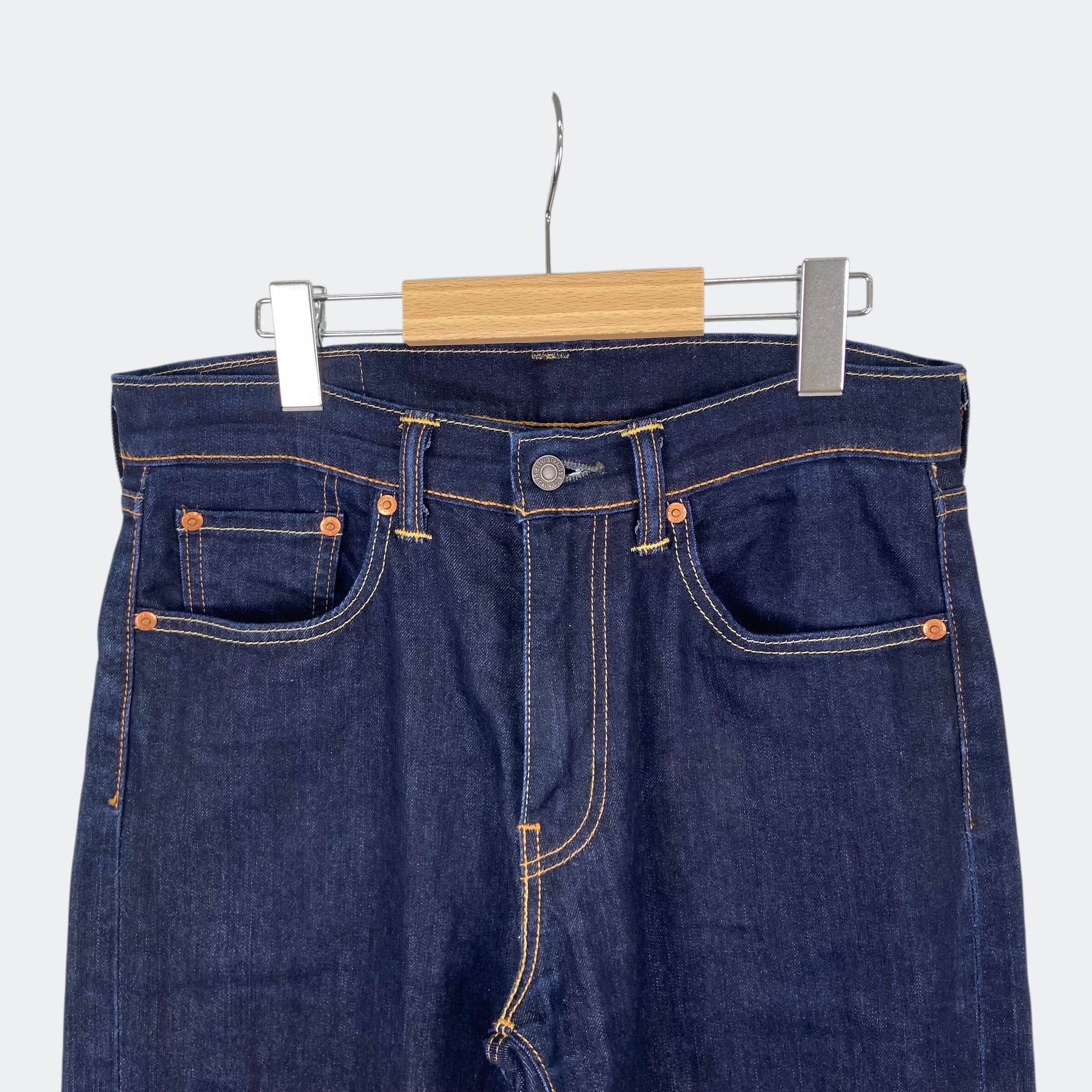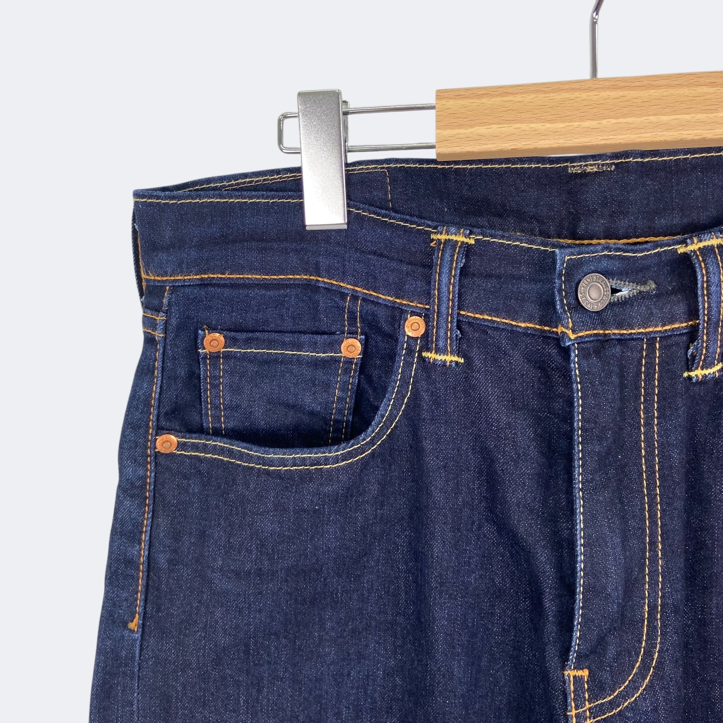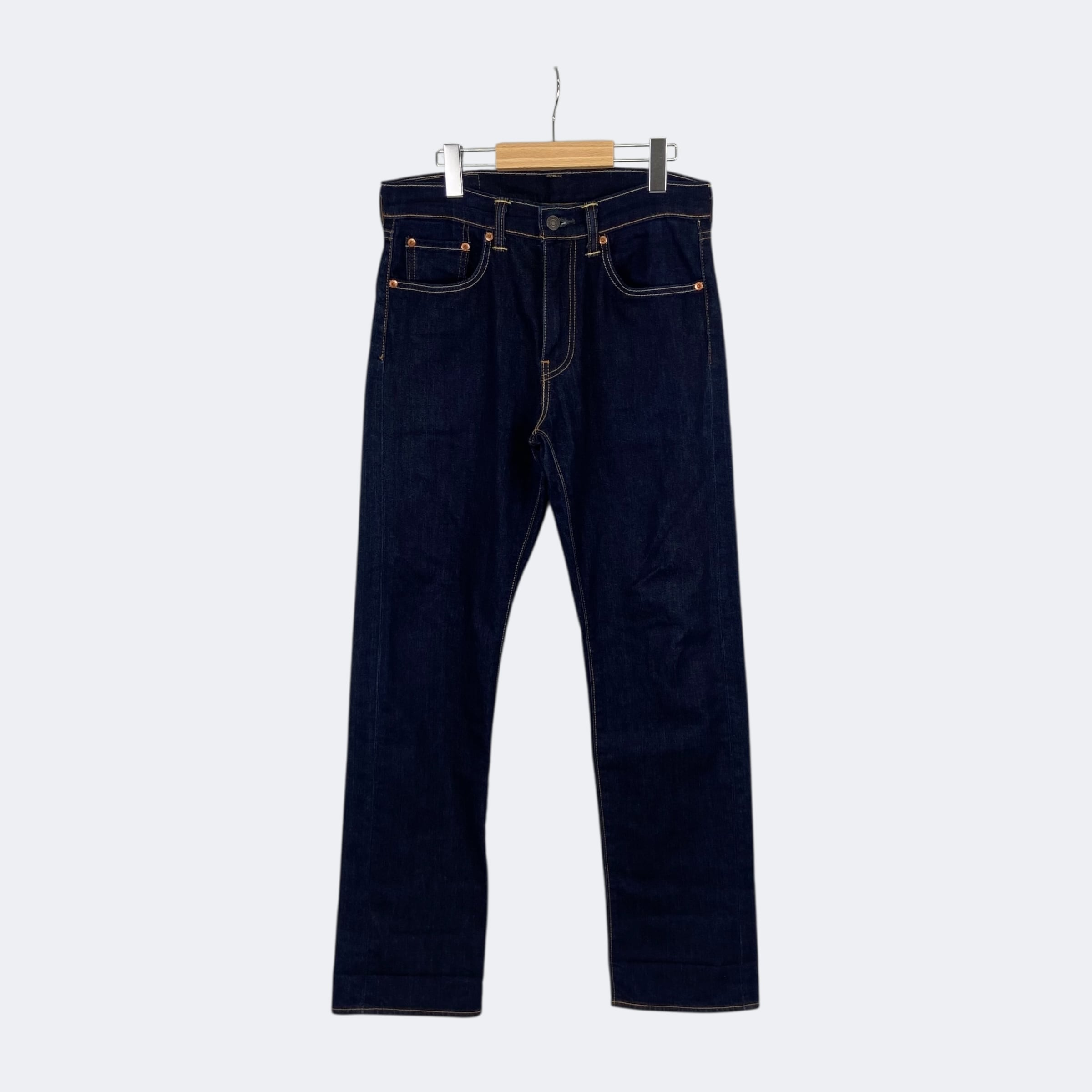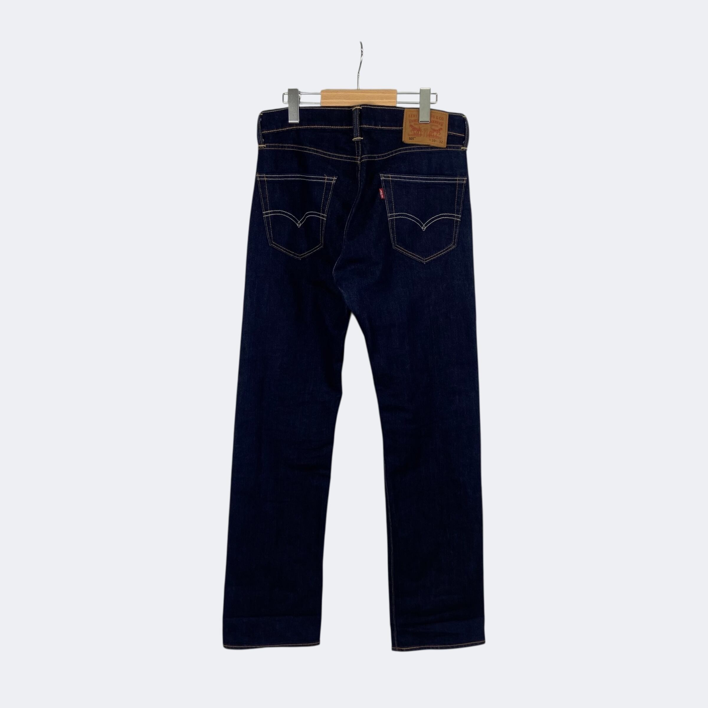 リーバイス505 ダークインディゴデニムパンツ。濃紺色になるため合わせやすく、流行り廃りなく着用いただけます。前開きはジップフライになり、バックにはレザーパッチが付きます。