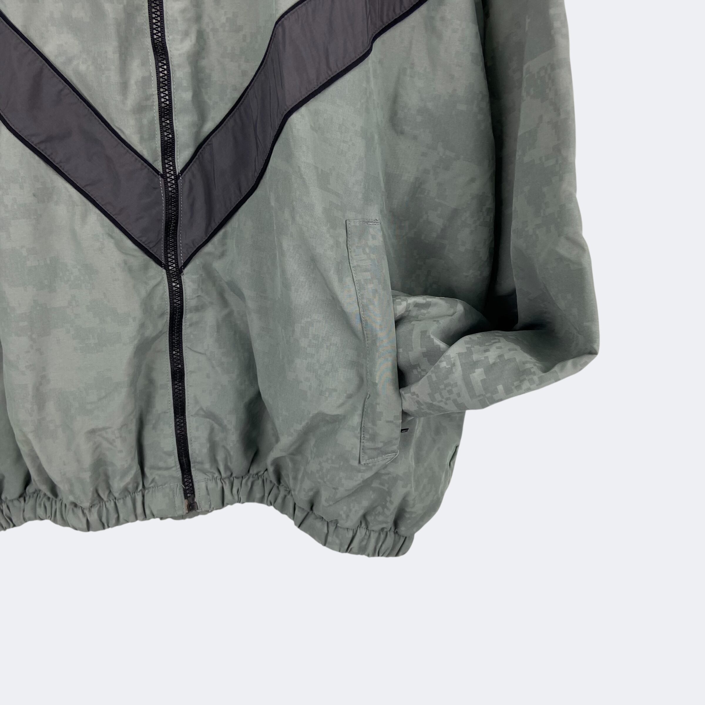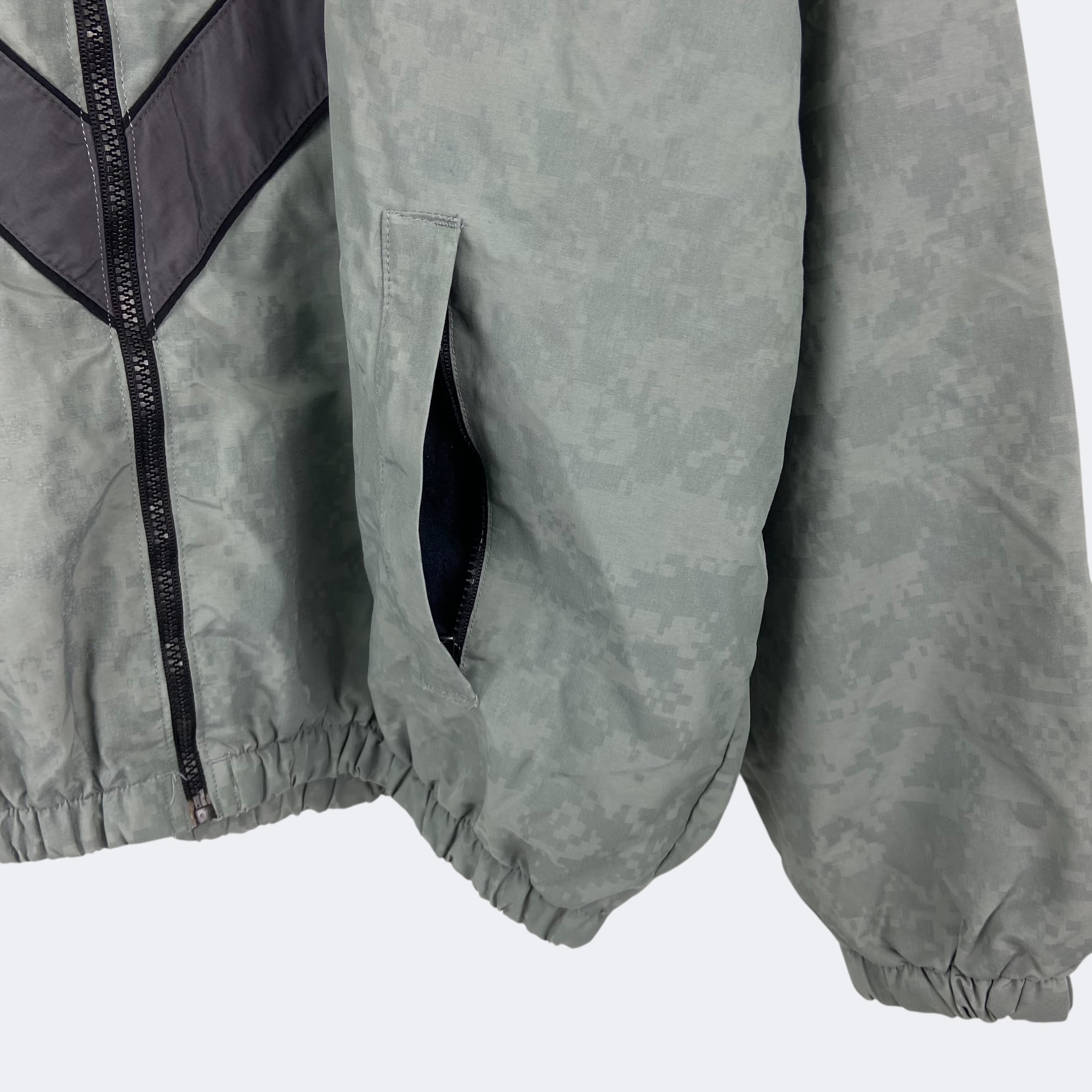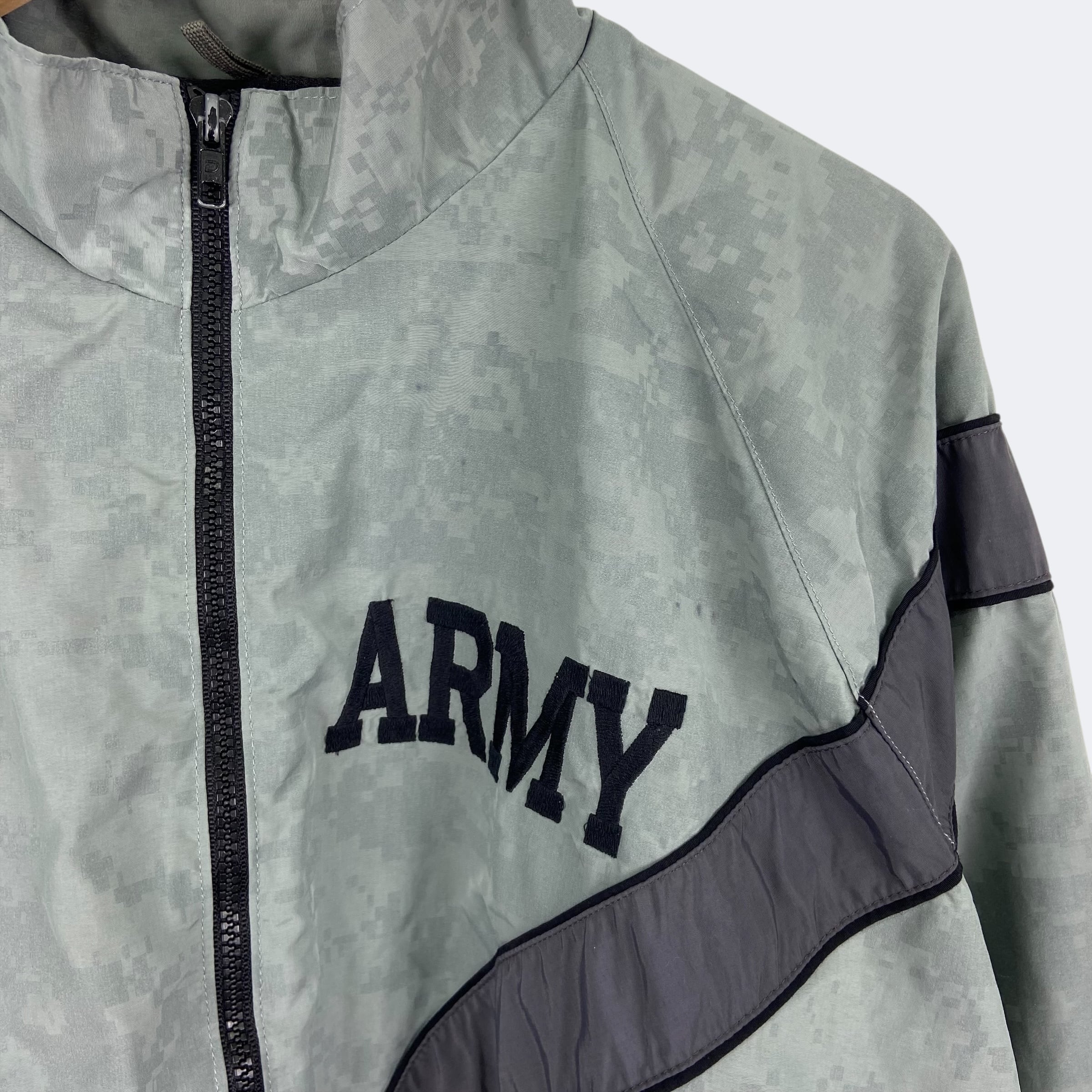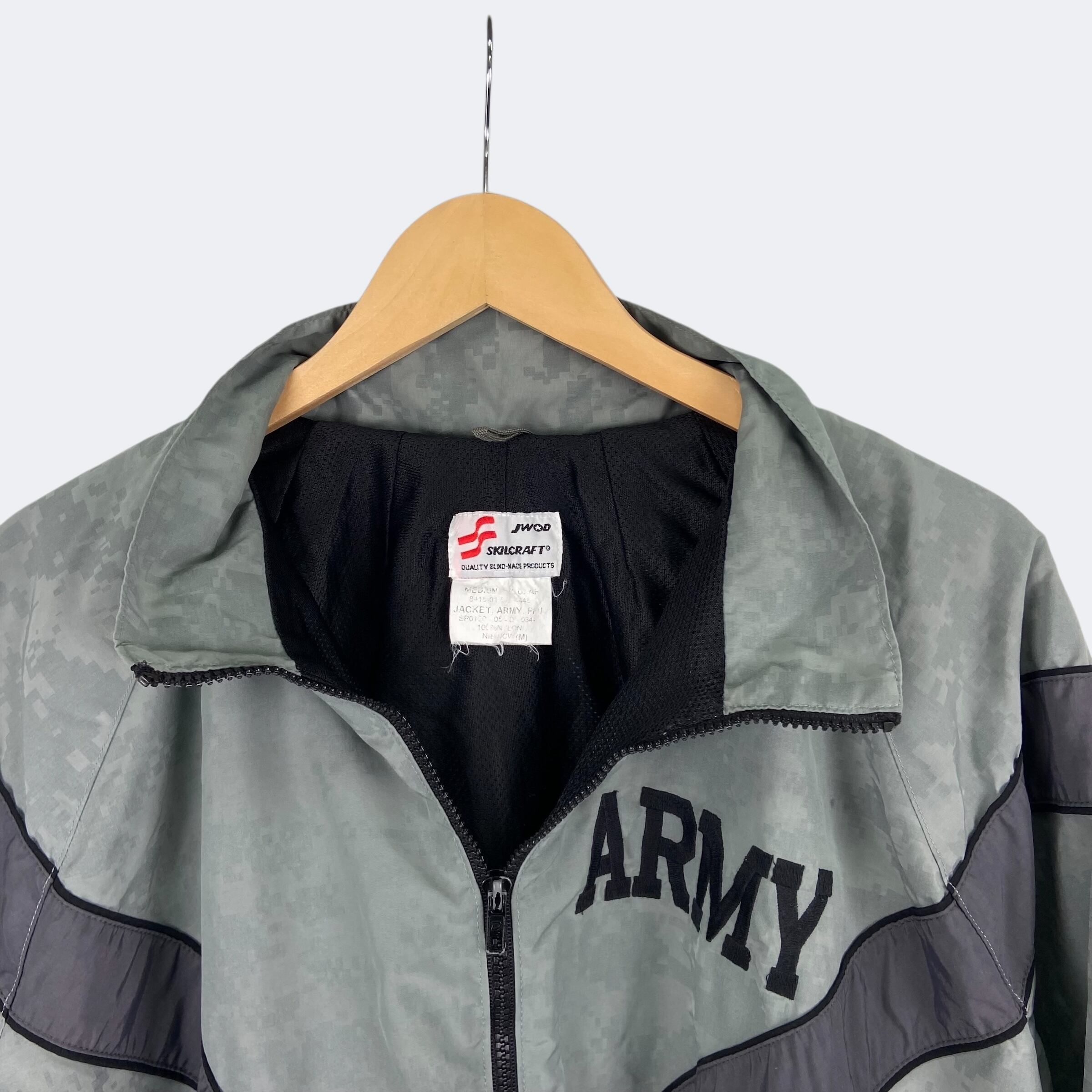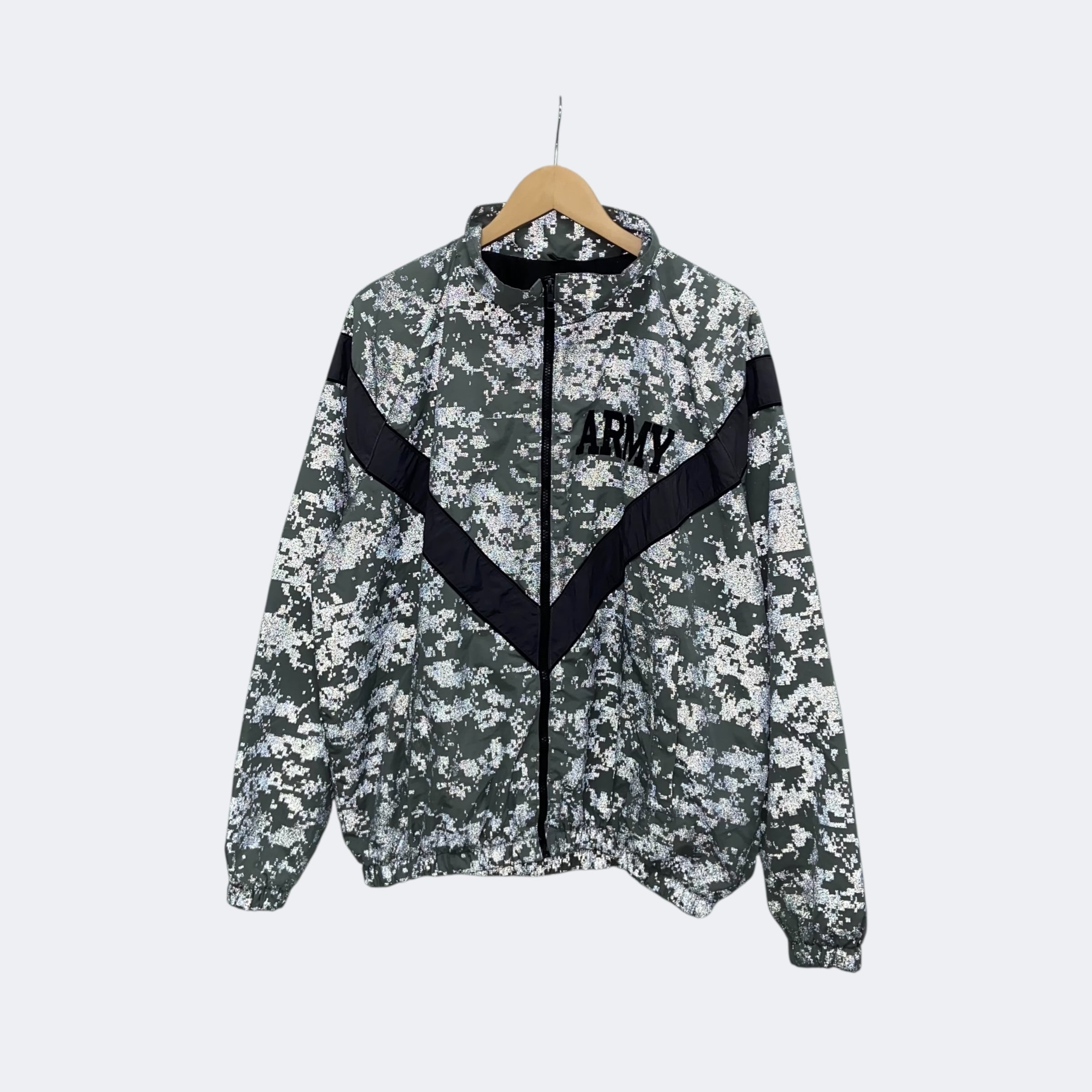 米陸軍にてトレーニング時に着用するジャケット、通称PFUのナイロンジャンパーになります。シャリ感のある素材に胸のVライン切替と胸にはARMYの文字が刺繍されており、ボディにはリフレクタープリントでデジタルカモ柄が表現されています。また、裏地にはメッシュ生地を使用し、脇下とバック切り替え部分はベンチレーションが施されています。バックブルゾンシルエットなので羽織りやすくスタイリングしやすい1着です。