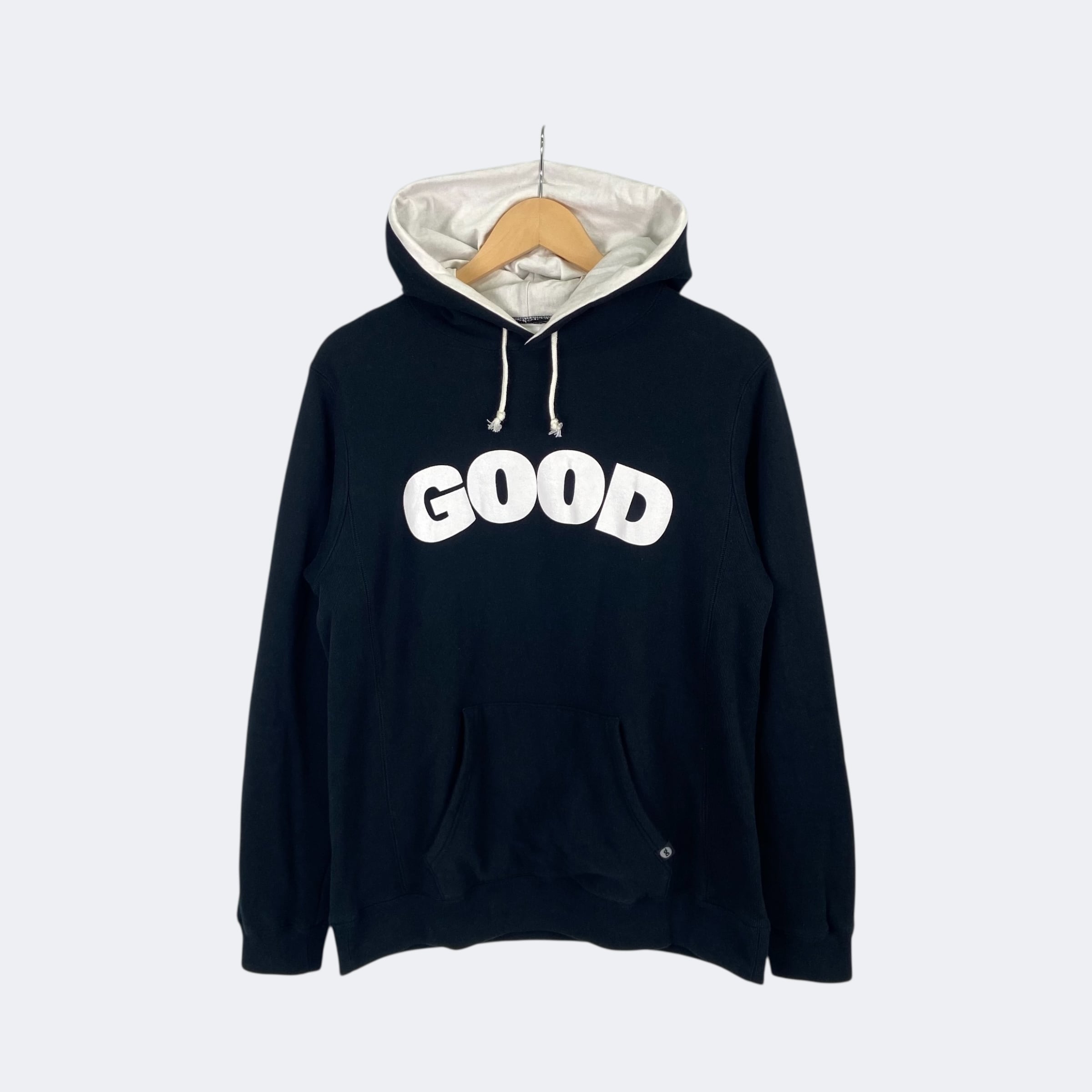 2012年 A/Wシーズン(2013年の初売り)で発売されたGOODENOUGH GOOD E REVERSE HOODY GE-124101になります。フロントに"GOOD"、バックに"E"の文字がプリントされており、カンガルーポケットにはタグが付きます。