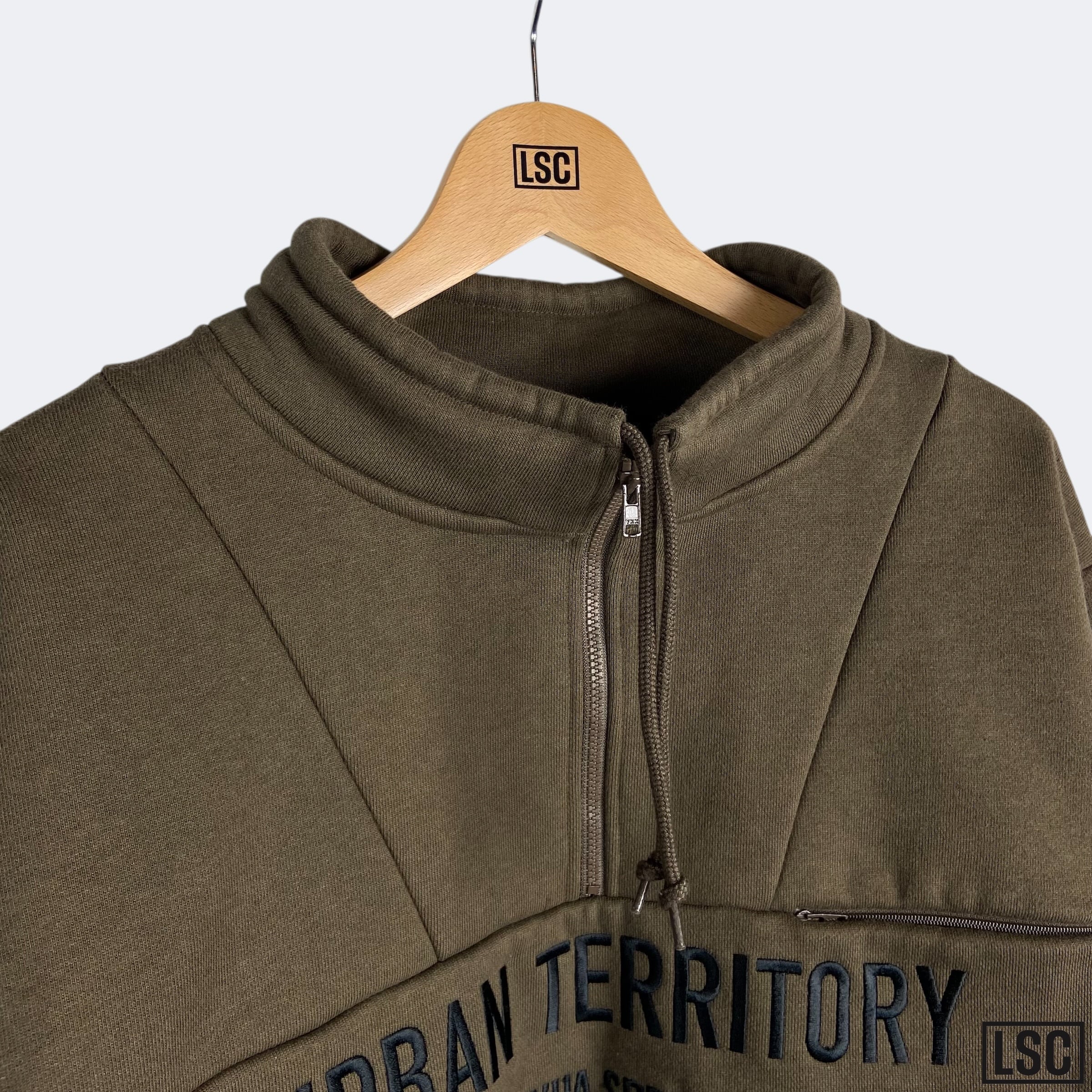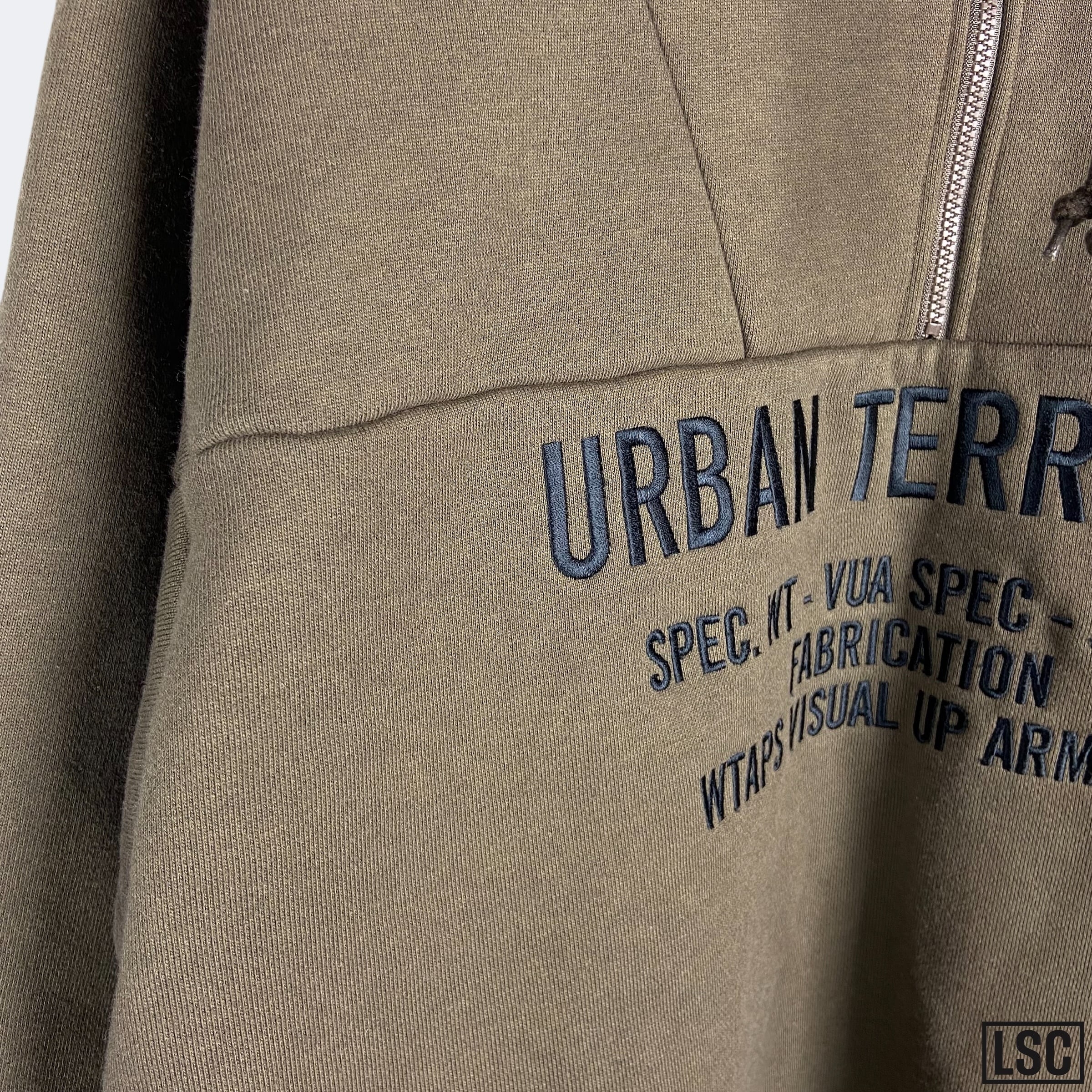 やや厚手のコットン/ポリエステル混紡の裏起毛素材をパネル形状に切り替えたスウェットシャツ。モックネックのハーフジップ仕様になり、胸元にURBAN TERRITORYの刺繍が施されています。右裾にブランドロゴの織りネーム、左裾脇にピスネームが付きます。