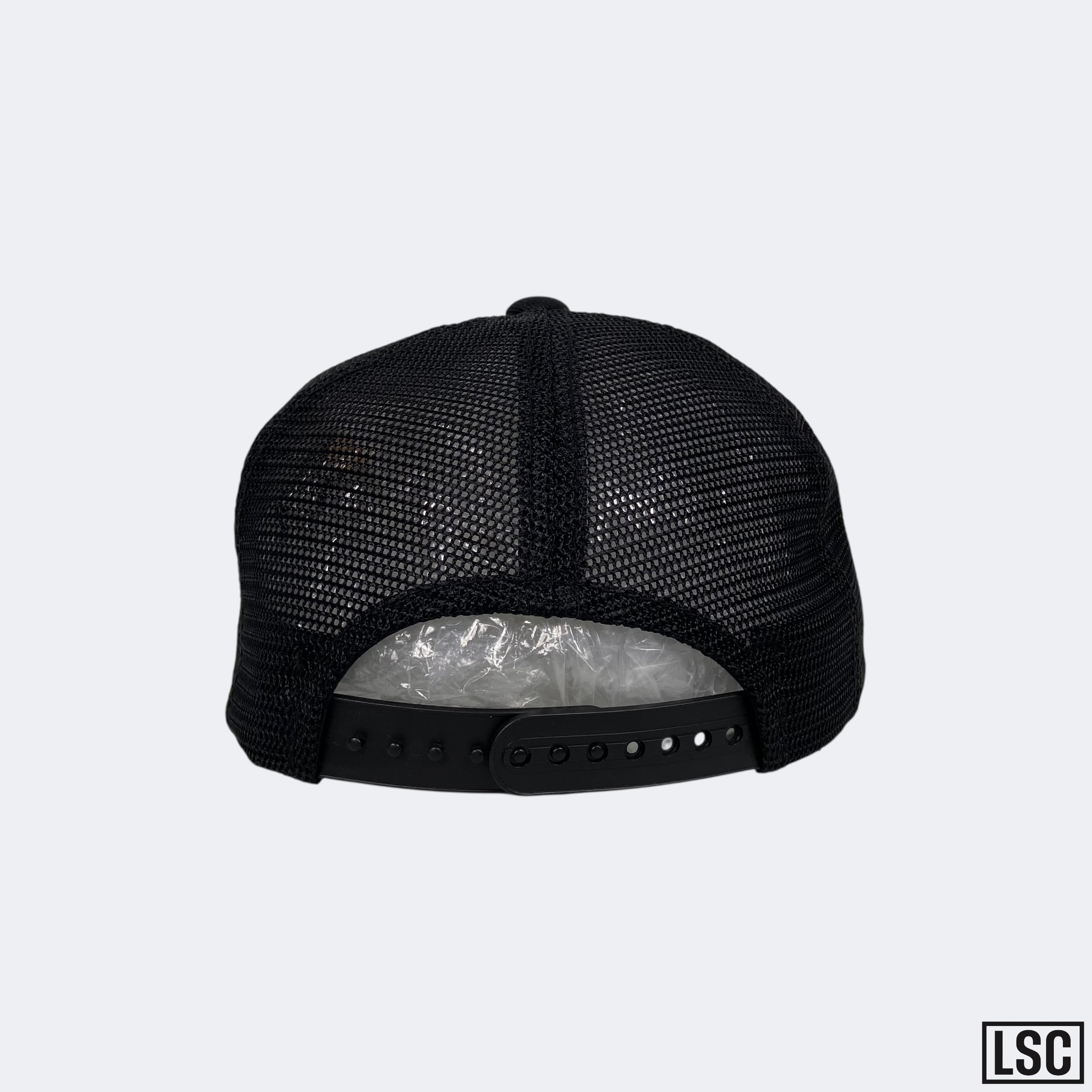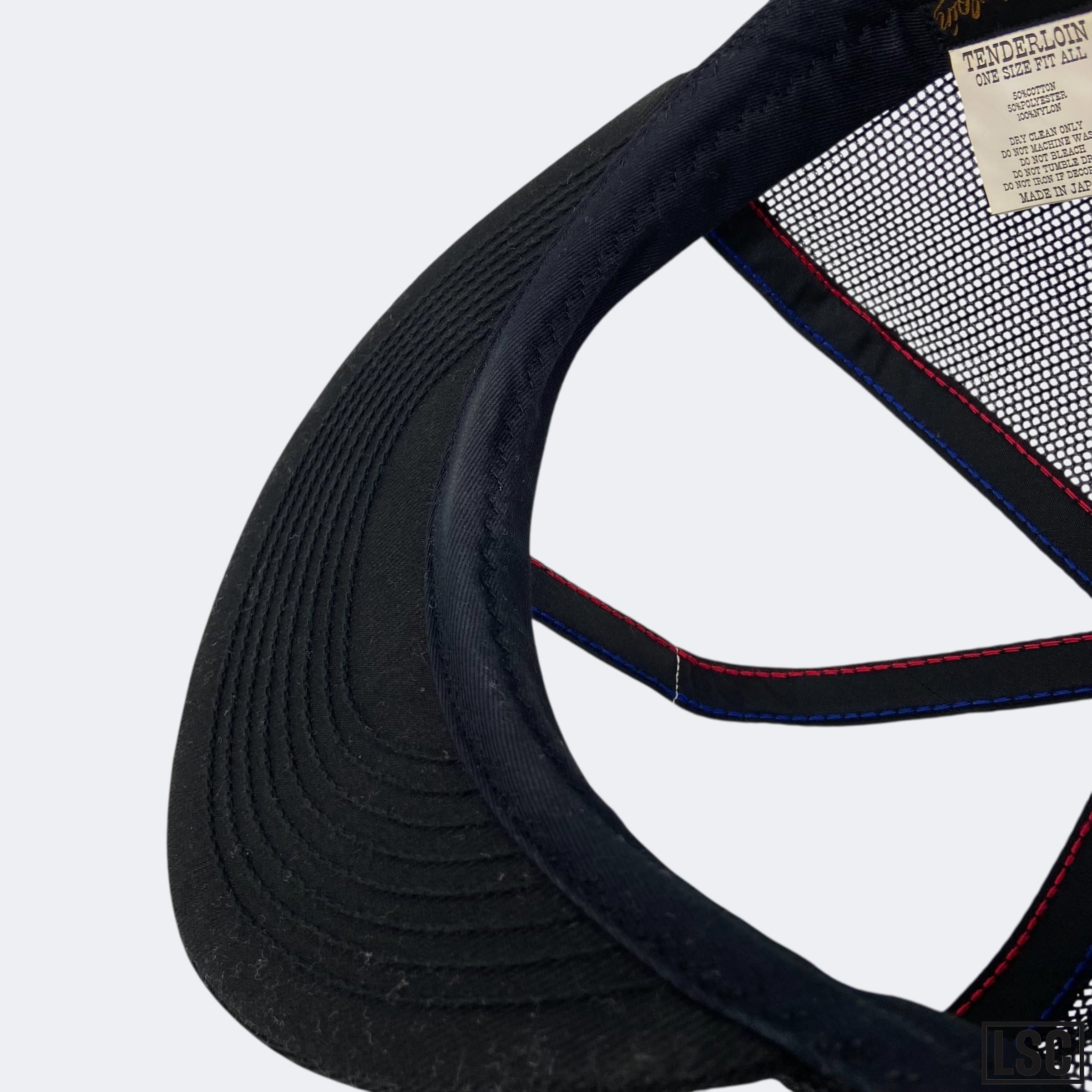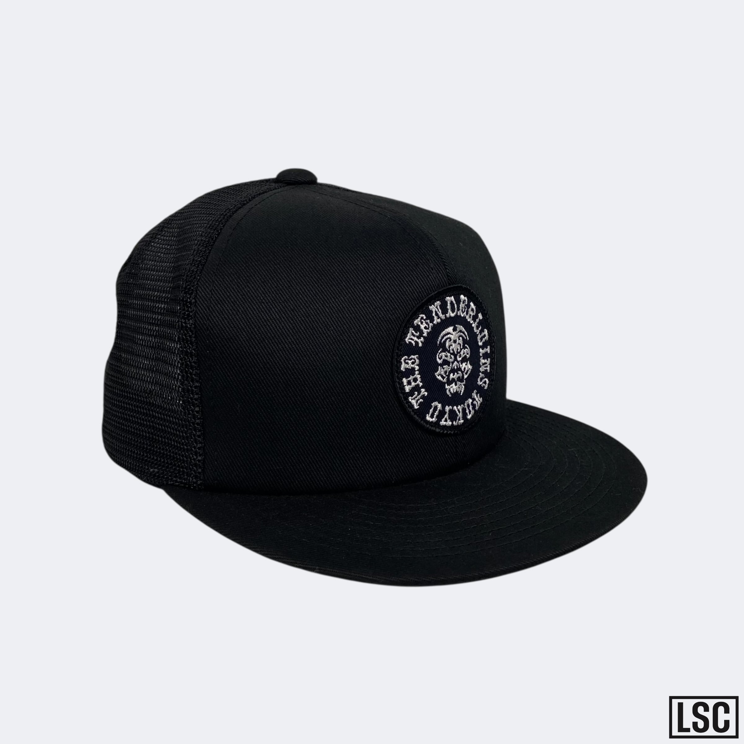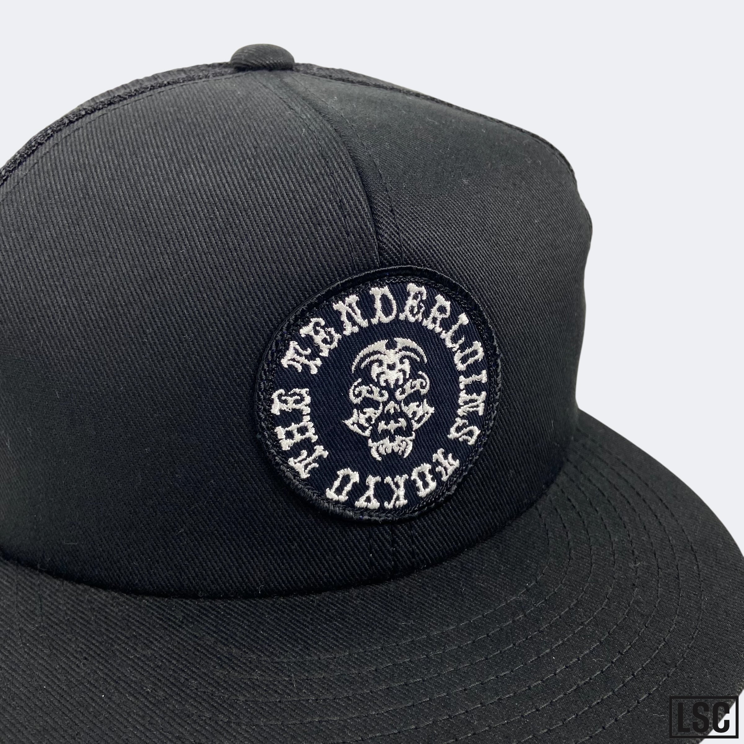 ボルネオスカルの刺繍ワッペンが施されたテンダーロインのトラッカーキャップ。6パネル仕様になり、アジャスターでのサイズ調整が可能です。