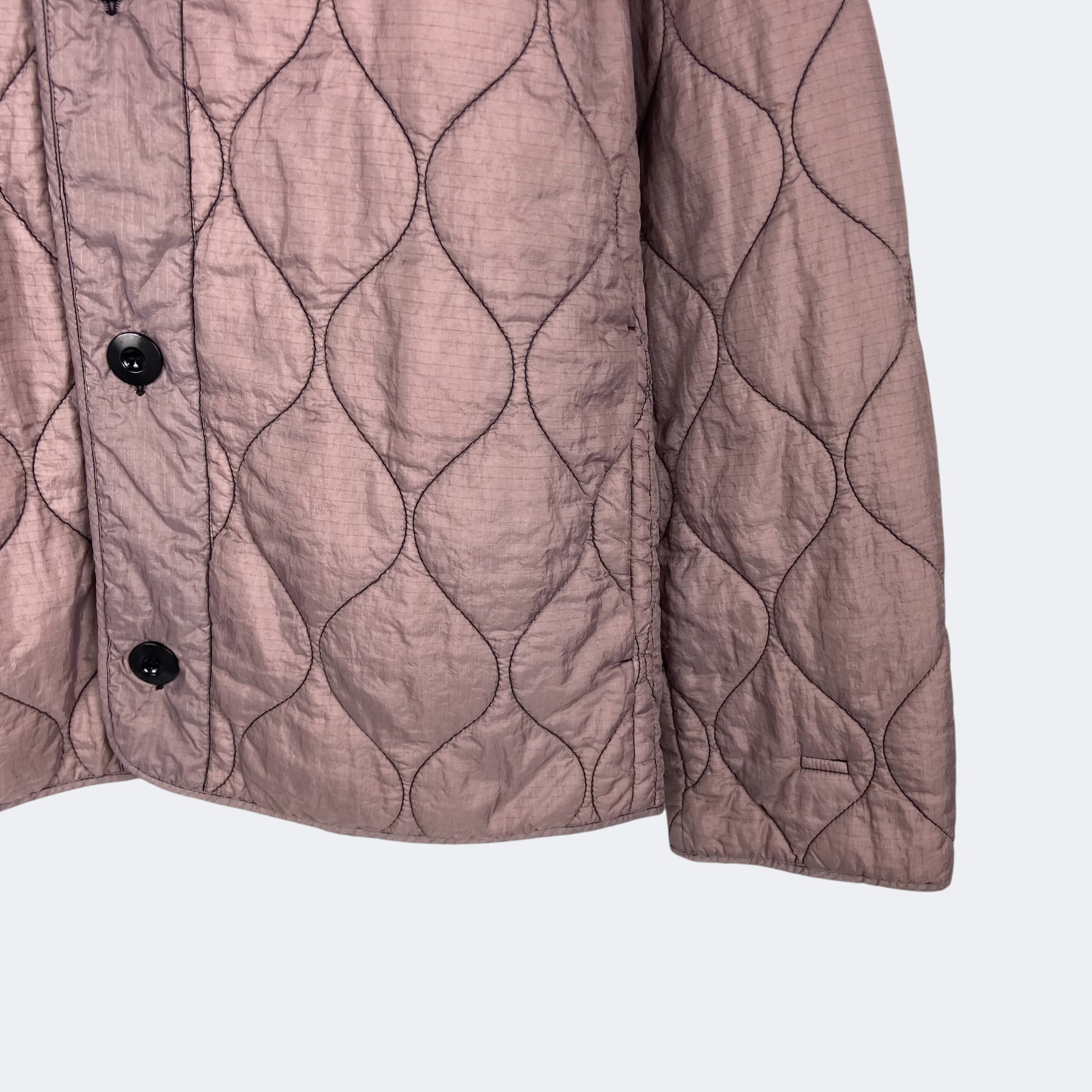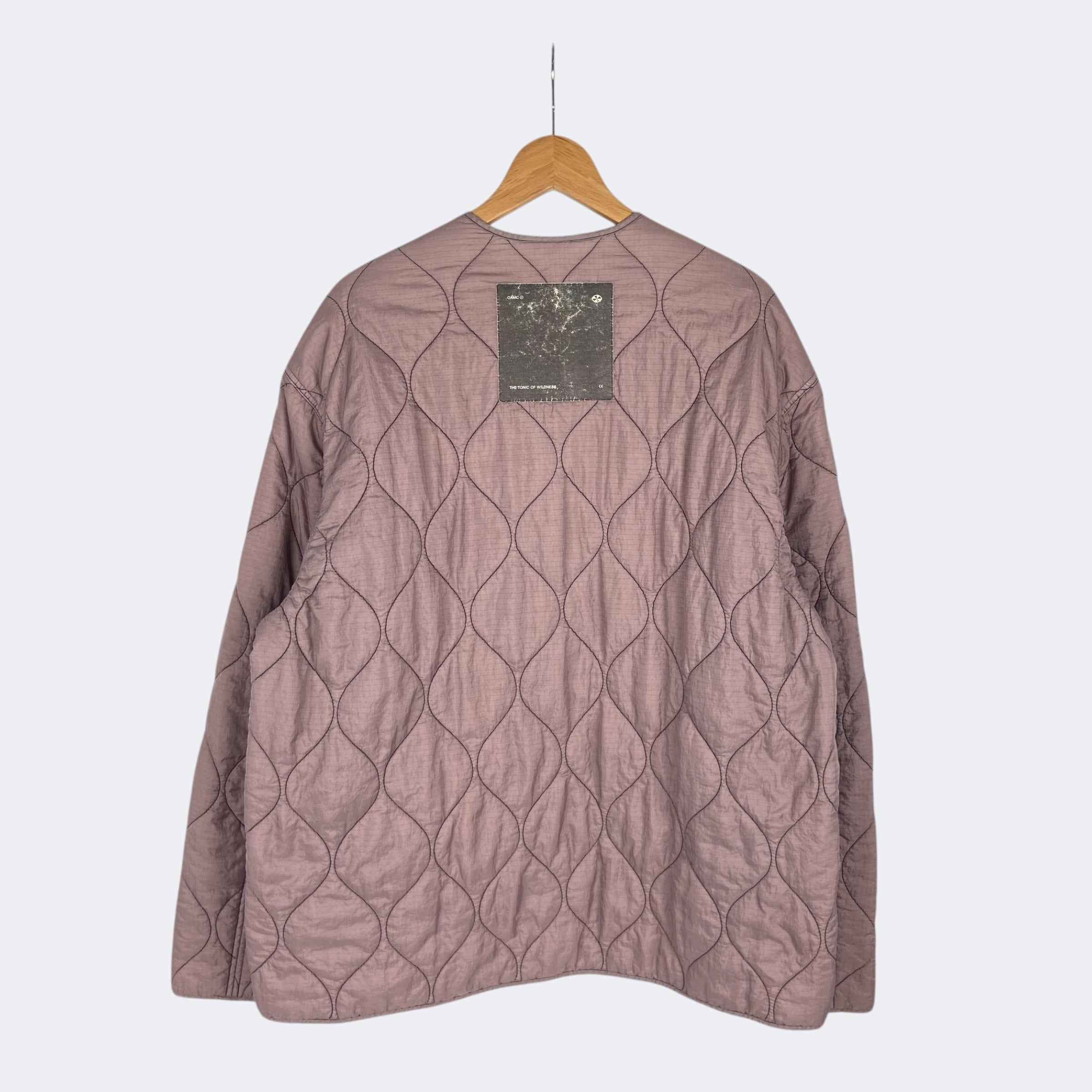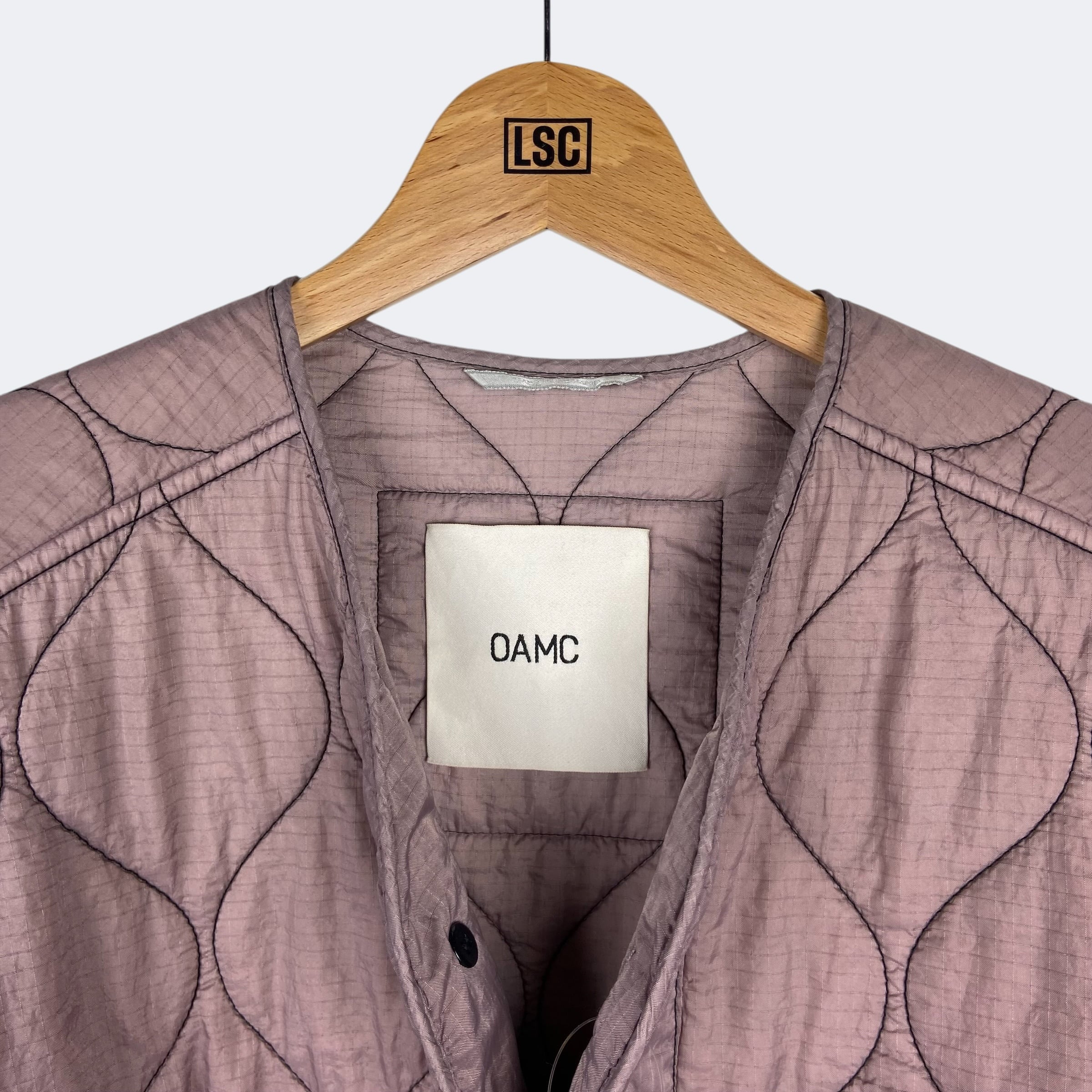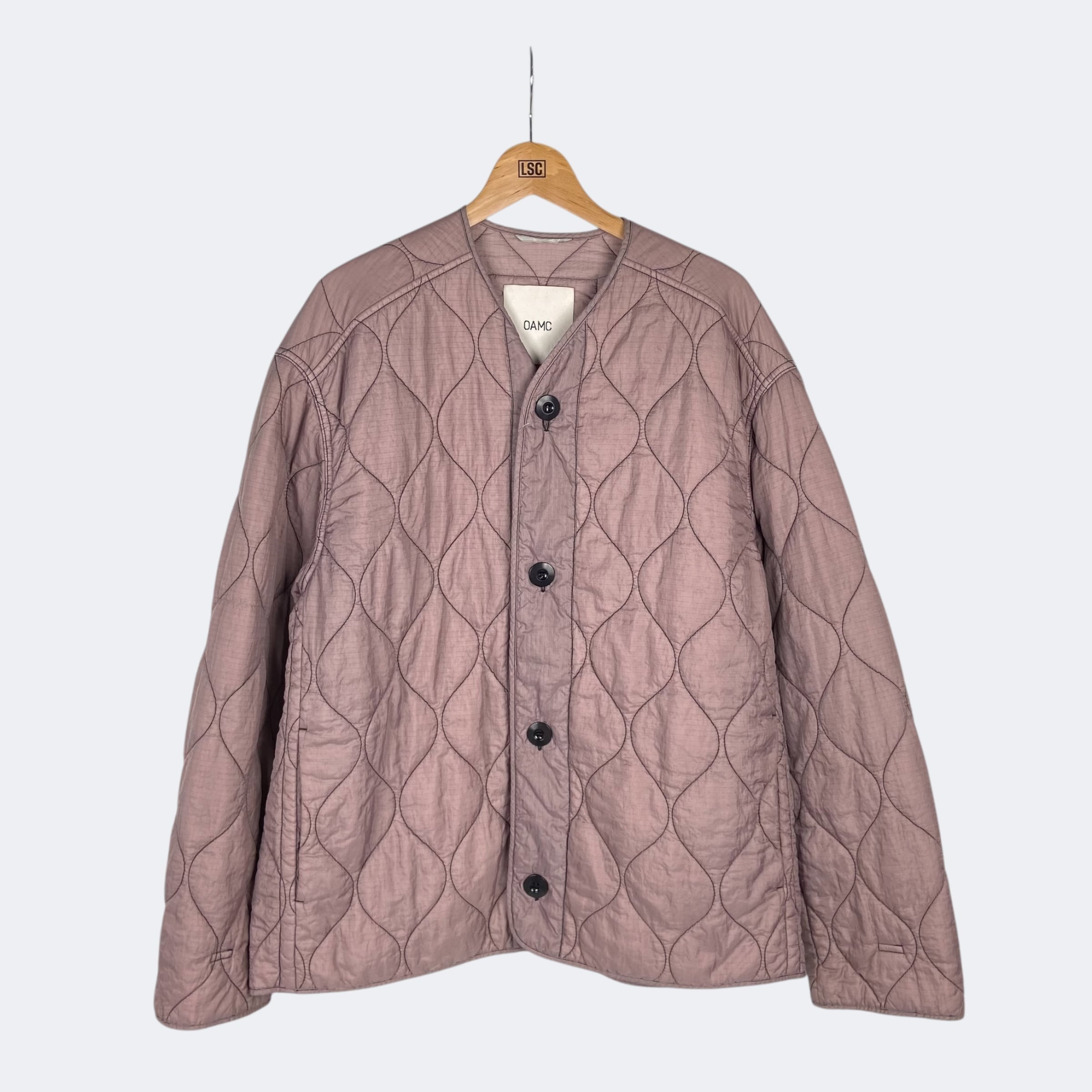 リップストップナイロン生地を使用したOAMCのキルティングジャケットになります。程よい中綿のキルティング仕上げになり、フロントボタンで開閉するノーカラータイプのジャケットです。ステッチラインやデザイン性のあるボタン、バック襟下のパッチなど、細部のディテールまでこだわって仕上げれらています。