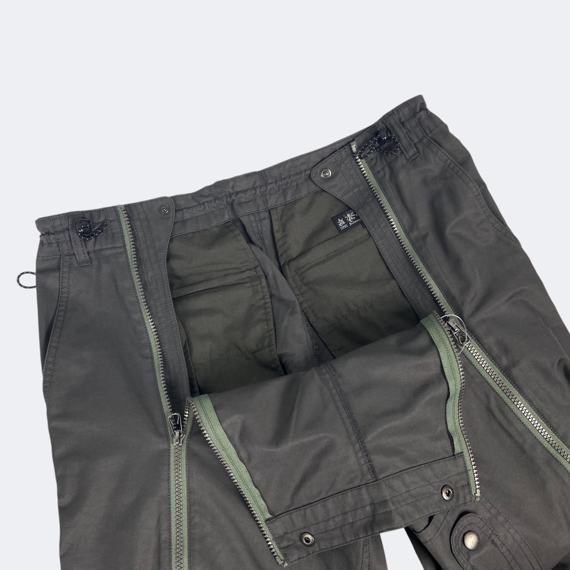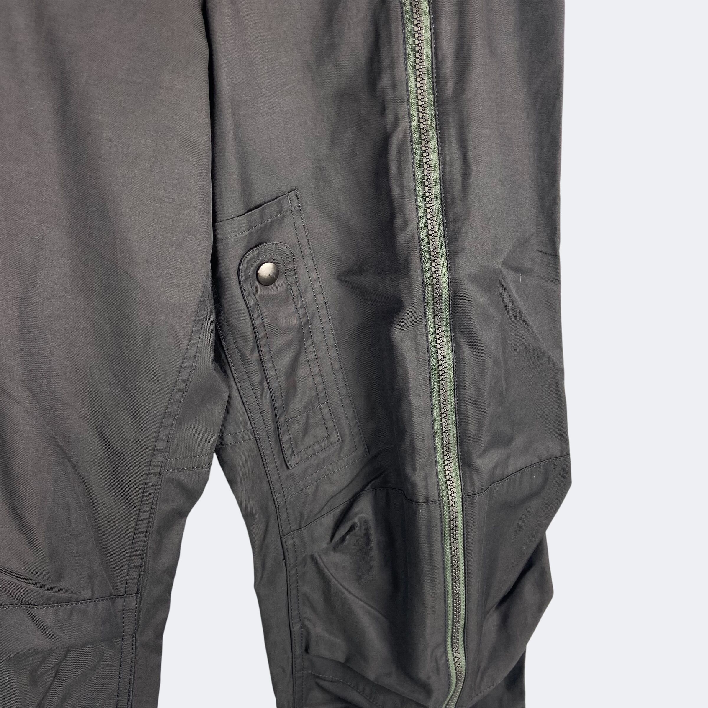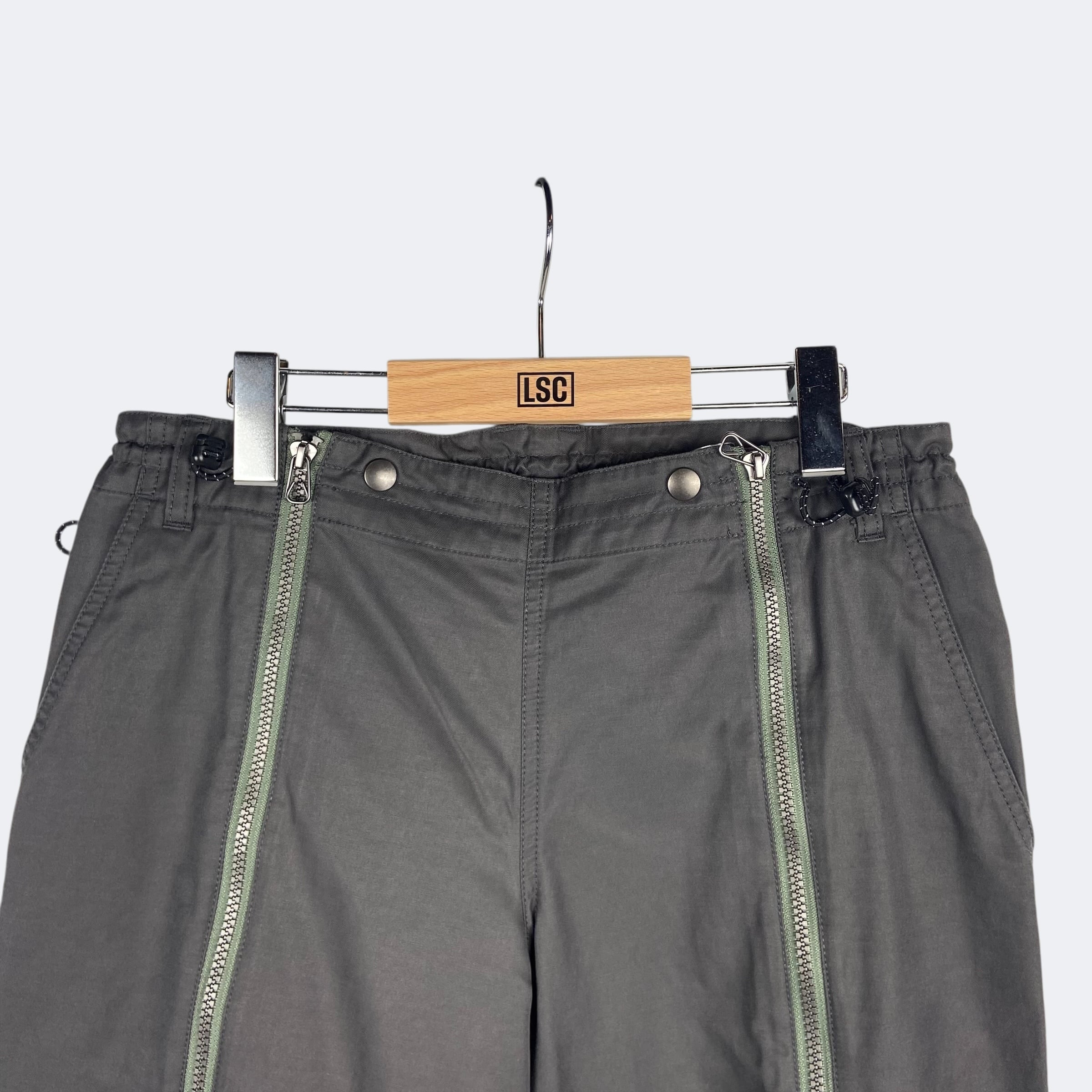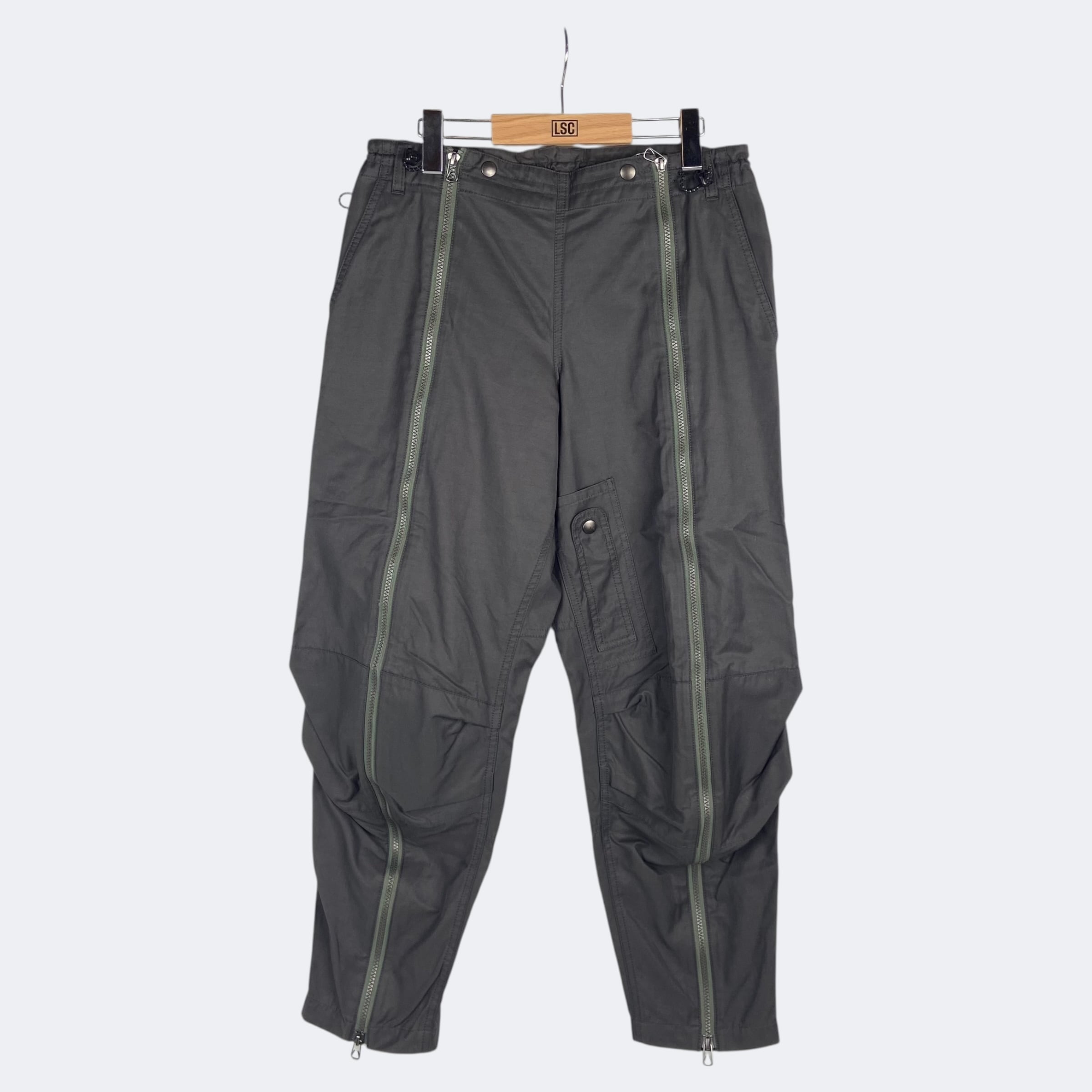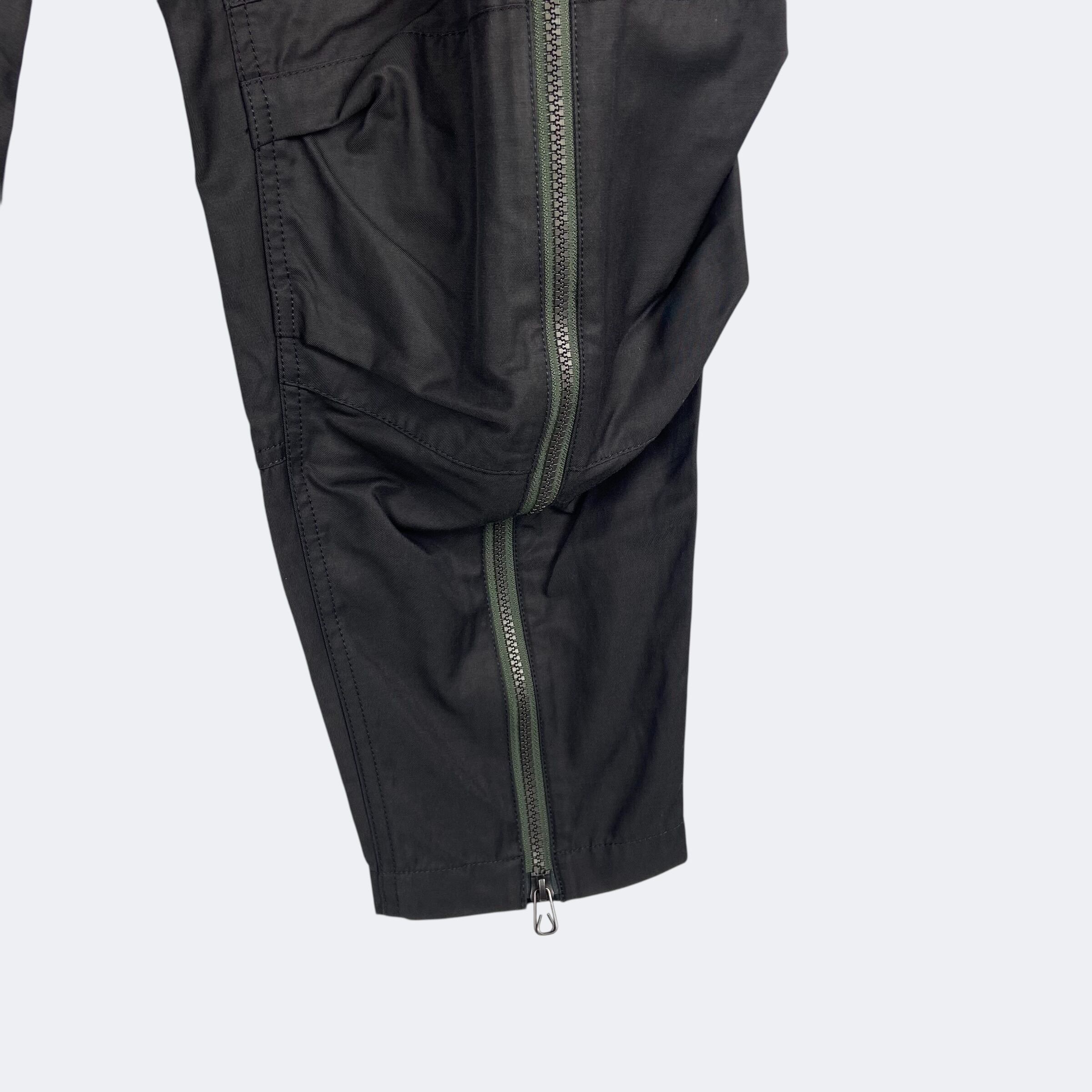 フライトパンツのフロントジップディテールをサンプルしたピーチスキン素材のパンツ。ジップの開閉で着用したままの脱ぎ着が可能。ドローコードウエストとベルトループ。