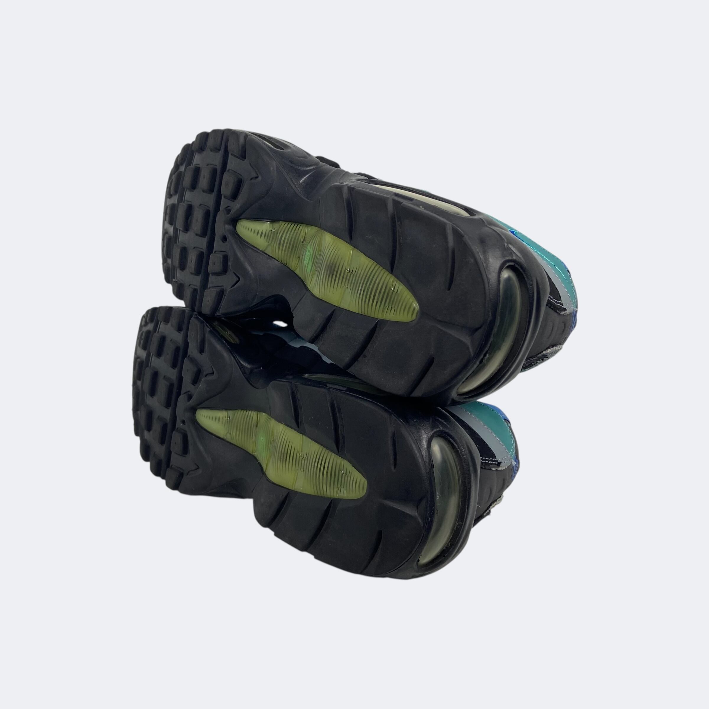 2006年にNYのグラフィティーアーティストの"スタッシュ(STASH)"が手掛けて、爆発的な人気を得た"エアマックス95(314074-401)"を彷彿させるカラーブロッキングとなる当作。ブラックを基本色に置き、サイドのグラデーション部分にはブルー、グリーン、グレーを採用。ソールもブラックを使うことで重厚感あるシルエットになっています。
