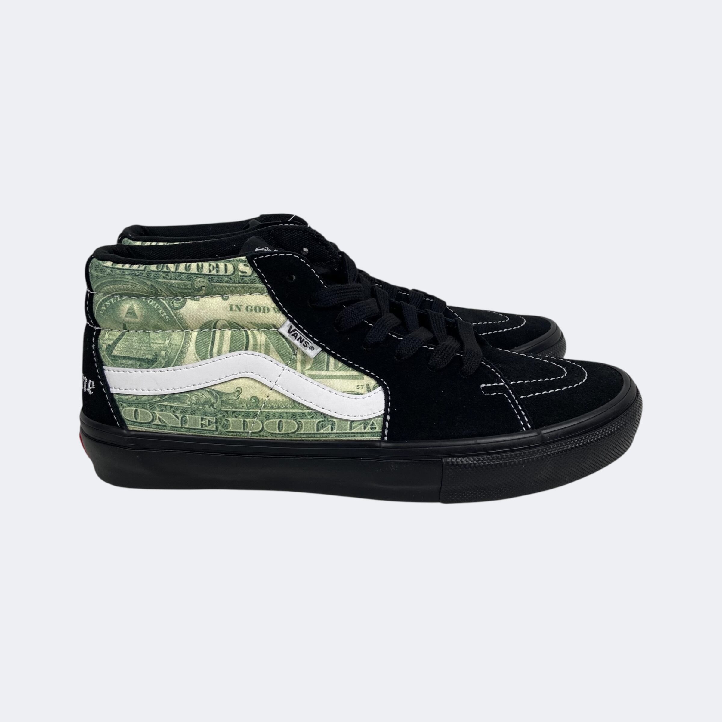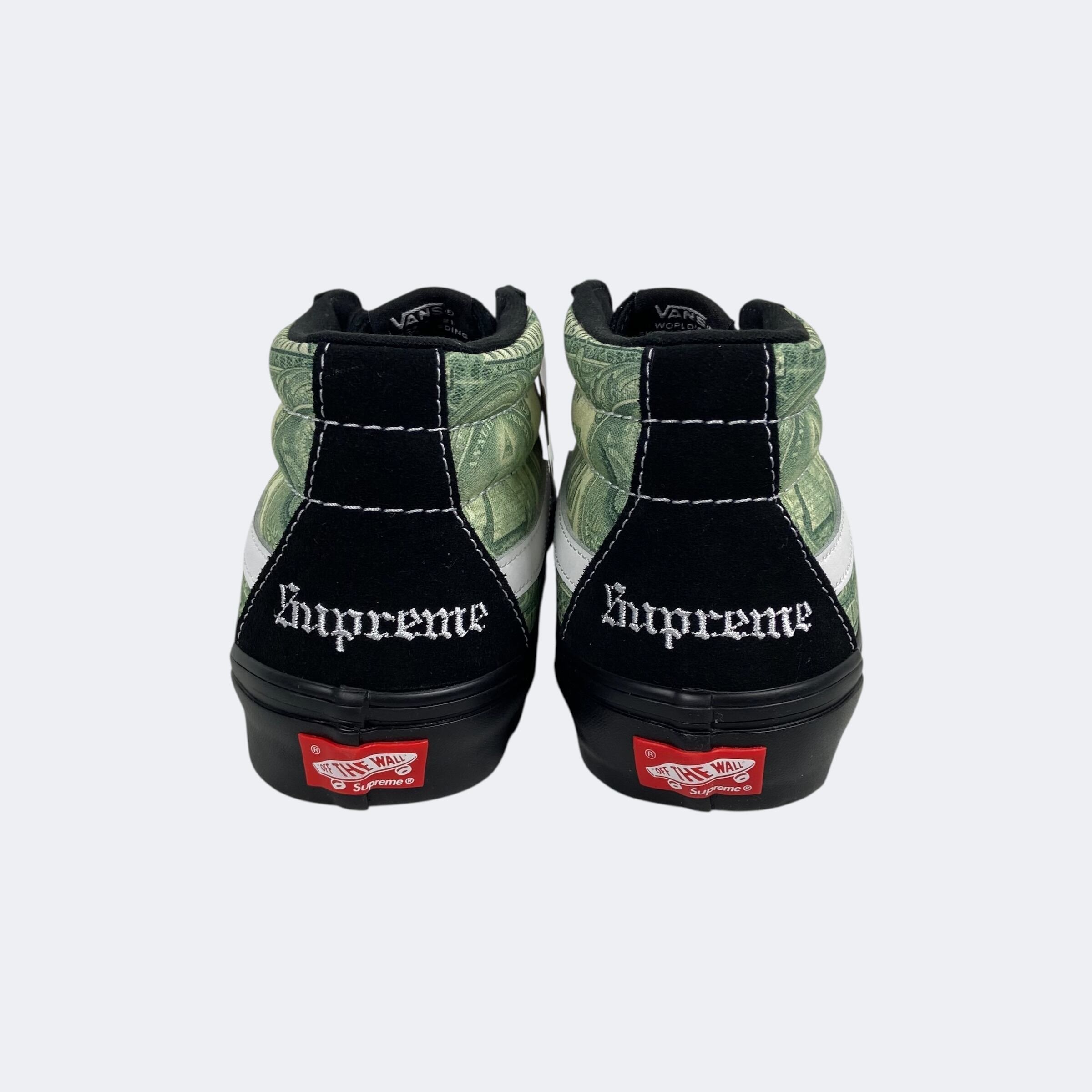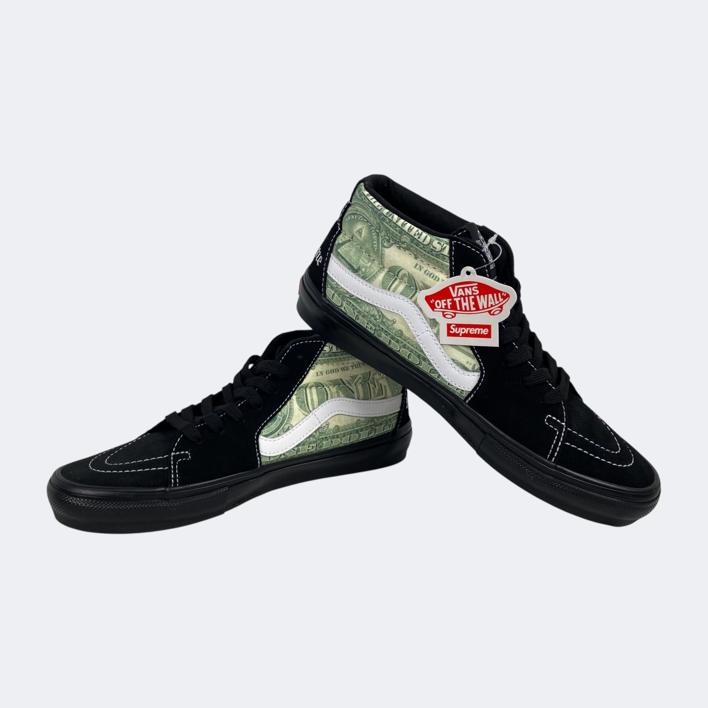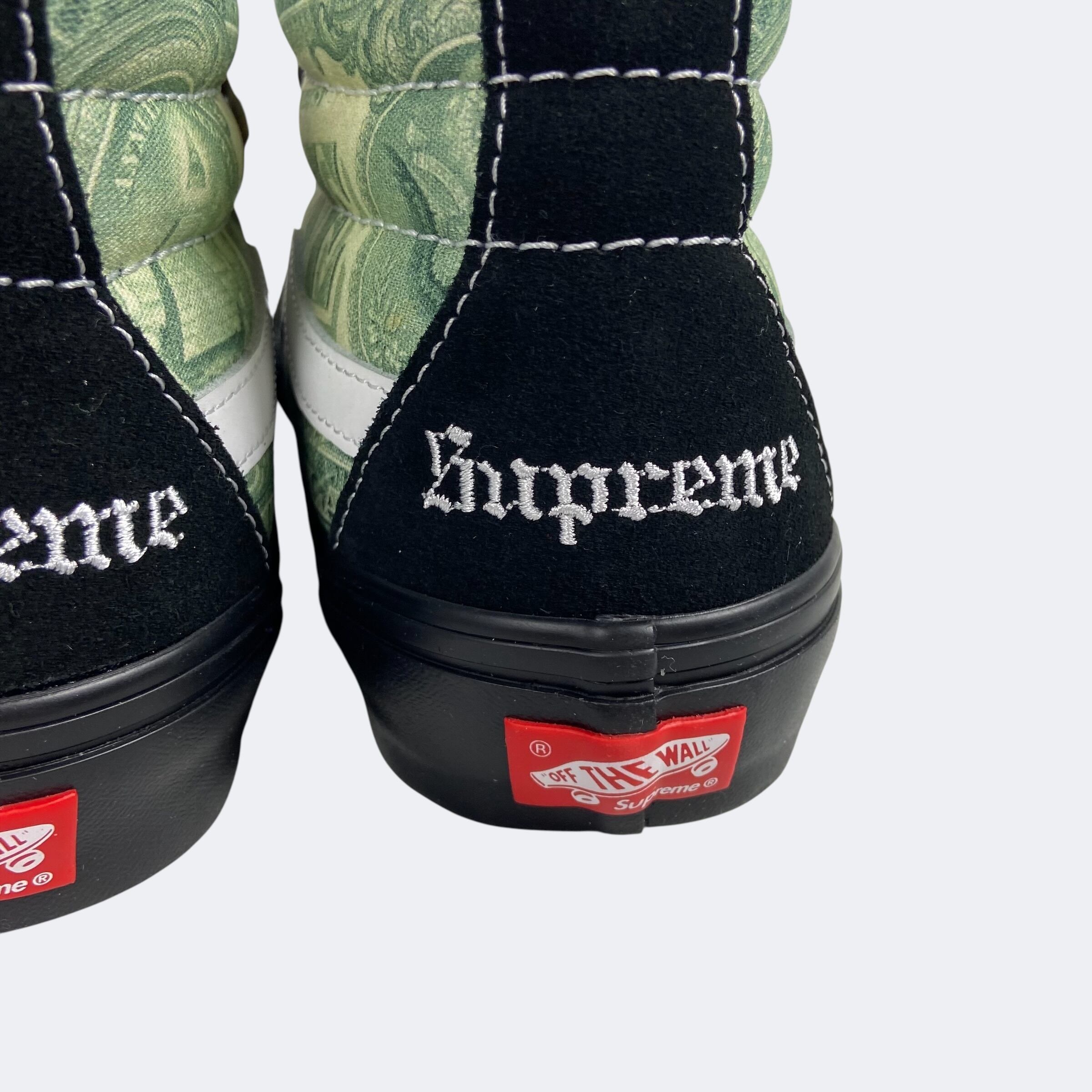 Supreme23S/Sアイテム。恒例のVansとのコラボレーションになり、SK8 Hiのデザインを扱いやすいミッド丈にした故ジェフ・グロッソの追悼モデルの「Skate Grosso Mid」に米1ドル紙幣のグラフィックを落とし込んだデザインになります。ヒール部分にオールドイングリッシュロゴの刺繍が入ります。インソールはプロ仕様のPop Cushを採用しているのでスケート、BMXでも本格使用が可能。