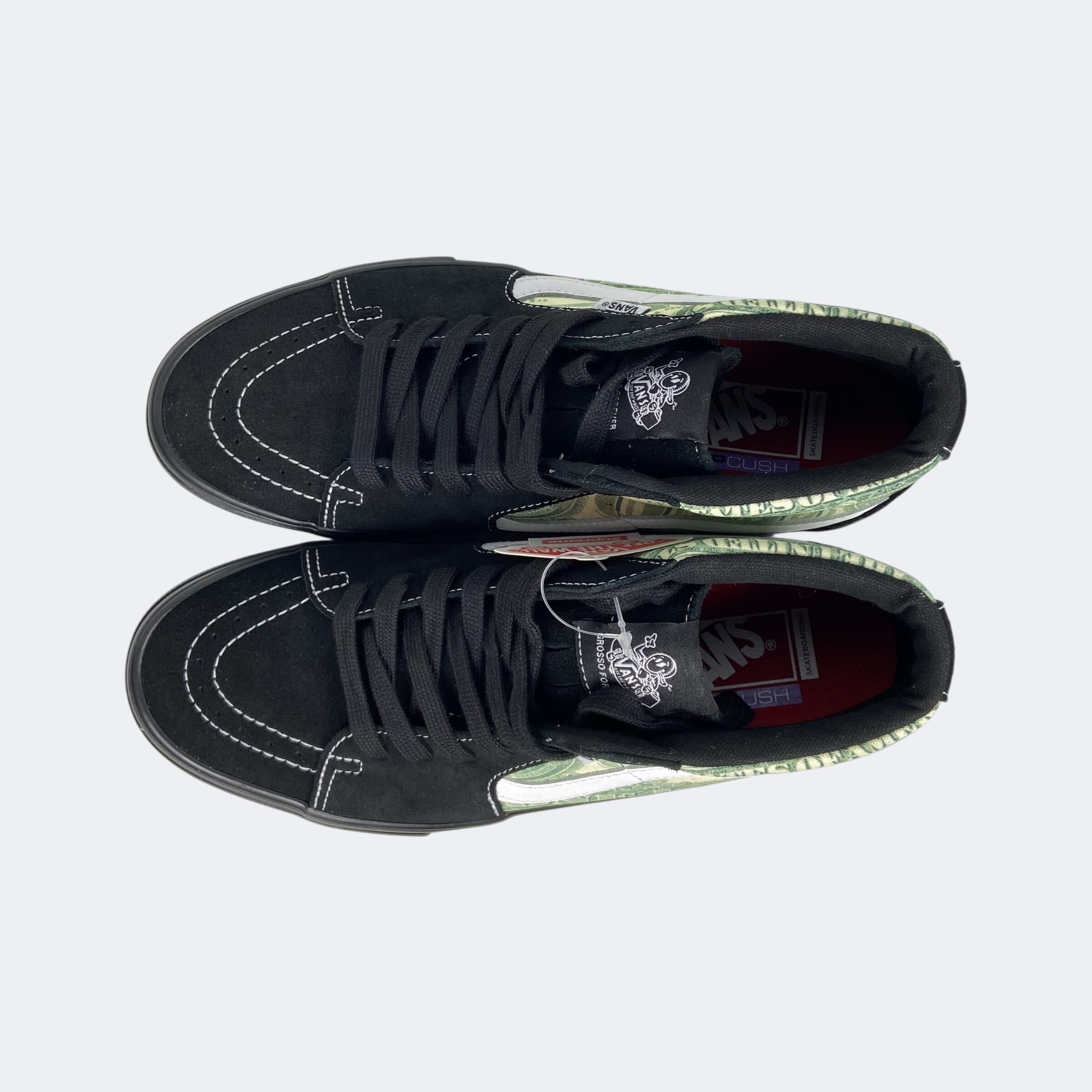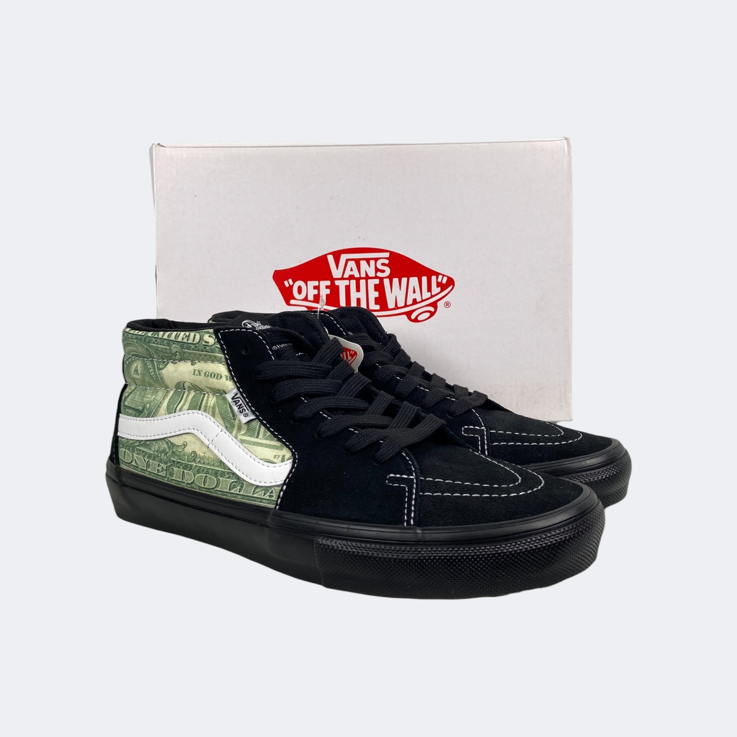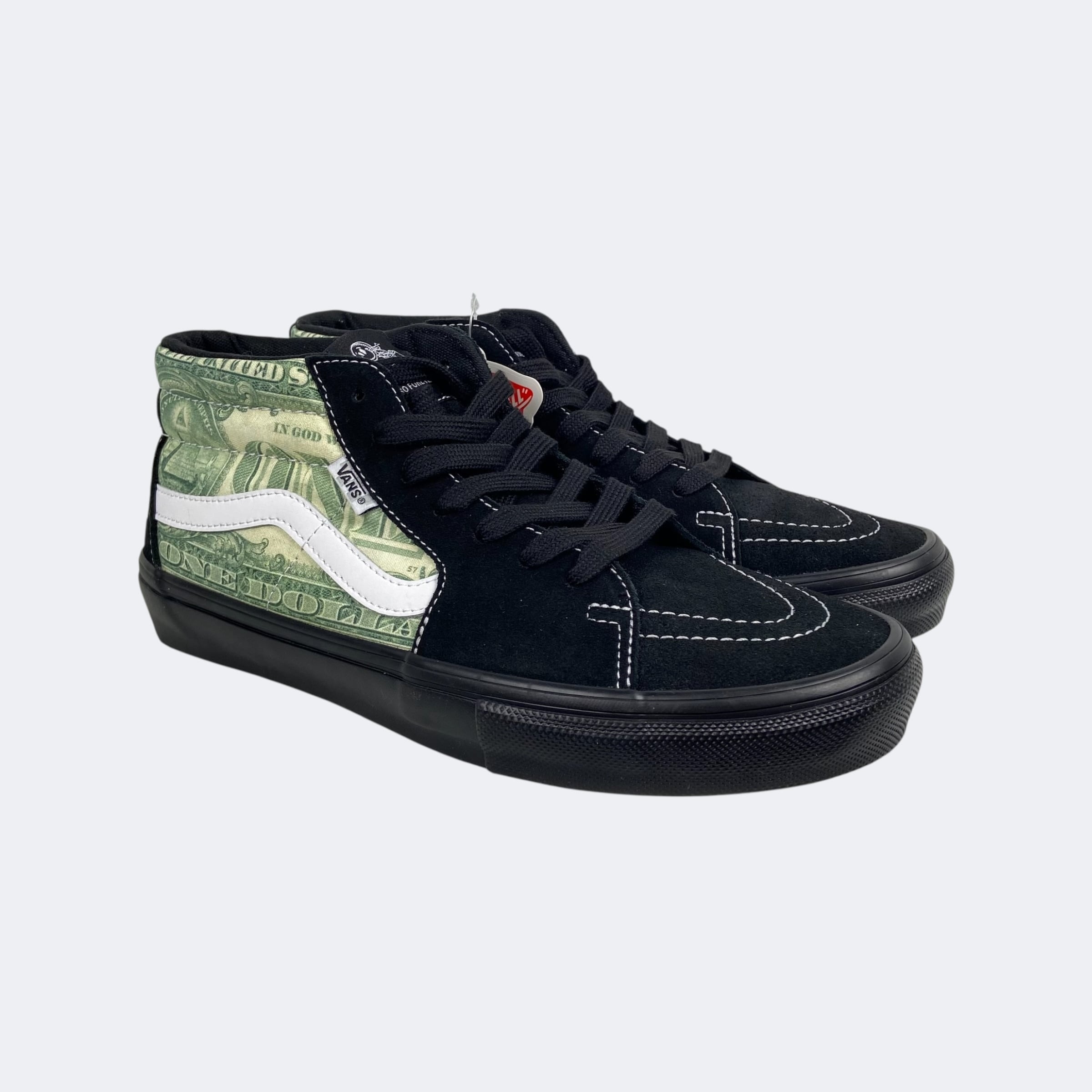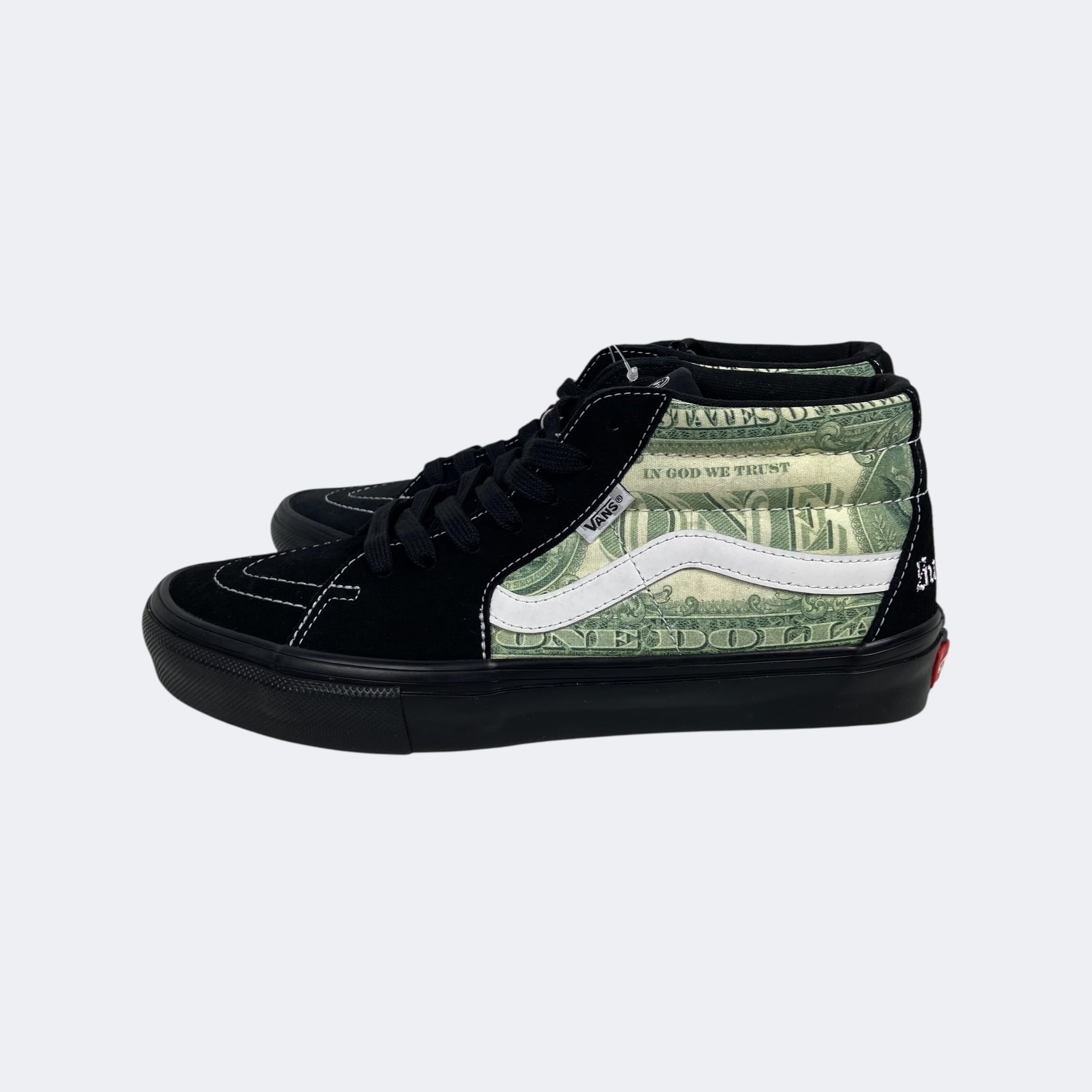 Supreme23S/Sアイテム。恒例のVansとのコラボレーションになり、SK8 Hiのデザインを扱いやすいミッド丈にした故ジェフ・グロッソの追悼モデルの「Skate Grosso Mid」に米1ドル紙幣のグラフィックを落とし込んだデザインになります。ヒール部分にオールドイングリッシュロゴの刺繍が入ります。インソールはプロ仕様のPop Cushを採用しているのでスケート、BMXでも本格使用が可能。