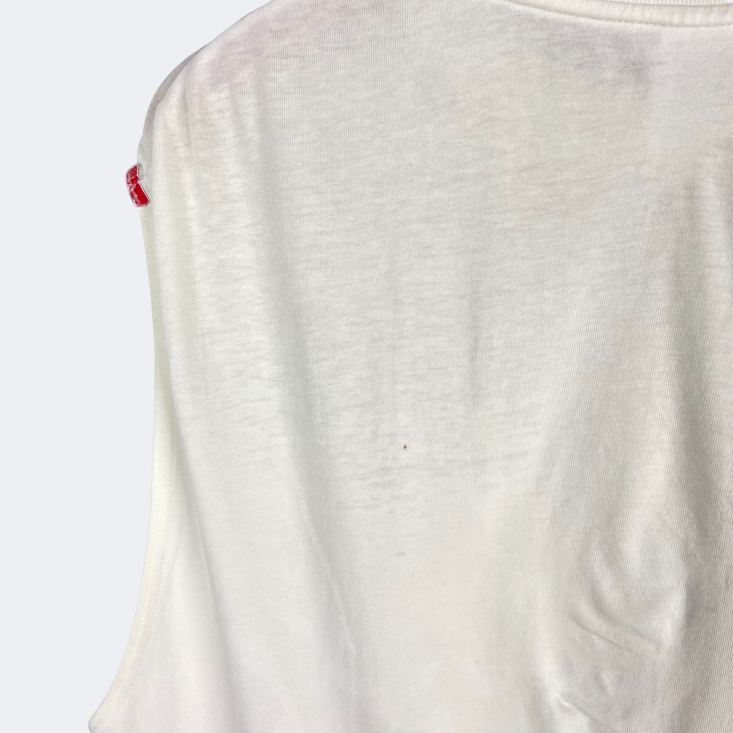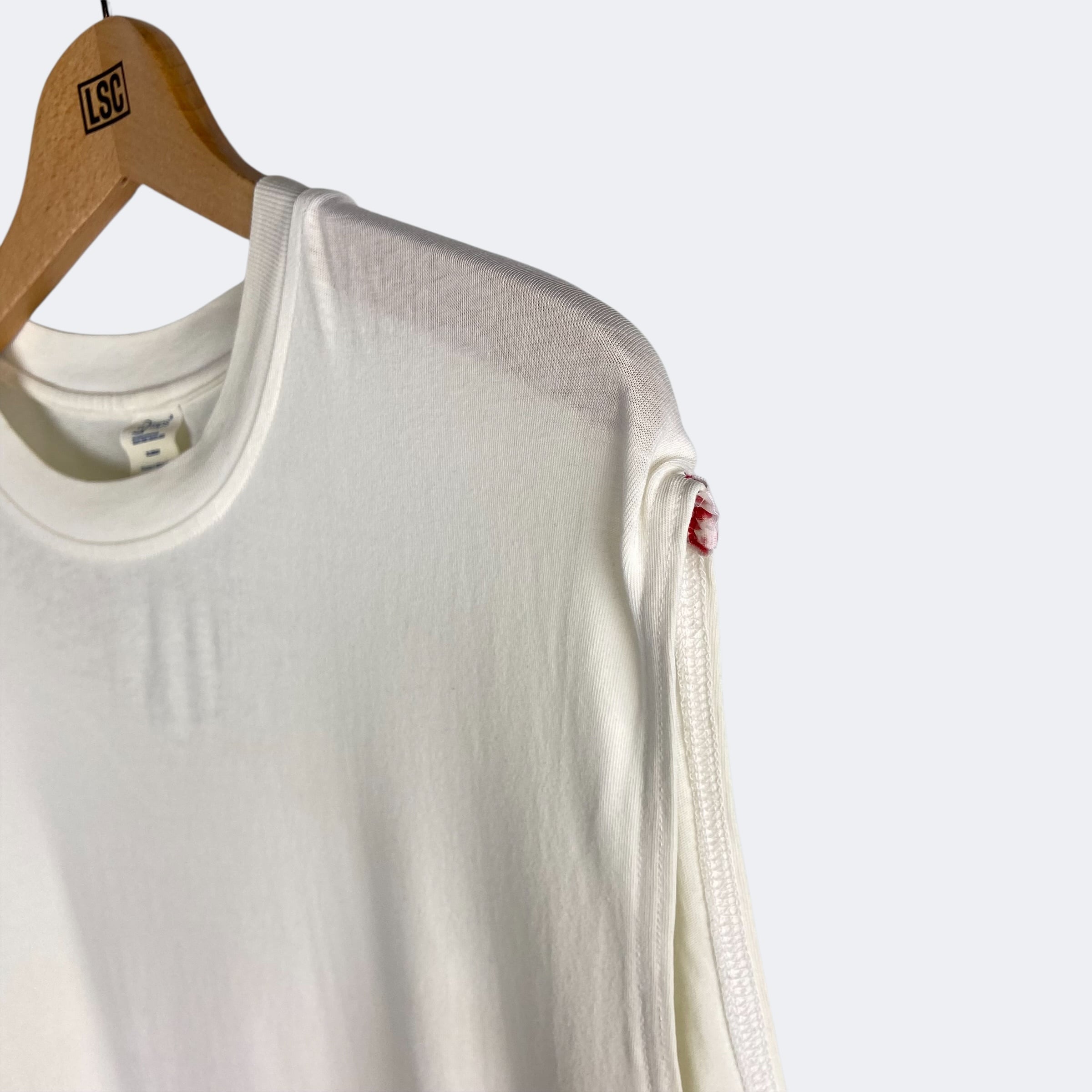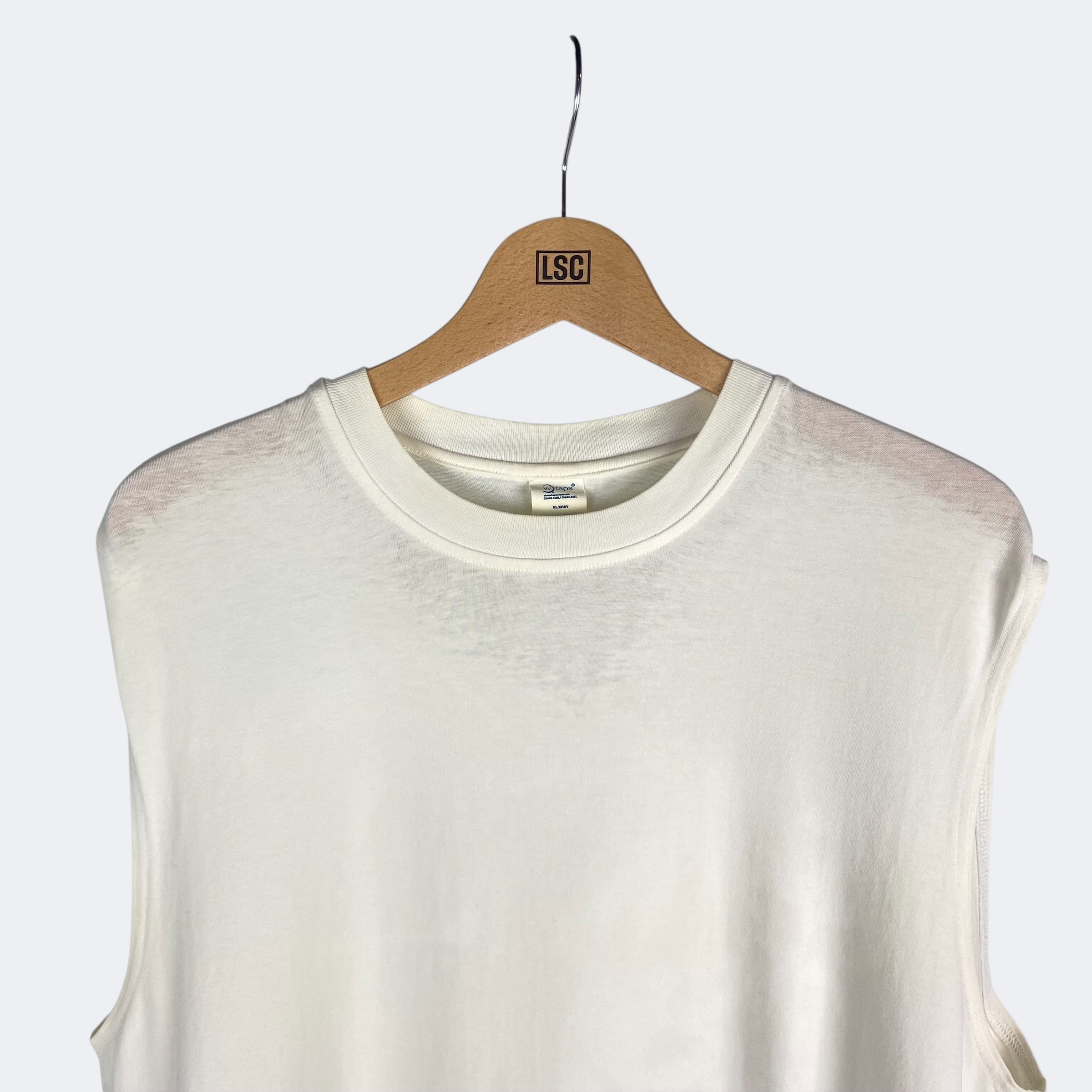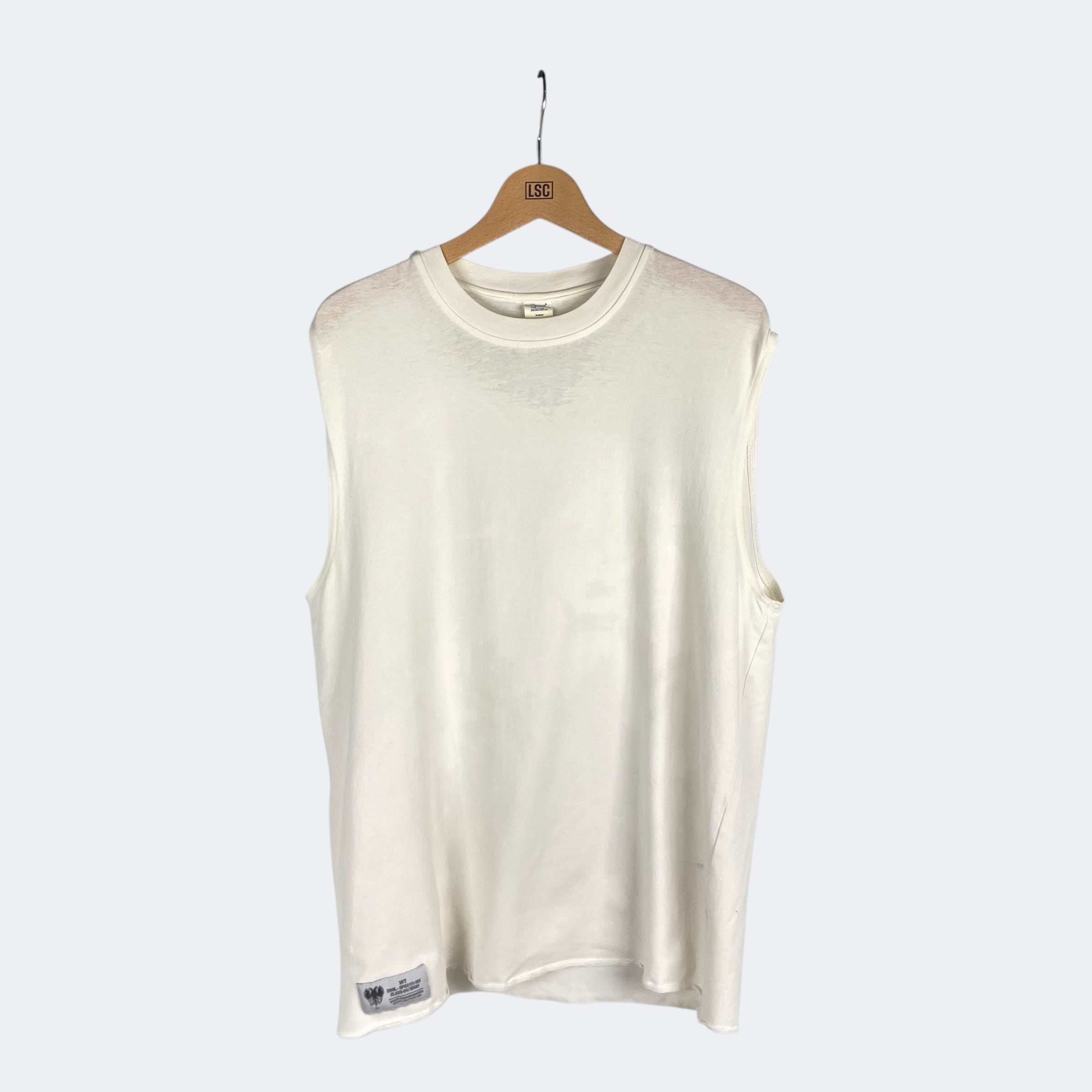 ウレタン混紡のコットン生地を使用したダブルタップスのノースリーブカットソーになります。左袖口部分にはピスネーム、右裾には織りタグが付きます。