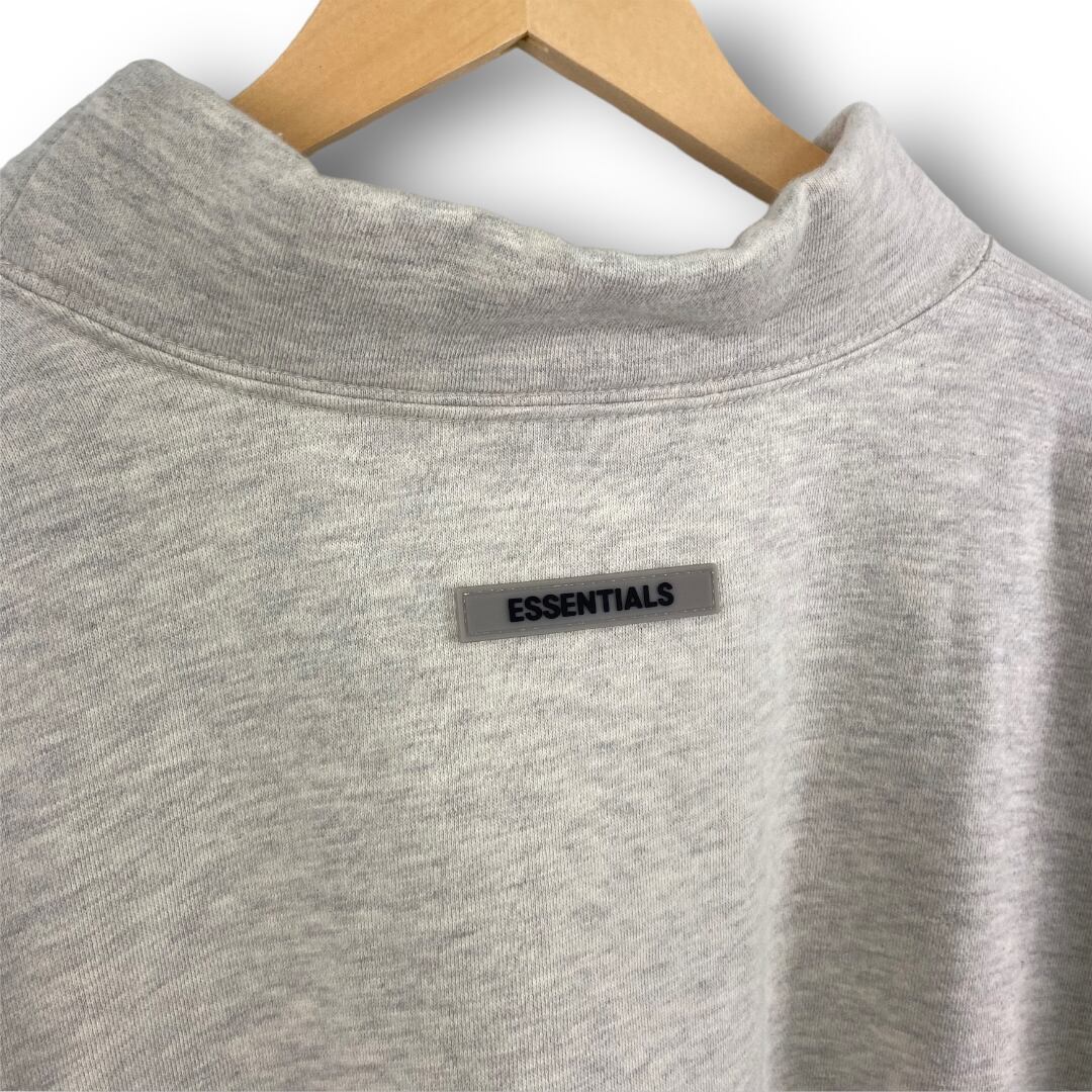 左胸に"ESSENTIALS FEAR OF GOD"のリフレクタープリントが施されたモックネック仕様のスウェット。