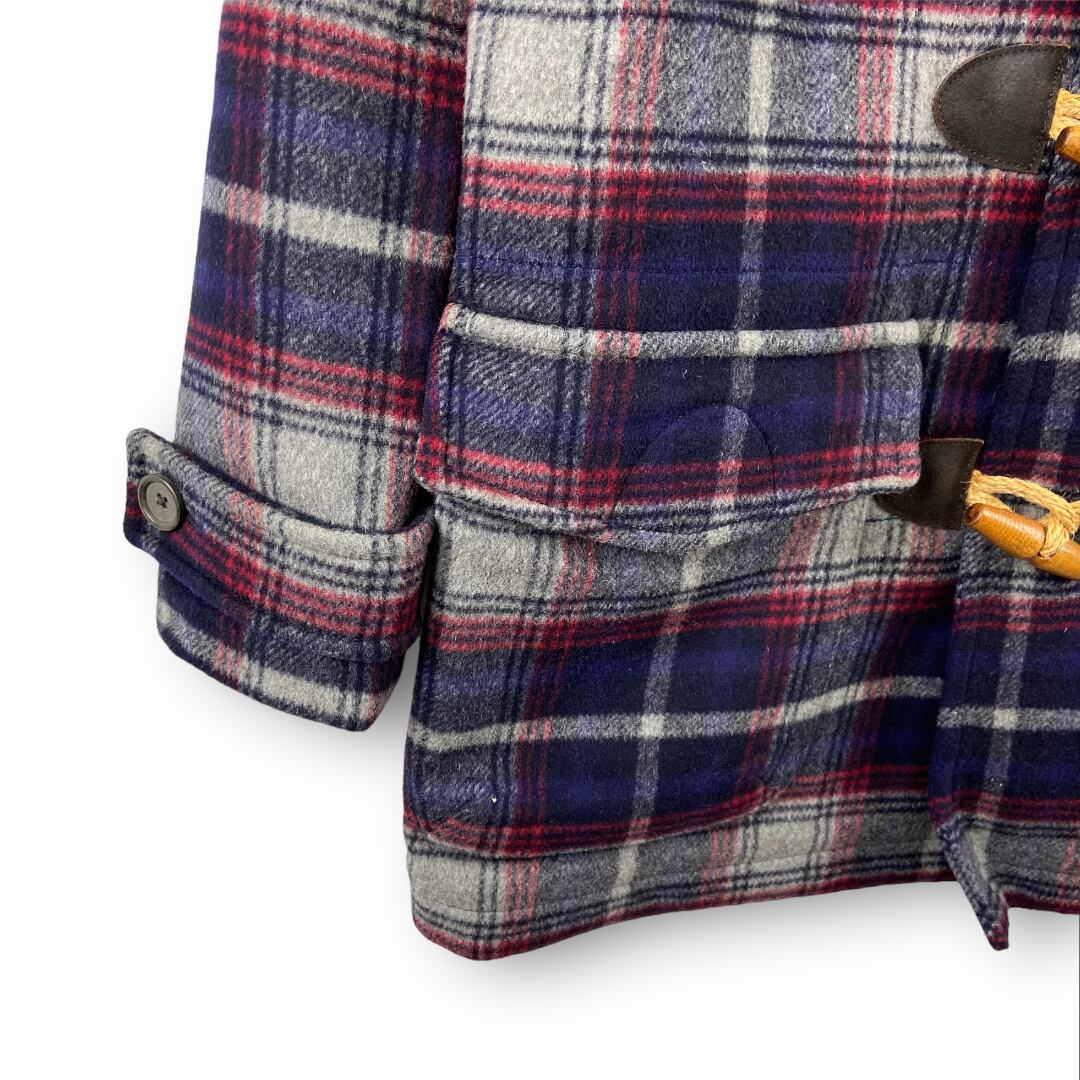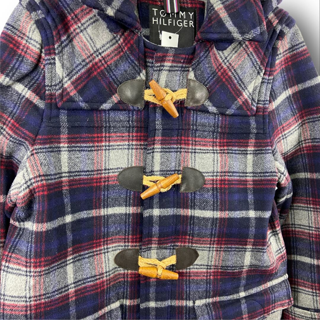 トミーヒルフィガーのダッフルコート。ボディにはチェック柄のメルトン生地が使用されており、前立て部分にはカウレザーが施されています。