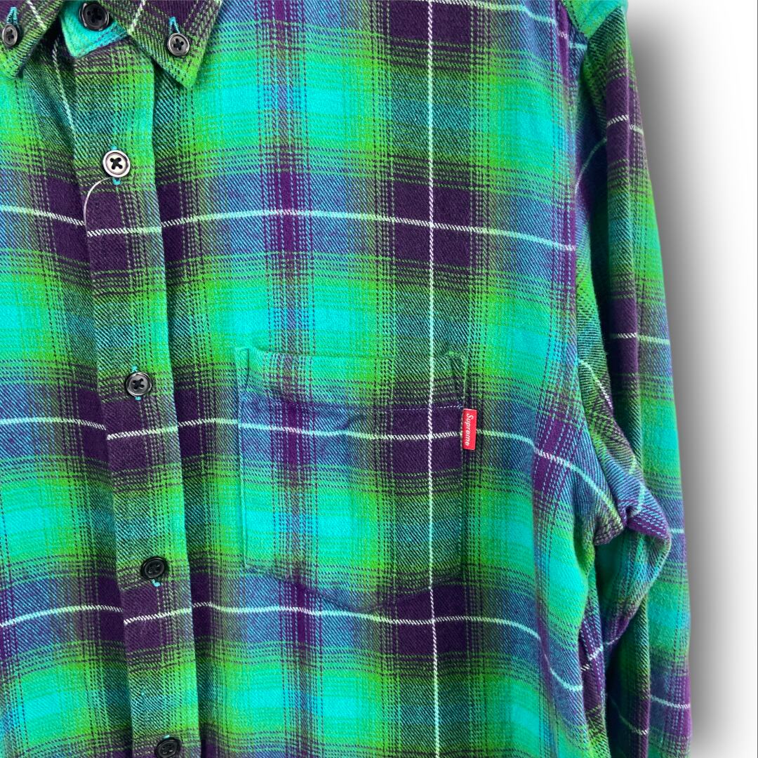 シュプリームのチェック柄が施されたネルシャツ。ボタンダウン仕様になり、胸ポケット脇にはピスネームが付きます。