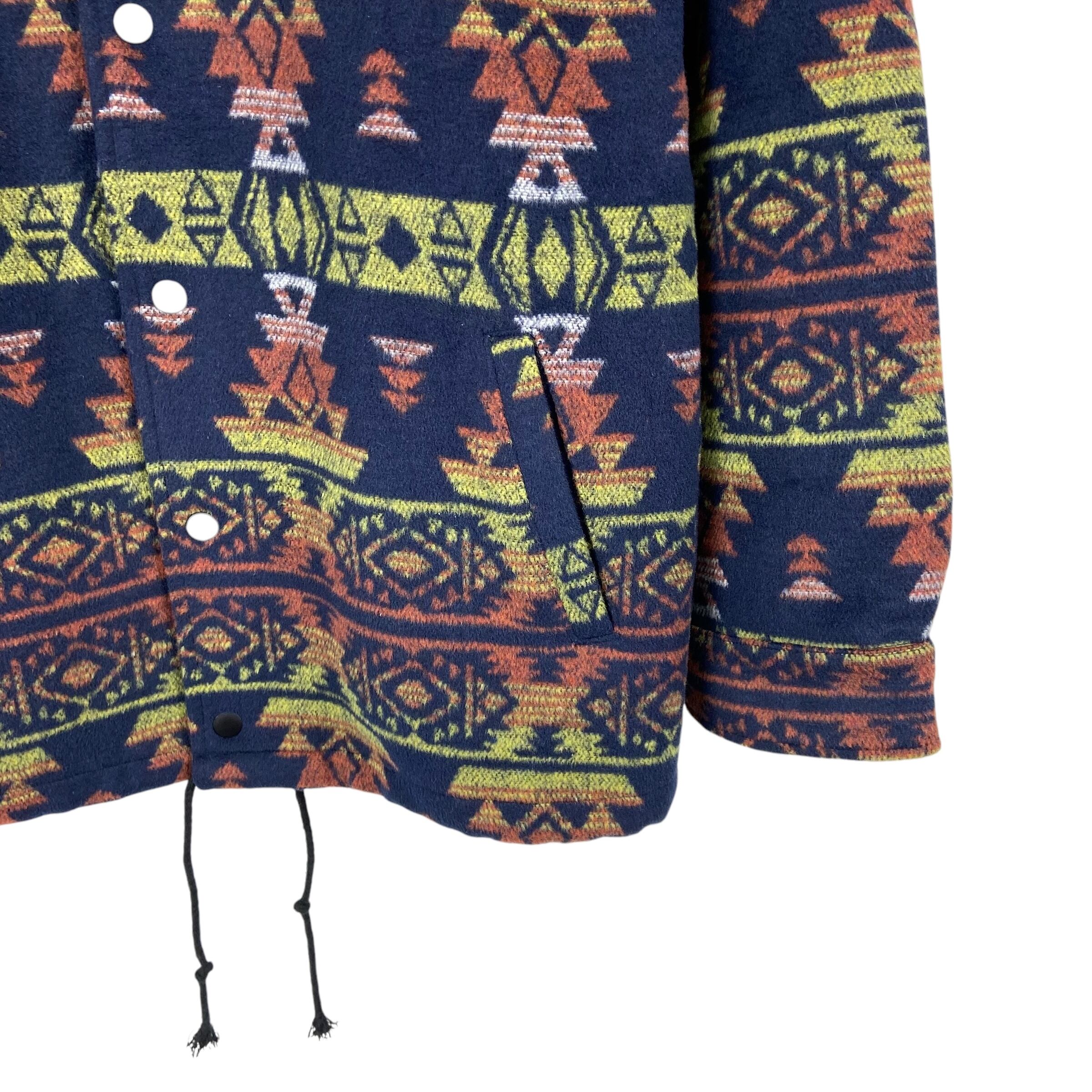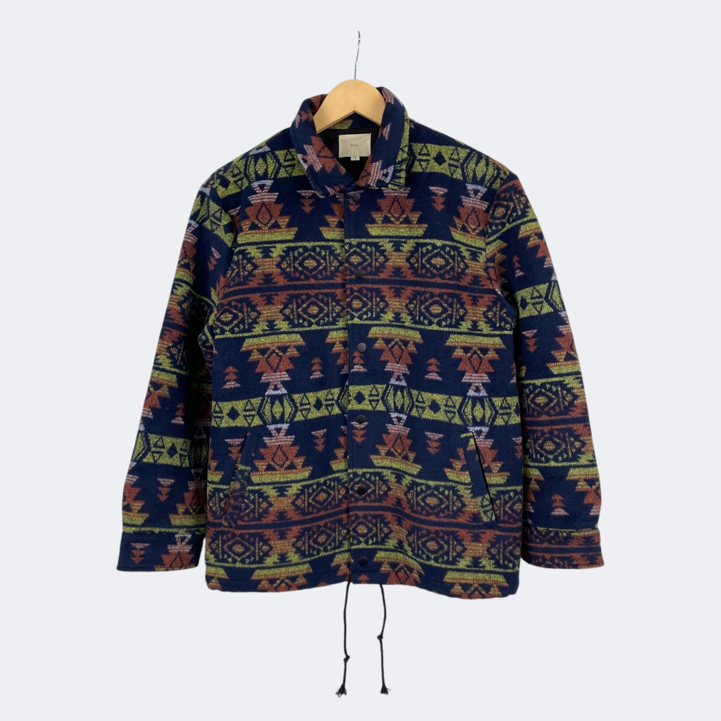 全体にネイティブ柄を施したREVO.のコーチジャケット。起毛した温かみを感じるウール混素材を使用し、防寒性に優れた高級感のある素材になっています。風も通しにくいので防寒性も高められています。